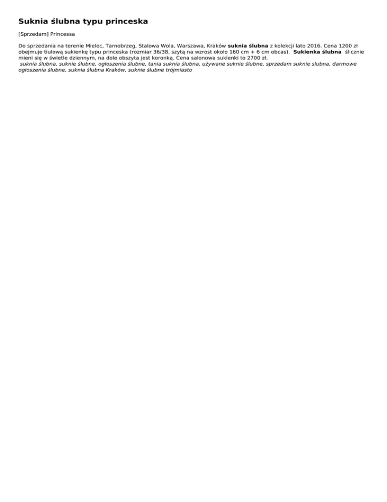 Suknia ślubna typu princeska [Sprzedam] Princessa Do sprzedania na terenie Mielec, Tarnobrzeg, Stalowa Wola, Warszawa, Kraków suknia ślubna z kolekcji lato 2016. Cena 1200 zł obejmuje tiulową sukienkę typu princeska (rozmiar 36/38, szytą na wzrost około 160 cm + 6 cm obcas). Sukienka ślubna ślicznie mieni się w świetle dziennym, na dole obszyta jest koronką. Cena salonowa sukienki to 2700 zł. suknia ślubna, suknie ślubne, ogłoszenia ślubne, tania suknia ślubna, używane suknie ślubne, sprzedam suknie slubna, darmowe ogłoszenia ślubne, suknia ślubna Kraków, suknie ślubne trójmiasto Informacje dodatkowe Ilość 1 Stan Używany Adres ogłoszenia http://todoslubu.pl/suknia-slubna-typu-princeska,o269 Kontakt Mail: [email protected] Telefon: Lokalizacja , Stalowa Wola Podkarpackie (Polska) Ogłoszenie dodano: 2016-10-29 14:24:59 Ogłoszenie wygasa: 2018-02-26 14:24:59 Powered by TCPDF (www.tcpdf.org)