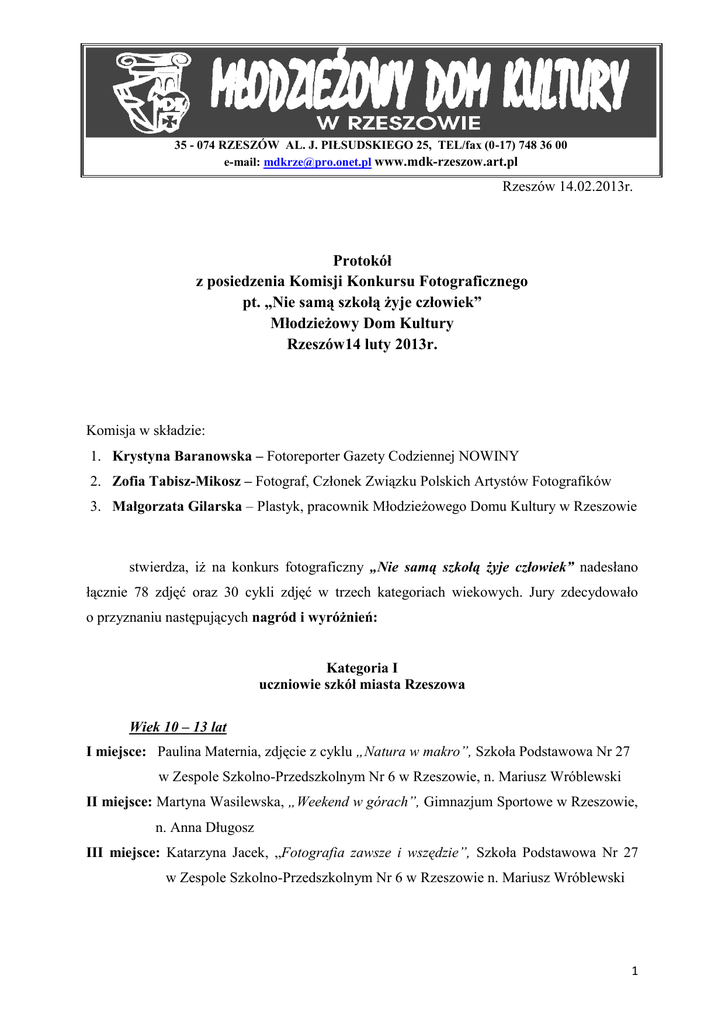 35 - 074 RZESZÓW AL. J. PIŁSUDSKIEGO 25, TEL/fax (0-17) 748 36 00 e-mail: [email protected] www.mdk-rzeszow.art.pl Rzeszów 14.02.2013r. Protokół z posiedzenia Komisji Konkursu Fotograficznego pt. „Nie samą szkołą żyje człowiek” Młodzieżowy Dom Kultury Rzeszów14 luty 2013r. Komisja w składzie: 1. Krystyna Baranowska – Fotoreporter Gazety Codziennej NOWINY 2. Zofia Tabisz-Mikosz – Fotograf, Członek Związku Polskich Artystów Fotografików 3. Małgorzata Gilarska – Plastyk, pracownik Młodzieżowego Domu Kultury w Rzeszowie stwierdza, iż na konkurs fotograficzny „Nie samą szkołą żyje człowiek” nadesłano łącznie 78 zdjęć oraz 30 cykli zdjęć w trzech kategoriach wiekowych. Jury zdecydowało o przyznaniu następujących nagród i wyróżnień: Kategoria I uczniowie szkół miasta Rzeszowa Wiek 10 – 13 lat I miejsce: Paulina Maternia, zdjęcie z cyklu „Natura w makro”, Szkoła Podstawowa Nr 27 w Zespole Szkolno-Przedszkolnym Nr 6 w Rzeszowie, n. Mariusz Wróblewski II miejsce: Martyna Wasilewska, „Weekend w górach”, Gimnazjum Sportowe w Rzeszowie, n. Anna Długosz III miejsce: Katarzyna Jacek, „Fotografia zawsze i wszędzie”, Szkoła Podstawowa Nr 27 w Zespole Szkolno-Przedszkolnym Nr 6 w Rzeszowie n. Mariusz Wróblewski 1 Wiek 14 – 16 lat I miejsce: Martyna Ostrówka, III Liceum Ogólnokształcące w Rzeszowie, n. Wiesław Pyzia II miejsce: Klaudia Szyszka, „Taniec – sposób na życie”, III Liceum Ogólnokształcące w Rzeszowie, n. Wiesław Pyzia III miejsce: Katarzyna Borkowska, cykl: „Więzy teatru”, Gimnazjum im. Jana Pawła II Sióstr Prezentek w Rzeszowie, n. Małgorzata Cup Wyróżnienie: Paulina Gołąbek, „Psi przyjaciel”, V Liceum Ogólnokształcące w Rzeszowie, n. Anna Długosz Wyróżnienie: Krzysztof Pasternak, „Dwa oblicza sztuki”, III Liceum Ogólnokształcące w Rzeszowie, n. Wiesław Pyzia Wiek 17 – 19 lat I nagroda: Mateusz Janusz, cykl pt.: „Sztuka wyobraźni”, II Liceum Ogólnokształcące w Rzeszowie, n. Mariusz Baran II nagroda: Aleksandra Fluda, zdjęcie z cyklu „Dom”, III Liceum Ogólnokształcące w Rzeszowie, n. Wiesław Pyzia III nagroda: Dominika Wilk, „Za zwycięstwo”, II Liceum Ogólnokształcące w Rzeszowie, n. Mariusz Baran Wyróżnienie: Dominika Wilk, „W bezruchu”, II Liceum Ogólnokształcące w Rzeszowie, n. Mariusz Baran Wyróżnienie: Dominika Wilk, zdjęcie z cyklu pt.: „Tunezja sześć na sześć”, II Liceum Ogólnokształcące w Rzeszowie, n. Mariusz Baran Kategoria II Wychowankowie Placówek Wychowania Pozaszkolnego województwa podkarpackiego Wiek 10 – 13 lat I miejsce: Bartosz Rułka, cykl pt.: „Ja i moje stroje wyjściowe”, Młodzieżowy Dom Kultury w Rzeszowie, n. Dominika Mróz-Toton II miejsce: Adam Piechowiak, zdjęcie z cyklu pt.: „Martwa natura”, Młodzieżowy Dom Kultury w Rzeszowie, n. Dominika Mróz-Toton Wyróżnienie: Bartosz Błąd, „Martwa Natura”, Młodzieżowy Dom Kultury w Rzeszowie, n. Dominika Mróz-Toton 2 Wiek 14 – 16 lat I miejsce: Natalia Godek, „Poeci rodzą się wszędzie”, Gminny Ośrodek Kultury, Frysztak II miejsce: Dawid Kruk, „Bieszczadzki pejzaż”, Młodzieżowy Dom Kultury w Rzeszowie, n. Dominika Mróz-Toton Wiek 17 – 19 lat I miejsce: Katarzyna Machowicz, Młodzieżowy Dom Kultury w Jaśle, n. Dariusz Tęcza II miejsce: Angelika Marzec, cykl pt.: „Szara godzina”, Młodzieżowy Dom Kultury w Rzeszowie, n. Dominika Mróz-Toton Do wystawy Jury postanowiło zakwalifikować prace ze szkół i placówek: 1. Szkoła Podstawowa Nr 4 w Rzeszowie, n. Maria Urbanik - Patrycja Domańska, zdjęcie z cyklu „Gdzie one się podziały”, 2. Szkoła Podstawowa Nr 27 w Zespole Szkolno-Przedszkolnym Nr 6 w Rzeszowie, n. Mariusz Wróblewski - Paulina Maternia, zdjęcie z cyklu „Natura w makro”, 3. Gimnazjum Sportowe w Rzeszowie, n. Anna Długosz - Martyna Wasilewska, „W jaskini lodowej”, cykl: „Weekend w górach”, 4. Gimnazjum Nr 8 w Rzeszowie, n. Tomasz Gajdek - Paulina Rogala, „Jabłko w śniegu”, „Zielona otchłań”, „Słoneczny prześwit”, - Marcin Wrona, „Szkic”, 5. Gimnazjum Nr 10 w Rzeszowie, n. Anna Patrzyk - Michał Zarzycki, „W śniegu stoi i zimy się nie boi”, „Nadzieja na miłość”, „Ostatni taniec”, - Wiktoria Duś, „Wspomnienie wakacji”, cykl: „Listopadowy Paryż” 6. Zespół Szkół Nr 4 w Rzeszowie, n. Maria Urbanik - Klaudia Świder, „Czyżbym miała koronę”, - Olga Pustelniak, „Okno na Tatry”, „Łabędź nad lazurowym wybrzeżem”, „Dom nad rozlewiskiem”, 7. Zespół Szkół Nr 5 w Rzeszowie, n. Romuald Różański - Lidia Samborska, cykl „Wszystko przemija”, „Nie zapomnisz…”, 8. II Liceum Ogólnokształcące w Rzeszowie, n. Mariusz Baran - Dominika Wilk, „Koło fortuny”, „Po świecie z analogiem”, zdjęcia z cyklu pt. „Tunezja sześć na sześć”, - Mateusz Janusz, cykl pt: „Pocztówka z wakacji”, 3 9. III Liceum Ogólnokształcące w Rzeszowie, n. Wiesław Pyzia - Aleksandra Fluda, zdjęcie z cyklu „Dom”, - Karolina Grzesik, „Przyjaźń”, - Klaudia Szyszka, „Strunowy poemat”, - Anna Welc, „Na skraju tożsamości (nie) zwykłej kobiety”, - Magdalena Kozak, „Książki moją pasją”, - Anna Panek, „Sport życiowa pasją”, - Anna Majewska, „Akrobacje w powietrzu”, - Martyna Ostrówka, 10. V Liceum Ogólnokształcące w Rzeszowie, n. Anna Długosz - Paulina Gołąbek, „W siodle”, 11. VI Liceum Ogólnokształcące w Rzeszowie, n. Paweł Olearka - Joanna Bury, „Fashion”, „Portret”, 12. Zespół Szkół Muzycznych Nr 1 w Rzeszowie, n. Rafał Mazur - Izabela Baran „Życie to nie tylko szkoła, to także …psja”, 13. Zespół Szkół Elektronicznych w Rzeszowie, n. Grzegorz Wójcik - Albert Żmuda, „Ach ten zakręt”, 14. Gminny Ośrodek Kultury we Frysztaku - Natalia Godek „Miło poszaleć w porę”, 15. Gminny Ośrodek Kultury w Lubeni, n. Sławomir For