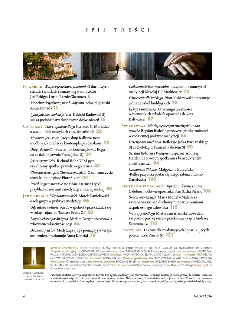 S P I S Otwarcie Wszyscy jesteśmy trymerami O duchowych sterach i wiosłach rozmawiają słynny aktor Jeff Bridges i roshi Bernie Glassman 6 Moc chrześcijaństwa, moc buddyzmu odnajduje roshi Koun Yamada 12 T R E Ś C I Codzienność jest wszystkim przypomina nauczyciel medytacji Mikołaj Uji Markiewicz 74 Oświecenie dla każdego Piotr Kubiszewski prezentuje jedną ze szkół buddyjskich 78 Lekcje z uważności O treningu uważności w niemieckich szkołach opowiada dr Vera Kaltwasser 82 Ignacjańskie rekolekcje i zen Kakichi Kadowaki SJ szuka podobieństw duchowych doświadczeń 16 Co to jest Trzy stopnie do Boga Kyriacos C. Markides o wschodnich mistykach chrześcijańskich 22 Modlitwa Jezusowa Arcybiskup Kallistos uczy modlitwy, która łączy kontemplację i działanie 28 Droga do modlitwy serca Jak kontemplować Boga na co dzień ujawnia Franz Jalics SJ 34 Jezus wyzwoliciel Richard Rohr OFM pyta, czy chcemy spotkać prawdziwego Jezusa 40 Chrystus wewnątrz, Chrystus wszędzie O centrum życia chrześcijanina pisze Piotr Sikora 44 Przed Bogiem na wiele sposobów Dariusz Hybel przybliża różne nurty medytacji chrześcijańskiej 50 Jak to działa Wspólnota miłości Marek Danielewski o roli grupy w praktyce medytacji 56 Gdy niknie wolność Kiedy wspólnota przekształca się w sektę – ujawnia Tomasz Franc OP 60 Łagodniejszy sposób bycia Miriam Berger przedstawia zdrowotne właściwości jogi 64 Do zmiany siebie Medytacja i joga pomagają w terapii uzależnień, przekonuje Anna Konefał 70 Świadectwa Nie daj się niczym zniechęcić – nada te turbe Bogdan Białek o przezwyciężaniu trudności w codziennej praktyce medytacji 86 Dziesięć dni słuchania Refleksje Jacka Poznańskiego SJ z rekolekcji z Franzem Jalicsem SJ 90 Sesshin Rohatsu z Willigisem Jägerem Andrzej Harden SJ o swoim spotkaniu z benedyktynem i mistrzem zen 94 Czekam na Shlomo Małgorzata Burzyńska-Keller przybliża postać słynnego rabina Shlomo Carlebacha 100 Spotkanie w dialogu Poprzez milczenie i mowę O dobrej modlitwie opowiada rabin Sacha Pecaric 106 Święci niewierzący Maria Moneta-Malewska zastanawia się nad duchowymi poszukiwaniami współczesnego człowieka 112 Wracając do Boga Mistycyzm islamski może dziś zaspokoić pustkę serca – przekonuje szajch Andrzej Saramowicz 118 Czytelnia Lektury dla medytujących i poszukujących poleca Jacek Prusak SJ 121 Style i Charaktery adres redakcji: 25-502 Kielce, ul. Paderewskiego 40, tel. 41 343 28 44, [email protected] Zespół redakcyjny: BOGDAN BIAŁEK – redaktor naczelny, MAGDA BRZEZIŃSKA – zastępca redaktora naczelnego, PIOTR ŻAK, PAULINA PAJĄK, AGNIESZKA CHRZANOWSKA Grafika: MAJA WITECKA, EDYTA CHACHULSKA Skład i łamanie: JAROSŁAW GŁOWACKI, SZYMON BŁOŃSKI Korekta: ANNA ZDONEK Projekt graficzny: DARIUSZ RYŃ, MAJA WITECKA, MARTA KAWECKA Wydawca: Charaktery sp. z o.o. Prezes Zarządu BOGDAN BIAŁEK Wiceprezes ANDRZEJ BIAŁEK Reklama MAREK MALARZ, tel. 41 341 77 80, [email protected] Druk i oprawa RR Donnelley Europe sp. z o.o. Nakład 6500 egz. Copyright by Charaktery sp. z o.o. Zdjęcie na okładce Eugene Sergeev / shutterstock.com Przedruk materiałów w jakiejkolwiek formie bez zgody wydawcy jest zabroniony. Redakcja zastrzega sobie prawo do zmian i skrótów w nadesłanych artykułach i listach oraz do nadawania tytułów. Niezamówionych materiałów redakcja nie zwraca. Sprzedaż bezumowna numerów aktualnych i archiwalnych po cenie niższej niż ustalona przez wydawcę jest zabroniona, nielegalna i grozi odpowiedzialnością karną. 4 MEDYTACJA