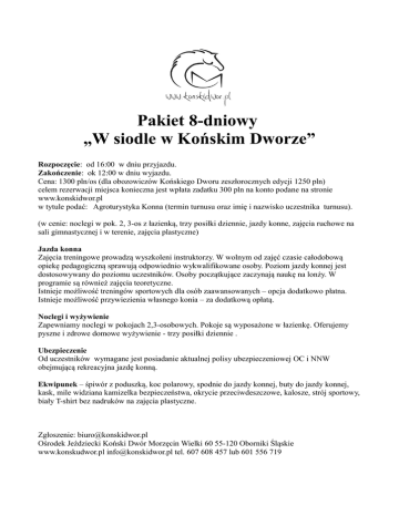 Pakiet 8-dniowy „W siodle w Końskim Dworze” Rozpoczęcie: od 16:00 w dniu przyjazdu. Zakończenie: ok 12:00 w dniu wyjazdu. Cena: 1300 pln/os (dla obozowiczów Końskiego Dworu zeszłorocznych edycji 1250 pln) celem rezerwacji miejsca konieczna jest wpłata zadatku 300 pln na konto podane na stronie www.konskidwor.pl w tytule podać: Agroturystyka Konna (termin turnusu oraz imię i nazwisko uczestnika turnusu). (w cenie: noclegi w pok. 2, 3-os z łazienką, trzy posiłki dziennie, jazdy konne, zajęcia ruchowe na sali gimnastycznej i w terenie, zajęcia plastyczne) Jazda konna Zajęcia treningowe prowadzą wyszkoleni instruktorzy. W wolnym od zajęć czasie całodobową opiekę pedagogiczną sprawują odpowiednio wykwalifikowane osoby. Poziom jazdy konnej jest dostosowywany do poziomu uczestników. Osoby początkujące zaczynają naukę na lonży. W programie są również zajęcia teoretyczne. Istnieje możliwość treningów sportowych dla osób zaawansowanych – opcja dodatkowo płatna. Istnieje możliwość przywiezienia własnego konia – za dodatkową opłatą. Noclegi i wyżywienie Zapewniamy noclegi w pokojach 2,3-osobowych. Pokoje są wyposażone w łazienkę. Oferujemy pyszne i zdrowe domowe wyżywienie - trzy posiłki dziennie . Ubezpieczenie Od uczestników wymagane jest posiadanie aktualnej polisy ubezpieczeniowej OC i NNW obejmującą rekreacyjna jazdę konną. Ekwipunek – śpiwór z poduszką, koc polarowy, spodnie do jazdy konnej, buty do jazdy konnej, kask, mile widziana kamizelka bezpieczeństwa, okrycie przeciwdeszczowe, kalosze, strój sportowy, biały T-shirt bez nadruków na zajęcia plastyczne. Zgłoszenie: [email protected] Ośrodek Jeździecki Koński Dwór Morzęcin Wielki 60 55-120 Oborniki Śląskie www.konskudwor.pl [email protected] tel. 607 608 457 lub 601 556 719