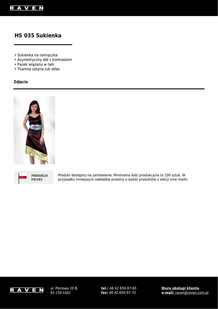 HS 035 Sukienka • Sukienka na ramiączka • Asymetryczny dół z kontrastem • Pasek wiązany w talii • Tkanina satyna lub atłas Zdjęcia Produkt dostępny na zamówienie. Minimalna ilość produkcyjna to 100 sztuk. W przypadku mniejszych nakładów prosimy o wybór produktów z sekcji inne marki. ul. Plonowa 20 B, 91-156 Łódź tel.: 48 42 650-97-60 fax: 48 42 650-97-70 Biuro obsługi klienta e-mail: [email protected]