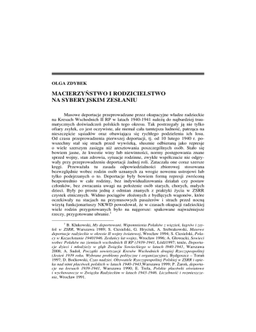 OLGA ZDYBEK MACIERZYŃSTWO I RODZICIELSTWO NA SYBERYJSKIM ZESŁANIU Masowe deportacje przeprowadzane przez okupacyjne władze radzieckie na Kresach Wschodnich II RP w latach 1940-1941 należą do najbardziej traumatycznych doświadczeń polskich tego okresu. Tak postrzegały ją nie tylko ofiary zsyłek, co jest oczywiste, ale niemal cała tamtejsza ludność, patrząca na nieszczęście sąsiadów oraz obawiająca się rychłego podzielenia ich losu. Od czasu przeprowadzenia pierwszej deportacji, tj. od 10 lutego 1940 r. powszechny stał się strach przed wywózką, słusznie odbieraną jako represje o wiele szerszym zasięgu niż aresztowania poszczególnych osób. Stało się bowiem jasne, że kwestie winy lub niewinności, normy postępowania znane sprzed wojny, stan zdrowia, sytuacje rodzinne, zwykłe współczucie nie odgrywały przy przeprowadzeniu deportacji żadnej roli. Zataczała one coraz szersze kręgi. Przeważała tu zasada odpowiedzialności zbiorowej stosowana bezwzględnie wobec rodzin osób uznanych za wrogie nowemu ustrojowi lub tylko podejrzanych o to. Deportacje były bowiem formą represji zwróconą bezpośrednio w całe rodziny, bez indywidualizowania działań czy postaw członków, bez zwracania uwagi na położenie osób starych, chorych, małych dzieci. Były po prostu jedną z odmian znanych z praktyki życia w ZSRR czystek etnicznych. Widmo pociągów złożonych z bydlęcych wagonów, które oczekiwały na stacjach na przymusowych pasażerów i strach przed nocną wizytą funkcjonariuszy NKWD powodował, że w czasach okupacji radzieckiej wiele rodzin przygotowanych było na najgorsze: spakowane najważniejsze rzeczy, przygotowane ubranie.1 1 B. Klukowski, My deportowani. Wspomnienia Polaków z więzień, łagrów i zsyłek w ZSRR, Warszawa 1989; S. Ciesielski, G. Hryciuk, A. Srebrakowski, Masowe deportacje radzieckie w okresie II wojny światowej, Wrocław 1994; S. Ciesielski, Polacy w Kazachstanie 19401946. Zesłańcy lat wojny, Wrocław 1996; A. Głowacki, Sowieci wobec Polaków na ziemiach wschodnich II RP (1939-1941, Łódź1997; tenże, Deportacje dzieci i młodzieży w głąb Związku Sowieckiego w latach l940-1941, Warszawa 2008; A. Sudoł, Początki sowietyzacji Kresów Wschodnich drugiej Rzeczypospolitej (Jesień 1939 roku. Wybrane problemy polityczne i organizacyjne), Bydgoszcz – Toruń 1997; D. Boćkowski, Czas nadziei. Obywatele Rzeczypospolitej Polskiej w ZSRR i opieka nad nimi placówek polskich w latach 1940-1943,Warszawa 1999; P. Żaroń, deportacje na kresach 1939-1941, Warszawa 1990; E. Trela, Polskie placówki oświatowe i wychowawcze w Związku Radzieckim w latach 1943-1946. Liczebność i rozmieszczenie, Wrocław 1991. OLGA ZDYBEK 42 W drodze na zesłanie Strach, rozpacz i poczucie bezsilności dotknęły deportowaną ludność począwszy już od miejsca wywózki, gdy wywlekano z domów chorych, kalekich, starców, kobiety i dzieci. Dla dalszych etapów transportu charakterystyczne są porozłączane rodziny, pogubione dzieci, niepewność losu, doświadczenia śmierci i głodu. Warunki podróży były przerażające i uwłaczające godności człowieka. Do tego dochodził głód, brak wody, okropne warunki sanitarne, zimno, wszy, pluskwy, tyfus i wyniszczający nawet najsilniejsze organizmy dyfteryt. Pomimo tego, nierzadkie były przypadki rodzenia podczas transportu. Wspomina o tym między innymi B. Obertyńska: Noc jest prawie zupełna. Wysoka łupkowata lampa przecina skośną smugą nasz wagon na pół. […] Musi tu być dużo dzieci. Ciemność jest pełna ich powikłań tłumionych przez przyciszone głosy starszych. […]Zimno, paliło się więc wszystko, co z posiadanych w wagonie rzeczy dało się spalić: skrzynie, paki, statki. Ale potem i to się skończyło. O piekle tej drogi trudno dać pojęcie. Dzieci zamarzały po kilkoro jednej nocy. Sine, zesztywniałe trupki, wypychało się przez zakratowane okienka i wyrzucało na śnieg. Zdarzały się porody – w mrozie, na gołej podłodze. Byle sznurek, byle scyzoryk musiały przy tym wystarczyć. Nie było wody, aby te dzieci chrzcić.2 Cierpienia i katusze psychiczne, na jakie narażano matki i odbierane im siłą dzieci, zdaje się, że nie znajdują sobie równych w tym „ludzkim” świecie. Staje się to znacznie bardziej zrozumiałe, gdy uświadomimy sobie czym jest dla młodego człowieka-dziecka rodzina, a w szczególności matka. Współcześni psychologowie i pedagodzy z pełną odpowiedzialnością podkreślają znaczenie i wagę matki w pierwszych doświadczeniach w życiu człowieka na całokształt jego przyszłego bytowania. W tym zaś szczególnie na poczucie sensu i celowości życia, poczucie bezpieczeństwa i zadowolenia, skalę wartości, umiejętność brania i dawania, tworzenia szczęśliwych i trwałych związków, budowania przyjaźni, stawiania sobie jasnych celów i umiejętności dążenia do nich, a także wiele, wiele innych. 3 Prawdziwy dramat przeżywały kobiety, które zostały deportowane z niemowlętami. Na skutek przeżyć i złych warunków bytowych od czasu aresztowania matki często traciły pokarm. Możliwość kupienia mleka podczas postoju na stacji należała do rzadkości (ludność miejscowa zwykle nie była dopuszczana do kontaktu z deportowanymi, ponadto miejscowi nie zawsze byli pozytywnie nastawieni do obcych, transportowanych pod eskortą). Matki na różne sposoby próbowały sobie z tym radzić. Najczęściej podawały maluchom do ssania jakieś rozmoczone lub rozpuszczone produkty (miód, cukier, bułka, mąka), wykorzystując przy tym rady innych, bardziej doświadczonych kobiet, z którymi dzieliły wagon. Niekiedy korzystały z podarunków ofiarowanych dziecku przez swoich nowych sąsiadów. Apolonia Korczowska, zesłana z całą swoją 13-osobową rodziną, w tym z miesięcznym rodzeństwem – bliźniakami wspomina: 2 B. Obertyńska, W domu niewoli, Warszawa 2005, s. 297. K. Kość, „To o Was Bezimienne” 