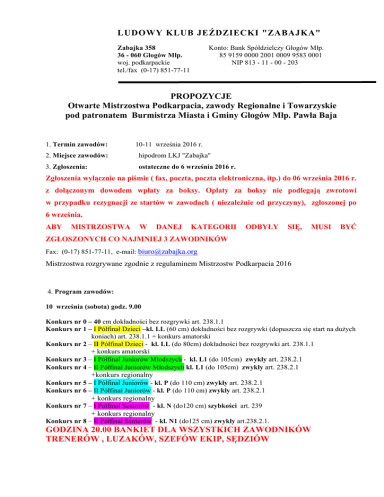LUDOWY KLUB JEŹDZIECKI "ZABAJKA" Zabajka 358 36 - 060 Głogów Młp. woj. podkarpackie tel./fax (0-17) 851-77-11 Konto: Bank Spółdzielczy Głogów Młp. 85 9159 0000 2001 0009 9583 0001 NIP 813 - 11 - 00 - 203 PROPOZYCJE Otwarte Mistrzostwa Podkarpacia, zawody Regionalne i Towarzyskie pod patronatem Burmistrza Miasta i Gminy Głogów Młp. Pawła Baja 1. Termin zawodów: 10-11 września 2016 r. 2. Miejsce zawodów: hipodrom LKJ "Zabajka" 3. Zgłoszenia: ostateczne do 6 września 2016 r. Zgłoszenia wyłącznie na piśmie ( fax, poczta, poczta elektroniczna, itp.) do 06 września 2016 r. z dołączonym dowodem wpłaty za boksy. Opłaty za boksy nie podlegają zwrotowi w przypadku rezygnacji ze startów w zawodach ( niezależnie od przyczyny), zgłoszonej po 6 września. ABY MISTRZOSTWA W DANEJ KATEGORII ODBYŁY SIĘ, MUSI BYĆ ZGŁOSZONYCH CO NAJMNIEJ 3 ZAWODNIKÓW Fax: (0-17) 851-77-11, e-mail: [email protected] Mistrzostwa rozgrywane zgodnie z regulaminem Mistrzostw Podkarpacia 2016 4. Program zawodów: 10 września (sobota) godz. 9.00 Konkurs nr 0 – 40 cm dokładności bez rozgrywki art. 238.1.1 Konkurs nr 1 – I Półfinał Dzieci –kl. LL (60 cm) dokładności bez rozgrywki (dopuszcza się start na dużych koniach) art. 238.1.1 + konkurs amatorski Konkurs nr 2 – II Półfinał Dzieci - kl. LL (do 80cm) dokładności bez rozgrywki art. 238.1.1 + konkurs amatorski Konkurs nr 3 – I Półfinał Juniorów Młodszych - kl. L1 (do 105cm) zwykły art. 238.2.1 Konkurs nr 4 – II Półfinał Juniorów Młodszych kl. L1 (do 105cm) zwykły art. 238.2.1 +konkurs regionalny Konkurs nr 5 – I Półfinał Juniorów - kl. P (do 110 cm) zwykły art. 238.2.1 Konkurs nr 6 – II Półfinał Juniorów - kl. P (do 110 cm) zwykły art. 238.2.1 + konkurs regionalny Konkurs nr 7 – I Półfinał Seniorów - kl. N (do120 cm) szybkości art. 239 + konkurs regionalny Konkurs nr 8 – II Półfinał Seniorów - kl. N1 (do125 cm) zwykły art.238.2.1. GODZINA 20.00 BANKIET DLA WSZYSTKICH ZAWODNIKÓW TRENERÓW , LUZAKÓW, SZEFÓW EKIP, SĘDZIÓW 11 września (niedziela) godz.9.00 Konkurs nr 0 – 40 cm dokładności bez rozgrywki art. 238.1.1 Konkurs nr 9 – FINAŁ Dzieci – kl. LL (80/80) dwunawrotowy z rozgrywką o miejsca medalowe art. 273.3.2.+ konkurs amatorski Konkurs nr 8 – FINAŁ Juniorów Młodszych – kl. L1 (105/105 cm) dwunawrotowy z rozgrywką o miejsca medalowe art. 273.3.2. + konkurs regionalny Konkurs nr 9 – FINAŁ Juniorów – kl. N (120/120) dwunawrotowy z rozgrywką o miejsca medalowe art. 273.3.2. + konkurs regionalny OFICJALNE OTWARCIE ZAWODÓW – ok. godz. 14.30 godz. 15.45 Konkurs nr 10 – FINAŁ Seniorów – kl. C (130/130) dwunawrotowy z rozgrywką o miejsca medalowe art. 273.3.2. + konkurs regionalny Memoriał Witolda Koryla. 5. Nagrody PULA NAGRÓD 7000 zł NAGRODY PIENIĘŻNE + NAGRODY RZECZOWE Konkurs nr 10 I : 300 zł II : 200 zł III : 100 zł MISTRZOSTWA Kategoria Dzieci NAGRODY RZECZOWE Kategoria Junior Młodszy NAGRODY RZECZOWE Kategoria Junior I : 700 II : 500 III :300 Kategoria Senior I : 1200 II : 900 III : 700 6. Stajnie letnie/ Opłaty Boksy dla koni (60 szt.) Organizator zapewnia pierwszą słomę. Na terenie zawodów istnieje możliwość nabycia – słomy – 1 kostka 5 zł/ siano 1 kostka 10 zł. W przypadku wcześniejszego przyjazdu lub późniejszego wyjazdu opłata dodatkowa wynosi 30 zł. dziennie. Mistrzostwa/Zawody regionalne- 250 zł/koń/boks zawody - 1 lub 2 dni startów Zawody towarzyskie 150 zł/koń/boks -zawody 1 lub 2 dni startów Możliwość podłączenia do prądu – 100 zł za całe zawody. Wpłaty można przelać na konto Bank Spółdzielczy Głogów Młp. 85 9159 0000 2001 0009 9583 0001 Opłata organizacyjna musi być uregulowana na godzinę przed rozpoczęciem pierwszego konkursu. W przypadku nieuregulowania opłat, do startu nie zostanie dopuszczona cała ekipa. - cisza nocna w stajni od godz. 22.00 – 6.00 - prosimy o przestrzeganie przepisów BHP i p.poż. 7. Zakwaterowanie: Zawodnicy, szefowie ekip, trenerzy, luzacy – noclegi na własny koszt. Można dokonać rezerwacji w LKJ „Zabajka” -stare domki 2- osobowe: cena 50 zł z własnymi śpiworami; -nowe domki 2-osobowe: cena 70 zł -nowy domek 4-osobowy: cena 140 zł -w 6 pokojach gościnnych 2 osobowy – 90 zł 3 osobowy – 135 zł Wyżywienie: We własnym zakresie w Gospoda WIŚTA WIO na terenie zawodów. 8. Warunki techniczne: zawody odbywać się będą na terenie otwartym tor konkursowy, wymiary: 70 x 80 [m]– podłoże piaszczysto-trawiaste rozprężania, wymiary: 35 x 70 [m] – podłoże piaszczyste 9. Klasyfikacja ogólna: - flots dla 25% startujących w konkursie, - po każdym konkursie odbędzie się dekoracja zwycięzców. 10. Zebranie techniczne: nie przewiduje się zebrania technicznego LOSOWANIE NR STARTOWYCH ODBĘDZIE SIĘ W BIURZE ZAWODÓW O GODZ 8.00 W DNIU 10.09.2016r Sprawdzanie dokumentów koni i zawodników odbędzie się w biurze zawodów w dniu 10 września 2016 r. (sobota). Medale w danej kategorii wiekowej zostaną rozdane w przypadku ukończenia Mistrzostw Okręgu przez co najmniej 3 zawodników. 11. Osoby oficjalne: Komisja sędziowska: Przewodnicząca Komisarz zawodów Sędzia WZJ Sędziowie pomocniczy: K. Bącal B. Galuba W. Bącal D.Zakrzewska, A.Podolak, B.Winiarska Gospodarz toru Lekarz weterynarii A. Galuba dr Jacek Sołtyski, Tel.: 500 049 955 12. Informacje ogólne: Odpowiedzialność: Organizatorzy nie ponoszą odpowiedzialności z tytułu wypadków i zachorowań trenerów, zawodników, luzaków i koni, jak również w przypadku kradzieży, zniszczeń, pożarów i innych wydarzeń wynikłych w czasie transportu i trwania zawodów. Organizacja zawodów: W nadzwyczajnych okolicznościach nieprzewidzianych przepisami, organizator zastrzega sobie prawo do odwołania zwodów. Ubezpieczenie: Przypominamy o obowiązkowym ubezpieczeniu NNW zawodników oraz aktualnych badaniach zawodników. Wstęp do stajni: Poza osobami oficjalnymi, p