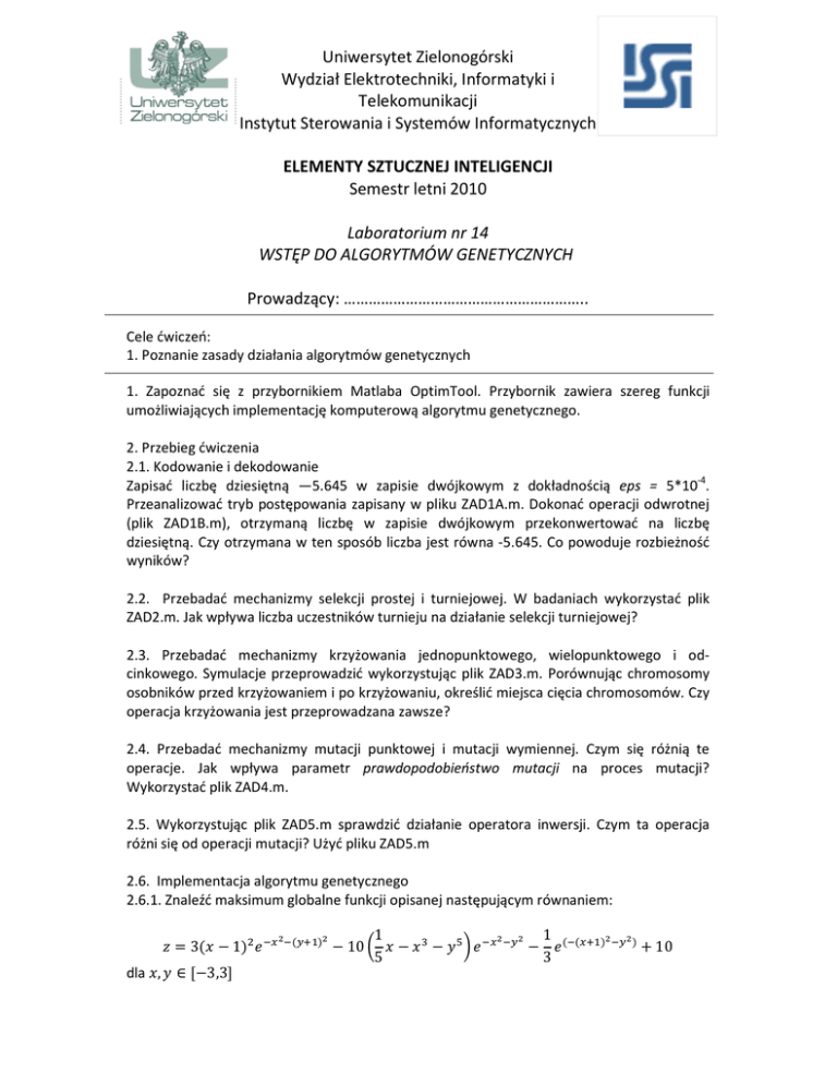 Uniwersytet Zielonogórski Wydział Elektrotechniki, Informatyki i Telekomunikacji Instytut Sterowania i Systemów Informatycznych ELEMENTY SZTUCZNEJ INTELIGENCJI Semestr letni 2010 Laboratorium nr 14 WSTĘP DO ALGORYTMÓW GENETYCZNYCH Prowadzący: ………………………………………………….. Cele ćwiczeń: 1. Poznanie zasady działania algorytmów genetycznych 1. Zapoznać się z przybornikiem Matlaba OptimTool. Przybornik zawiera szereg funkcji umożliwiających implementację komputerową algorytmu genetycznego. 2. Przebieg ćwiczenia 2.1. Kodowanie i dekodowanie Zapisać liczbę dziesiętną —5.645 w zapisie dwójkowym z dokładnością eps = 5*10-4. Przeanalizować tryb postępowania zapisany w pliku ZAD1A.m. Dokonać operacji odwrotnej (plik ZAD1B.m), otrzymaną liczbę w zapisie dwójkowym przekonwertować na liczbę dziesiętną. Czy otrzymana w ten sposób liczba jest równa -5.645. Co powoduje rozbieżność wyników? 2.2. Przebadać mechanizmy selekcji prostej i turniejowej. W badaniach wykorzystać plik ZAD2.m. Jak wpływa liczba uczestników turnieju na działanie selekcji turniejowej? 2.3. Przebadać mechanizmy krzyżowania jednopunktowego, wielopunktowego i odcinkowego. Symulacje przeprowadzić wykorzystując plik ZAD3.m. Porównując chromosomy osobników przed krzyżowaniem i po krzyżowaniu, określić miejsca cięcia chromosomów. Czy operacja krzyżowania jest przeprowadzana zawsze? 2.4. Przebadać mechanizmy mutacji punktowej i mutacji wymiennej. Czym się różnią te operacje. Jak wpływa parametr prawdopodobieństwo mutacji na proces mutacji? Wykorzystać plik ZAD4.m. 2.5. Wykorzystując plik ZAD5.m sprawdzić działanie operatora inwersji. Czym ta operacja różni się od operacji mutacji? Użyć pliku ZAD5.m 2.6. Implementacja algorytmu genetycznego 2.6.1. Znaleźć maksimum globalne funkcji opisanej następującym równaniem: 3 1 dla , 3,3 1 1 10 10 5 3 Funkcja posiada maksimum globalne o wartości ymax = 18.106. Do obliczeń wykorzystać plik 0BLICZ1 .m. Sprawdzić wpływ następujących wartości parametrów algorytmu na jego efektywność: • liczebność populacji: 10, 50, 100, 500 • prawdopodobieństwo krzyżowania: 0.1, 0.4, 0.6, 0.8 • prawdopodobieństwo mutacji: 0.01, 0.05, 0.1, 0.5 • dokładność obliczeń: 0.1, 0.01, 0.001 2.6.2. Znaleźć maksimum globalne funkcji opisanej następującym równaniem: d l a , 5.12, 5.12 Funkcja posiada maksimum globalne o wartości ymax = 10. Do obliczeń wykorzystać plik 0BLICZ2.m 2.6.3. Znaleźć maksimum globalne funkcji opisanej następującym równaniem: 21.5 "#$4& "#$20& dla 3, 12.1, 4.1, 5.8 Jaką wartość przyjmuje funkcja w maksimum globalnym? Do obliczeń wykorzystać plik 0BLICZ3.m 2.6.4. Zastosować algorytm genetyczny do czterowymiarowej funkcji opisanej równaniem: znalezienia maksimum globalnego ( 800 dla , , ( 5.12, 5.12 Funkcja posiada maksimum globalne o wartości ymax = 800. Napisać odpowiedni program wykorzystując pakiet OptimTool. 3. Sprawozdanie powinno zawierać wyniki przeprowadzonych eksperymentów w postaci tabel i wykresów oraz wnioski i spostrzeżenia z ćwiczenia. Literatura: Goldberg, D.E., „Algorytmy genetyczne i ich zastosowania”. WNT 2003
