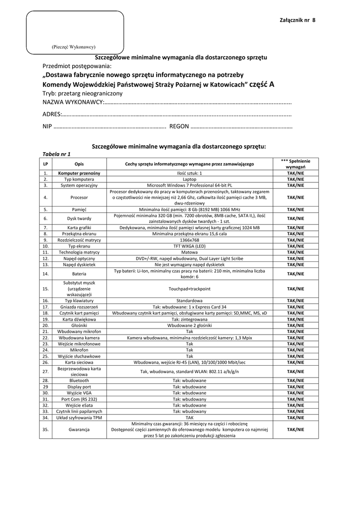 Załącznik nr 8 (Pieczęć Wykonawcy) Szczegółowe minimalne wymagania dla dostarczonego sprzętu Przedmiot postępowania: „Dostawa fabrycznie nowego sprzętu informatycznego na potrzeby Komendy Wojewódzkiej Państwowej Straży Pożarnej w Katowicach” część A Tryb: przetarg nieograniczony NAZWA WYKONAWCY:…………………………………………..…………………………………………….................... ADRES:…………………………………………………………………………............................................................. NIP ……………………………………………………………….. REGON …………………………………………………………. Szczegółowe minimalne wymagania dla dostarczonego sprzętu: Tabela nr 1 LP Opis Cechy sprzętu informatycznego wymagane przez zamawiającego 1. 2. 3. Komputer przenośny Typ komputera System operacyjny 4. Procesor 5. Pamięć 6. Dysk twardy 7. 8. 9. 10. 11. 12. 13. Karta grafiki Przekątna ekranu Rozdzielczość matrycy Typ ekranu Technologia matrycy Napęd optyczny Napęd dyskietek 14. Bateria Ilość sztuk: 1 Laptop Microsoft Windows 7 Professional 64-bit PL Procesor dedykowany do pracy w komputerach przenośnych, taktowany zegarem o częstotliwości nie mniejszej niż 2,66 Ghz, całkowita ilość pamięci cache 3 MB, dwu-rdzeniowy Minimalna ilość pamięci: 8 Gb (8192 MB) 1066 MHz Pojemność minimalna 320 GB (min. 7200 obrotów, 8MB cache, SATA II,), ilość zainstalowanych dysków twardych - 1 szt. Dedykowana, minimalna ilość pamięci własnej karty graficznej 1024 MB Minimalna przekątna ekranu 15,6 cala 1366x768 TFT WXGA (LED) Matowa DVD+/-RW, napęd wbudowany, Dual Layer Light Scribe Nie jest wymagany napęd dyskietek Typ baterii: Li-Ion, minimalny czas pracy na baterii: 210 min, minimalna liczba komór: 6 28. 29 30. 31. 32. 33. 34. Substytut myszk (urządzenie wskazujące)i Typ klawiatury Gniazda rozszerzeń Czytnik kart pamięci Karta dźwiękowa Głośniki Wbudowany mikrofon Wbudowana kamera Wejście mikrofonowe Mikrofon Wyjście słuchawkowe Karta sieciowa Bezprzewodowa karta sieciowa Bluetooth Display port Wyjście VGA Port Com (RS 232) Wejście eSata Czytnik linii papilarnych Układ szyfrowania TPM 35. Gwarancja 15. 16. 17. 18. 19. 20. 21. 22. 23. 24. 25. 26. 27. *** Spełnienie wymagań TAK/NIE TAK/NIE TAK/NIE TAK/NIE TAK/NIE TAK/NIE TAK/NIE TAK/NIE TAK/NIE TAK/NIE TAK/NIE TAK/NIE TAK/NIE TAK/NIE Touchpad+trackpoint TAK/NIE Standardowa Tak: wbudowane: 1 x Express Card 34 Wbudowany czytnik kart pamięci, obsługiwane karty pamięci: SD,MMC, MS, xD Tak: zintegrowana Wbudowane 2 głośniki Tak Kamera wbudowana, minimalna rozdzielczość kamery: 1,3 Mpix Tak Tak Tak Wbudowana, wejście RJ-45 (LAN), 10/100/1000 Mbit/sec TAK/NIE TAK/NIE TAK/NIE TAK/NIE TAK/NIE TAK/NIE TAK/NIE TAK/NIE TAK/NIE TAK/NIE TAK/NIE Tak, wbudowana, standard WLAN: 802.11 a/b/g/n TAK/NIE Tak: wbudowane Tak: wbudowane Tak: wbudowane Tak: wbudowany Tak: wbudowane Tak: wbudowany TAK Minimalny czas gwarancji: 36 miesięcy na części i robociznę Dostępność części zamiennych do oferowanego modelu komputera co najmniej przez 5 lat po zakończeniu produkcji zgłoszenia TAK/NIE TAK/NIE TAK/NIE TAK/NIE TAK/NIE TAK/NIE TAK/NIE TAK/NIE Tabela nr 2 LP Opis 2. 3. Komputer przenośny Typ komputera System operacyjny 4. Procesor 5. Pamięć 6. Dysk twardy 7. 8. 16. Karta grafiki Przekątna ekranu Rozdzielczość matrycy Typ ekranu Technologia matrycy Napęd optyczny Gniazda rozszerzeń Bateria Substytut myszki (urządzenie wskazujące) Typ klawiatury 17. Czytnik kart pamięci 18. 19. Karta dźwiękowa Głośniki Wbudowany mikrofon Wbudowana kamera Wejście mikrofonowe Mikrofon Wyjście słuchawkowe Karta sieciowa Bezprzewodowa karta sieciowa Czytnik linii papilarnych 1. 9. 10. 11. 12. 13. 14. 15. 20. 21. 22. 23. 24. 25. 26. 27. 28. Złącz zewnętrzne 29. Gwarancja Cechy sprzętu informatycznego wymagane przez zamawiającego *** Spełnienie wymagań Ilość sztuk: 2 TAK/NIE Laptop Microsoft Windows 7 Professional 64-bit PL Procesor dedykowany do pracy w komputerach przenośnych, taktowany zegarem o częstotliwości nie mniejszej niż 2,53 Ghz, całkowita ilość pamięci cache 3 MB, dwu-rdzeniowy Minimalna ilość pamięci: 8 Gb (8192 MB) 1066 MHz Pojemność minimalna 320 GB (min. 7200 obrotów, 8MB cache, SATA II,), ilość zainstalowanych dysków twardych - 1 szt. Dedykowana, minimalna ilość pamięci własnej karty graficznej 1024 MB Minimalna przekątna ekranu 17,3 cala TAK/NIE TAK/NIE TAK/NIE TAK/NIE TAK/NIE TAK/NIE TAK/NIE 1600 x 900 TAK/NIE TFT WXGA (LED) TAK/NIE Matowa TAK/NIE DVD+/-RW Super Multi, napęd wbudowany, Dual Layer Light Scribe Tak: wbudowane: 1 x Express Card 34 Typ baterii: Li-Ion, liczba komór: 6 TAK/NIE TAK/NIE TAK/NIE Touchpad TAK/NIE Standardowa Wbudowany czytnik kart pamięci, obsługiwane karty pamięci: - Secure Digital Card - MultiMedia Card - MemoryStick MemoryStick Pro - MemoryStick Duo MemoryStick Pro Duo - xD-Picture Card Tak: wbudowana Wbudowane 2 głośniki TAK/NIE Tak TAK/NIE Kamera wbudowana, minimalna rozdzielczość kamery: 1,3 Mpix TAK/NIE Tak TAK/NIE Tak TAK/NIE TAK/NIE TAK/NIE TAK/NIE Tak TAK/NIE Wbudowana, wejście RJ-45 (LAN), 10/100/1000 Mbit/sec TAK/NIE Tak, wbudowana, standard WLAN: 802.11 n TAK/NIE TAK: wbudowany TAK/NIE Wbudowane złącza zewnętrzne: - 1 x 15 stykowe D-Sub (wyjście na monitor) - 1 x HDMI - 4 x USB 2,0 - 1 x RJ-45 (LAN) - 1x E-SATA/USB Combo - 1 x FireWire (IEEE1394) - wejście zasilania (DC-in) Minimalny czas gwarancji: 36 miesięcy na części i robociznę Dostępność części zamiennych do oferowanego modelu komputera co najmniej przez 5 lat po zakończeniu produkcji zgłoszenia TAK/NIE TAK/NIE Tabela nr 3 LP Opis Cechy sprzętu informatycznego wymagane przez zamawiającego 1. 2. 3. Komputer przenośny Typ komputera System operacyjny 4. Procesor Ilość sztuk: 2 Laptop Microsoft Windows 7 Professional 64-bit