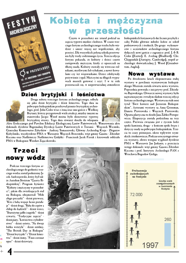 Kobieta i mężczyzna w przeszłości Często w przeszłości nie istniał podział na zajęcia typowo męskie i kobiece. W czasie trze− ciego festynu archeologicznego trzeba było wie− dzieć i umieć więcej niż współcześnie, aby przeżyć. Dla wszystkich jedyną szkołą przetrwa− nia były trudy codziennego życia. Trzecia edycja festynu pokazała, że kobiety i dzieci często zastępowały mężczyzn, kiedy ci opuszczali na dłużej osadę. Kobiety stawały się wówczas rol− nikami, myśliwymi lub rybakami, a nawet kowa− lami czy też wojownikami. Dzieci zdobywały pożywienie i opał. Mężczyźni na długich wypra− wach musieli gotować i szyć. I w te role przeistaczali się, w niepowtarzalnej atmosferze Dzień brytyjski i leśnictwa Druga sobota trzeciego festynu archeologicznego, odbyła się jako dzień brytyjski i dzień leśnictwa. Tego dnia na półwyspie biskupińskim przebywał pionier brytyjskiej archeo− logii, prof. John Coles wraz z żoną oraz inni goście z Wielkiej Brytanii, którzy przygotowali wiele atrakcji, między innymi na stanowisku Jacqui Wood można było skosztować typowej brytyjskiej strawy. Tego dnia również doszło do wkopania Aktu Erekcyjnego pod Pawilon Edukacji Ekologicznej Lasów Państwowych. Wmurowania aktu dokonali: dyrektor Regionalnej Dyrekcji Lasów Państwowych w Toruniu − Wojciech Wiciński, Generalny Konserwator Zabytków − Andrzej Tomaszewski, Główny Archeolog Kraju − Zbigniew Kobyliński, wicedyrektor PMA w Warszawie Wojciech Brzeziński, wójt gminy Gąsawa − Zdzisław Kuczma oraz Nadleśniczy Nadleśnictwa Gołąbki − Franciszek Jacek Fiutak i kierownik oddziału PMA w Biskupinie Wiesław Zajączkowski. Trzeci nowy wódz c m y k Podczas trzeciego festynu ar− cheologicznego do godności trze− ciego wodza został podniesiny Ja− cek Andrzejowski, który był tak− że Aniołem Stróżem “Gazety Bi− skupińskiej”. Program bytności “Kobiety i mężczyzny w przeszłoś− ci”, jakim dla zwiedzających stał się Biskupin, obejmował: “Miłe złego początki” − dzień pierwszy, “Kto z babą wojuje łacno pożału− je” − dzień drugi, “Baba do cepów a chłop do kądzieli” − dzień trzeci, “Starożytne jadło i napitki” − dzień czwarty, “Tradycyjne zajęcia” − dzień piąty, “Łowiectwo i rybołów− stwo” − dzień szósty, “Na dwoje babka wróżyła” − dzień siódmy, “The British Day in Biskupin” “Dzień brytyjski” i “Dzień leśnic− twa” − dzień ósmy, “Finis coronat opus” − dzień dziewiąty. 4 biskupińskich festynowych dni licznie przybyli z całej Polski głównie młodzi ludzie ze szkół podstawowych i średnich. Do grupy wykonaw− ców i uczestników archeologicznego festynu dołączyli nowi goście z zagranicy: prof. J. & B. Coles (Exeter), E. Aveling (Bradford), Chr. Chippindale (Antiqity, Cambridge), zespół ar− cheologii doświadczalnej J. Wood (Greenbot− tom, Anglia). Nowa wystawa Po dwudziestu latach eksponowania stałej wystawy w pawilonie wystawowym biskupiń− skiego Muzeum została otwarta nowa wystawa. Poprzednia powstała z inicjatywy prof. Zdzisła− wa Rajewskiego. Otwarcie nowej wystawy było najważniejszym i trwałym śladem trzeciej edycji festynu archeologicznego. Wystawa na stałe nosi tytuł “Świt historii nad Jeziorem Biskupiń− skim”. Autorami wystawy są Anna Grossman, Danuta Piotrowska i Wojciech Piotrowski. Oprawa plastyczna to dzieło Jana Żabko−Potopo− wicza. Ekspozycja została podzielona na trzy części. Pierwsza związana jest z życiem ludzi epoki kamienia, druga − z końcem epoki brązu i dotyczy osady na półwyspie biskupińskim. Trze− cia to czasy późniejsze, okres wpływów rzym− skich i średniowiecze. Podczas uroczystego otwar− cia wystawy, słowo wstępne wygłosił dyrektor PMA w Warszawie Jan Jaskanis, a przecięcia wstęgi dokonali: wójt gminy Gąsawa Zdzisław Kuczma i prof. Instytutu Archeologii PAN z Wrocławia Bogusław Gediga.