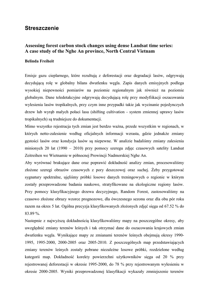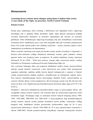 Streszczenie Assessing forest carbon stock changes using dense Landsat time series: A case study of the Nghe An province, North Central Vietnam Belinda Freiheit Emisje gazu cieplarnego, które rezultują z deforestacji oraz degradacji lasów, odgrywają decydującą rolę w globalny bilans dwutlenku węgla. Zapis danych emisyjnych podlega wysokiej niepewności pomiarów na poziomie regionalnym jak również na poziomie globalnym. Dane teledetakcyjne odgrywają decydującą rolę przy modyfiikacji oszacowania wylesienia lasów tropikalnych, przy czym inne przypadki takie jak wycinanie pojedynczych drzew lub wyrąb małych połaci lasu (shifting cultivation - system zmiennej uprawy lasów tropikalnych) są trudniejsze do dokumentacji. Mimo wszystko rejestracja tych zmian jest berdzo ważna, przede wszystkim w regionach, w których netto-zalesienie według oficjalnych informacji wzrasta, gdzie jednakże zmiany gęstości lasów oraz kondycja lasów są niepewne. W analizie badaliśmy zmiany zalesienia minionych 20 lat (1990 – 2010) przy pomocy szeregu zdjęc czasowych satelity Landsat Zeitreihen we Wietnamie w północnej Prowincji Nadmorskiej Nghe An. Aby wyrównać brakujące dane oraz poprawić dokładność analizy zmian, procesowaliśmy złożone szeregi obrazów czasowych z pory deszczowej oraz suchej. Żeby przygotować sygnatury spektralne, ujęliśmy próbki losowe danych treningowych o regionie w którym zostały przeprowadzone badania naukowe, stratyfikowane na ekologiczne regiony lasów. Przy pomocy klasyfikacyjnego drzewa decyzyjnego, Random Forest, zastosowaliśmy na czasowo złożone obrazy wzorce prognozowe, dla ówczesnego sezonu oraz dla obu pór roku razem na okres 5 lat. Ogólna precyzja klasyfikowanych złożonych zdjęć sięga od 67.52 % do 83.89 %. Nastepnie z najwyższą dokładnością klasyfikowaliśmy mapy na poszczególne okresy, aby uwzględnić zmiany terenów leśnych i tak otrzymać dane do oszacowania krajowych zmian dwutlenku węgla. Wynikające mapy ze zmianami terenów leśnych obejmują okresy 19901995, 1995-2000, 2000-2005 oraz 2005-2010. Z poszczególnych map przedstawiających zmiany terenów leśnych zostały pobrane niezależne losowe próbki, rozdzielone według kategorii map. Dokładność korekty powierzchni użytkowników sięga od 20 % przy rejestrowanej deforestacji w okresie 1995-2000, do 78 % przy rejestrowanym wylesieniu w okresie 2000-2005. Wyniki przeprowadzonej klasyfikacji wykazały zmniejszenie terenów leśnych o 52,226 ha (1.53 % ± 8.24 % Kl), zanieczyszczone obszary leśne zmniejszyły się o 134,551 ha (3.93 % ± 2.54 % KI) oraz utrata lasów o powierzchni 8,634 ha (0.25 ± 0.09 % KI) został ustalony w latach 1990 do 2010. Ponadto przeprowadziliśmy analizę / bilans dwutlenku węgla dla zasobu drzew opierając się na standardowych metodach IPCC. Z powodu brakujących danych pomiarowych z regionu badań, sięgneliśmy po narodowe dane jak i po standardowe dane IPCC, które służyły w naszej kalkulacji jako danewyjściowe dla faktorów emisji. Szacowana zmiana dwutlenku węgla zasób drzew wykazuje następujący wynik: Pobranie dwutlenku węgla (CO2) ze stabilnych terenów leśnych wyniosło średnio 215 Mt CO2 z niepewnością pomiaru w wysokości 54.50 %, pobranie CO2 z terenów na nowo zalesionych wyniosło 10 Mt CO2 z niepewnością pomiaru w wysokości 52.38 %, w terenach lasów zanieczyszczonych wynosi emisja dwutlenku węgla 7 Mt CO2 z niepewnością pomiaru w wysokości 54.50 % a w wylesionych terenach wynoszą szacowane emisje dwutlenku 3.5 Mt CO2 przy niepewności pomiaru w wysokości 46.00 %. Celem badań jest uzupełnienie analiz / badań modyfikacji terenów leśnych, które przeprowadzone zostały w kompleksowych krajobrazach górskich gdzie ziemia jest jedynie w małych obszarach uprawiana. Nowatorski charakter badań polega na zapisie degradacji lasów w pojedyńczym regionie, w którym przede wszystkim uprawiana jest gospodarka łazowa, jak również szacowanie zmian bilansu dwutlenku węgla zasobów lasów