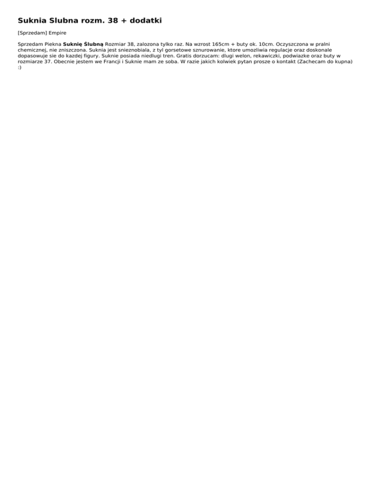 Suknia Slubna rozm. 38 + dodatki [Sprzedam] Empire Sprzedam Piekna Suknię Ślubną Rozmiar 38, zalozona tylko raz. Na wzrost 165cm + buty ok. 10cm. Oczyszczona w pralni chemicznej, nie zniszczona. Suknia jest snieznobiala, z tyl gorsetowe sznurowanie, ktore umozliwia regulacje oraz doskonale dopasowuje sie do kazdej figury. Suknie posiada niedlugi tren. Gratis dorzucam: dlugi welon, rekawiczki, podwiazke oraz buty w rozmiarze 37. Obecnie jestem we Francji i Suknie mam ze soba. W razie jakich kolwiek pytan prosze o kontakt (Zachecam do kupna) :) Informacje dodatkowe Ilość 1 Stan Używany Adres ogłoszenia http://todoslubu.pl/suknia-slubna-rozm-38-dodatki,o170 Kontakt Mail: [email protected] Telefon: Lokalizacja , - (Polska) Ogłoszenie dodano: 2016-10-25 09:07:09 Ogłoszenie wygasa: 2018-01-23 09:07:09 Powered by TCPDF (www.tcpdf.org)