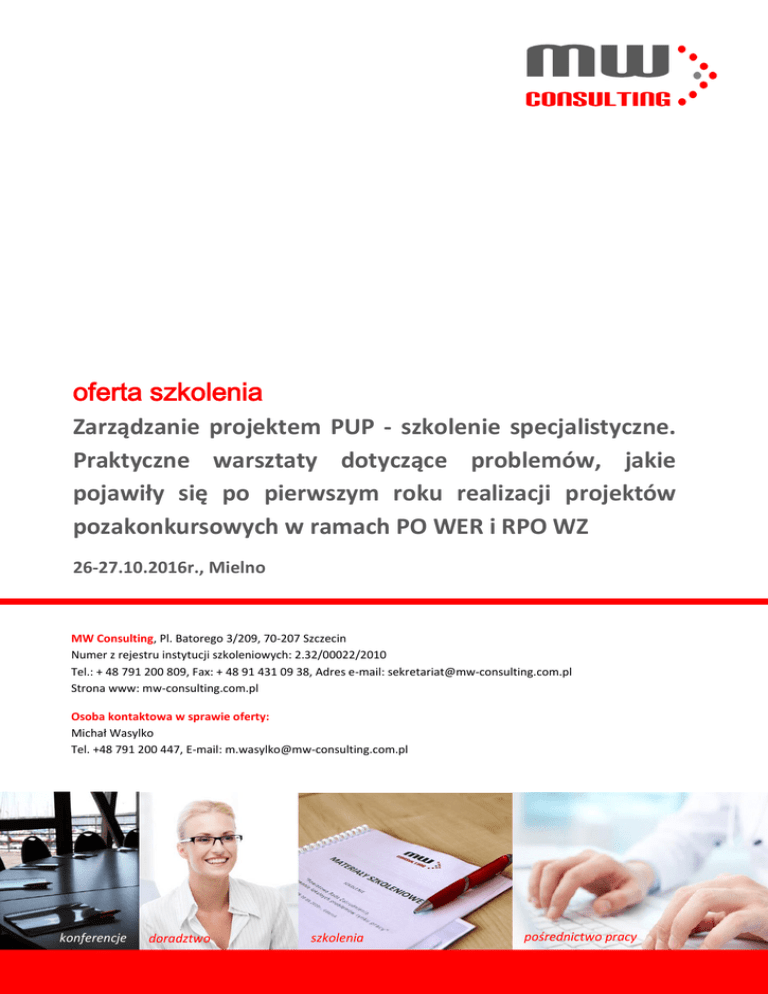 oferta szkolenia Zarządzanie projektem PUP - szkolenie specjalistyczne. Praktyczne warsztaty dotyczące problemów, jakie pojawiły się po pierwszym roku realizacji projektów pozakonkursowych w ramach PO WER i RPO WZ 26-27.10.2016r., Mielno MW Consulting, Pl. Batorego 3/209, 70-207 Szczecin Numer z rejestru instytucji szkoleniowych: 2.32/00022/2010 Tel.: + 48 791 200 809, Fax: + 48 91 431 09 38, Adres e-mail: [email protected] Strona www: mw-consulting.com.pl Osoba kontaktowa w sprawie oferty: Michał Wasylko Tel. +48 791 200 447, E-mail: [email protected] konferencje doradztwo szkolenia pośrednictwo pracy 1. adresaci szkolenia Szkolenie adresowane jest do pracowników publicznych instytucji rynku pracy, w tym m. in. koordynatorów projektów, specjalistów ds. programów, osób odpowiedzialnych za finanse, kierowników i pracowników CAZ. 2. cel szkolenia Celem szkolenia jest nabycie wiedzy i praktycznych umiejętności z zakresu realizacji projektów powiatowych urzędów pracy w ramach PO WER 2014-2020 oraz RPO WZ 2014-2020. 3. organizacja szkolenia Tytuł szkolenia: „Zarządzanie projektem PUP - szkolenie specjalistyczne. Praktyczne warsztaty dotyczące problemów, jakie pojawiły się po pierwszym roku realizacji projektów pozakonkursowych w ramach PO WER i RPO WZ” Termin realizacji szkolenia: 26-27.10.2016r. (2 dni szkoleniowe) Liczba godzin lekcyjnych szkolenia: 12 godzin lekcyjnych Miejsce szkolenia: HOTEL PLANETA, ul. Wojska Polskiego 4, 76-032 Mielno Termin zgłoszenia: do dnia 06.10.2016r. Osoby, które zostaną zakwalifikowane do udziału w szkoleniu otrzymają potwierdzenie droga elektroniczną. INWESTYCJA cena netto szkolenia za osobę szkolenie materiały szkoleniowe nocleg wyżywienie serwis kawowy zaświadczenie zgodne ze wzorem MEN ubezpieczenie NNW opieka organizacyjna na miejscu szkolenia dojazd na szkolenie OPCJA I OPCJA II OPCJA III 1 190,00zł* 990,00zł* pokój 1-os. 1 x śniadanie 2 x obiad 1 x kolacja pokój 2-os. 1 x śniadanie 2 x obiad 1 x kolacja bez noclegu 1 290,00zł 2 x obiad Przedstawiona oferta cenowa może zostać zwiększona o koszt dojazdu uczestnika na szkolenie. W tym celu prosimy o kontakt z organizatorem szkolenia. W przypadku finansowania szkolenia w co najmniej 70% ze środków publicznych zastosowana zostanie stawka ZW. W innym przypadku firma MW Consulting zastosuje stawkę 23%. MW Consulting - oferta szkolenia [19.09.2016r.] Strona 2 4. program szkolenia I. Rozpoczęcie pracy z uczestnikiem projektu: 1. Dokumenty (wzory własne + obowiązujące dane), które powinien otrzymać uczestnik projektu na początku uczestnictwa i po jego zakończeniu i kiedy; 2. Uczestnik niepełnosprawny - zmiany we wniosku o dofinansowanie i wprowadzenie mechanizmów racjonalnych usprawnień; 3. Równość szans K i M; 4. Kwalifikowalność uczestnika w projektach pup w ramach PO WER i RPO WZ; 5. Budowa ścieżki aktywizacji i jej monitoring (wykorzystanie innowacyjnych rozwiązań, w tym nagrodzonych w Brukseli); 6. Wymogi odnośnie wskaźnika efektywności zatrudnieniowej; 7. Wskaźnik rezultatu a wskaźnik efektywności zatrudnieniowej; 8. Najnowsze interpretacje ministerialne odnośnie projektów na rzecz rynku pracy. II. Wybór i bieżąca współpraca z realizatorami: 1. Ścieżka dot. wyłonienia jednostki szkolącej do przeprowadzenia szkolenia w ramach PO WER i RPO WZ - przepisy a interpretacje; 2. Ważne uzgodnienia z instytucjami przyjmującymi na staż, na refundacje wyposażenia, prace interwencyjne, z instytucjami szkolącymi; 3. Jak zadbać o realizację wskaźników przez realizatorów zadań; 4. Podstawowe wskaźniki produktu i rezultatu - jak je dokładnie rozumieć; 5. Jak zapewnić sobie podniesienie poziomu kompetencji uczestników przez wykonawcę wraz z dokumentacją; 6. Etapy oceny kompetencji zgodne z wytycznymi; 7. Co zrobić gdy wykonawca okaże się personelem w projekcie; 8. Praca warsztatowa - analiza konkretnych przypadków. III. Rozliczanie projektów: 1. Wytyczne w zakresie kwalifikowania wydatków - wskazanie różnic pomiędzy okresami programowania - na co zwrócić szczególną uwagę; 2. Zatrudnianie i rozliczanie personelu - czy w projekcie pup może wystąpić personel - Wytyczne a instrukcja wypełniania wniosku do projektu pup; 3. Koszty pośrednie rozliczane ryczałtem; 4. Wydatki kwalifikowane i niekwalifikowane - co zrobić, gdy pojawi się wydatek niekwalifikowany; 5. Kwalifikowalność VAT w projektach pup; 6. Założenia systemu sprawozdawczości i monitorowania; 7. Wytyczne w zakresie monitorowania postępu rzeczowego realizacji programów operacyjnych na lata 2014-2020; 8. Założenia systemu wskaźników postępu rzeczowego; 9. Metodologia szacowania wartości docelowych; 10. Typologia wskaźników; 11. Zasady dotyczące doboru wskaźników w projekcie; 12. Zasady dotyczące pomiaru wskaźników w projekcie; 13. Zasada CREAM; MW Consulting - oferta szkolenia [19.09.2016r.] Strona 3 14. Obowiązki informacyjne; 15. Zmiany w projekcie, w tym budżetowe; 16. Wytyczne w zakresie gromadzenia i przekazywania danych w postaci elektronicznej na lata 2014-2020 z 3 marca 2015 r.; 17. Centralny system teleinformatyczny; 18. Wzór wniosku o płatność Beneficjenta w ramach projektów współfinansowanych ze środków EFS; 19. Załączniki do wniosku o płatność; 20. Pogłębiona weryfikacja wniosku o płatność; 21. Minimalny zakres danych koniecznych do wprowadzenia do SL2014 w zakresie bazy personelu projektu; 22. Protokoły odbioru prac; 23. Analiza porównawcza aktualnie obowiązujących wytycznych z wytycznymi obowiązującymi w latach 2007-2013; 24. Przegląd interpretacji dotyczących projektów pup; 25. Kontrole projektów - jak się przygotować dobrze do kontroli; 26. Postępowanie z nieprawidłowościami i korektami finansowymi; 27. Warsztat. IV. Sesja: pytania i odpowiedzi. V. Podsumowanie warsztatów. W celu dostosowania zakresu szkolenia do Państwa indywidualnych potrzeb przedstawiony program mo