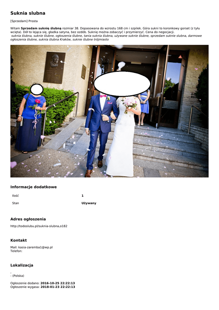 Suknia slubna [Sprzedam] Prosta Witam Sprzedam suknię ślubną rozmiar 38. Dopasowana do wzrostu 168 cm i szpilek. Góra sukni to koronkowy gorset (z tyłu wcięta). Dół to lejąca się, gładka satyna, bez ozdób. Suknię można zobaczyć i przymierzyć. Cena do negocjacji. suknia ślubna, suknie ślubne, ogłoszenia ślubne, tania suknia ślubna, używane suknie ślubne, sprzedam suknie slubna, darmowe ogłoszenia ślubne, suknia ślubna Kraków, suknie ślubne trójmiasto Informacje dodatkowe Ilość 1 Stan Używany Adres ogłoszenia http://todoslubu.pl/suknia-slubna,o182 Kontakt Mail: [email protected] Telefon: Lokalizacja , - (Polska) Ogłoszenie dodano: 2016-10-25 22:22:13 Ogłoszenie wygasa: 2018-01-23 22:22:13 Powered by TCPDF (www.tcpdf.org)