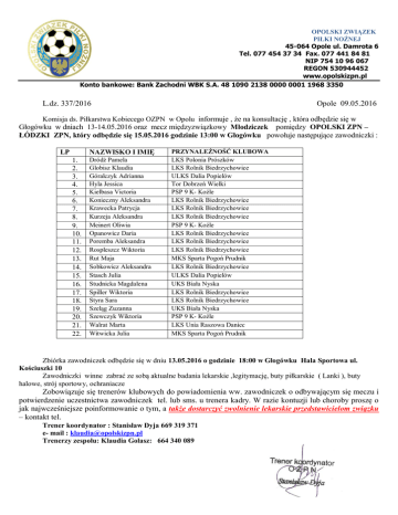 OPOLSKI ZWIĄZEK PIŁKI NOŻNEJ 45-064 Opole ul. Damrota 6 Tel. 077 454 37 34 Fax. 077 441 84 81 NIP 754 10 96 067 REGON 530944452 www.opolskizpn.pl Konto bankowe: Bank Zachodni WBK S.A. 48 1090 2138 0000 0001 1968 3350 L.dz. 337/2016 Opole 09.05.2016 Komisja ds. Piłkarstwa Kobiecego OZPN w Opolu informuje , że na konsultację , która odbędzie się w Głogówku w dniach 13-14.05.2016 oraz mecz międzyzwiązkowy Młodziczek pomiędzy OPOLSKI ZPN – ŁÓDZKI ZPN, który odbędzie się 15.05.2016 godzinie 13:00 w Głogówku powołuje następujące zawodniczki : NAZWISKO I IMIĘ LP 1. 2. 3. 4. 5. 6. 7. 8. 9. 10. 11. 12. 13. 14. 15. 16. 17. 18. 19. 20. 21. 22. Dródż Pamela Globisz Klaudia Góralczyk Adrianna Hyla Jessica Kielbasa Victoria Konieczny Aleksandra Krawecka Patrycja Kurzeja Aleksandra Meinert Oliwia Opanowicz Daria Poremba Aleksandra Rospleszcz Wiktoria Rut Maja Sobkowicz Aleksandra Stasch Julia Studnicka Magdalena Spiller Wiktoria Styra Sara Szeląg Zuzanna Szewczyk Wiktoria Walrat Marta Witwicka Julia PRZYNALEŻNOŚĆ KLUBOWA LKS Polonia Prószków LKS Rolnik Biedrzychowice ULKS Dalia Popielów Tor Dobrzeń Wielki PSP 9 K- Koźle LKS Rolnik Biedrzychowice LKS Rolnik Biedrzychowice LKS Rolnik Biedrzychowice PSP 9 K- Koźle LKS Rolnik Biedrzychowice LKS Rolnik Biedrzychowice LKS Rolnik Biedrzychowice MKS Sparta Pogoń Prudnik LKS Rolnik Biedrzychowice ULKS Dalia Popielów UKS Biała Nyska LKS Rolnik Biedrzychowice LKS Rolnik Biedrzychowice UKS Biała Nyska PSP 9 K- Koźle LKS Unia Raszowa Daniec MKS Sparta Pogoń Prudnik Zbiórka zawodniczek odbędzie się w dniu 13.05.2016 o godzinie 18:00 w Głogówku Hala Sportowa ul. Kościuszki 10 Zawodniczki winne zabrać ze sobą aktualne badania lekarskie ,legitymację, buty piłkarskie ( Lanki ), buty halowe, strój sportowy, ochraniacze Zobowiązuje się trenerów klubowych do powiadomienia ww. zawodniczek o odbywającym się meczu i potwierdzenie uczestnictwa zawodniczek tel. lub sms. u trenera kadry. W razie kontuzji lub choroby proszę o jak najwcześniejsze poinformowanie o tym, a także dostarczyć zwolnienie lekarskie przedstawicielom związku – kontakt tel. Trener koordynator : Stanisław Dyja 669 319 371 e- mail : [email protected] Trenerzy zespołu: Klaudia Golasz: 664 340 089
