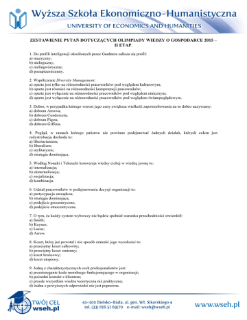 ZESTAWIENIE PYTAŃ DOTYCZĄCYCH OLIMPIADY WIEDZY O GOSPODARCE 2015 – II ETAP. 1. Do profili inteligencji określonych przez Gardnera zalicza się profil: a) muzyczny; b) nielogiczny; c) nielingwistyczny; d) pozaprzestrzenny. 2. Współczesne Diversity Management: a) oparte jest tylko na różnorodności pracowników pod względem kulturowym; b) oparte jest również na różnorodności kompetencji pracowników; c) oparte jest wyłącznie na różnorodności pracowników pod względem etnicznym; d) oparte jest wyłącznie na różnorodności pracowników pod względem światopoglądowym. 3. Dobro, w przypadku którego wzrost jego ceny zwiększa wielkość zapotrzebowania na to dobro nazywamy: a) dobrem Arrowa; b) dobrem Condorceta; c) dobrem Pigou; d) dobrem Giffena. 4. Pogląd, w ramach którego państwo nie powinno podejmować żadnych działań, których celem jest redystrybucja dochodu to: a) libertarianizm; b) liberalizm; c) utylitaryzm; d) strategia dominująca. 5. Według Nonaki i Tekeuchi konwersja wiedzy cichej w wiedzę jawną to: a) internalizacja; b) eksternalizacja; c) socjalizacja; d) kombinacja. 6. Udział pracowników w podejmowaniu decyzji organizacji to: a) partycypacja zarządcza; b) strategia dominująca; c) podejście geocentryczne; d) podejście etnocentryczne. 7. O tym, że każdy system wyborczy nie będzie spełniał warunku przechodniości stwierdził: a) Smith; b) Keynes; c) Lucas; d) Arrow. 8. Koszt, który już powstał i nie sposób zmienić jego wysokości to: a) przeciętny koszt całkowity; b) przeciętny koszt zmienny; c) koszt krańcowy; d) koszt utopiony. 9. Jedną z charakterystycznych cech profesjonalistów jest: a) przestrzeganie kodu moralnego funkcjonującego w organizacji; b) pośredni kontakt z klientem; c) przede wszystkim wiedza teoretyczna niż praktyczna; d) żadna z powyższych odpowiedzi nie jest poprawna. 10. Produkt oryginalny (nowy) to produkt: a) etyczny; b) nieestetyczny; c) niepragmatyczny; d) stworzony na podstawie nieprawdziwych informacji. 11. Motywacja autoteliczna pracowników wiedzy to motywacja: a) egzogeniczna; b) zewnętrzna; c) samoistna; d) żadna z powyższych odpowiedzi nie jest poprawna. 12. Wartość eksportu danego kraju pomniejszona o wartość jego importu to: a) eksport brutto; b) eksport netto; c) eksport całkowity; d) żadna z powyższych odpowiedzi nie jest poprawna. 13. Większa różnorodność dóbr jest korzyścią z: a) inflacji; b) wyższych podatków; c) handlu międzynarodowego; d) żadna z powyższych odpowiedzi nie jest poprawna. 14. W latach 1973-1974 był największy: a) szok naftowy; b) szok podatkowy; c) szok walutowy; d) żadna z powyższych odpowiedzi nie jest poprawna. 15. Głosowanie większościowe, które może nie doprowadzić do powstania przechodnich preferencji społeczeństwa odnosi się do: a) paradoksu Friedman’a; b) paradoksu Smith’a; c) paradoksu Condorcet’a; d) żadna z powyższych odpowiedzi nie jest poprawna. 16. A. Smith wprowadził do ekonomii pojęcie: a) podatku progresywnego; b) niewidzialnej ręki; c) inflacji; d) żadna z powyższych odpowiedzi nie jest poprawna. 17. Możliwość odchylenia od stanu oczekiwanego, którą można zmierzyć to: a) ryzyko; b) niepewność; c) efektywność; d) żadna z powyższych odpowiedzi nie jest poprawna. 18. Miarą dochodu całkowitego, uzyskanego przez stałych mieszkańców kraju jest: a) PKB; b) PNB; c) CPI; d) żadna z powyższych odpowiedzi nie jest poprawna. 19. Wartość produkcji dóbr i usług z uwzględnieniem inflacji to: a) realny PNB; b) realny PKB; c) nominalny PKB; d) żadna z powyższych odpowiedzi nie jest poprawna. 20. Miarą kosztu całkowitego dóbr i usług, kupowanych przez typowego nabywcę jest: a) CPI; b) PKB; c) PNB; d) żadna z powyższych odpowiedzi nie jest poprawna. 21. W teorii motywacji A. Maslowa nie występuje potrzeba: a) samorealizacji; b) przynależności; c) braku bezpieczeństwa; d) żadna z powyższych odpowiedzi nie jest poprawna. 22. Nasilanie się procesów globalizacyjnych jest cechą: a) gospodarki przemysłowej; b) gospodarki rolnej; c) gospodarki opartej na wiedzy; d) żadna z powyższych odpowiedzi nie jest poprawna. 23. Efektywność różni się od skuteczności tym, że: a) przy skuteczności bierze się pod uwagę koszty organizacji; b) przy efektywności nie bierze się pod uwagę kosztów organizacji; c) przy efektywności bierze się pod uwagę koszty organizacji, a przy skuteczności nie; d) żadna z powyższych odpowiedzi nie jest poprawna. 24. Kryzys finansowy to: a) sytuacja, w której znaczna grupa instytucji finansowych posiada aktywa o wartości rynkowej wyższej od ich zobowiązań; b) sytuacja, w której znaczna grupa instytucji finansowych posiada aktywa o wartości rynkowej niższej od ich zobowiązań; c) sytuacja, w której znaczna grupa instytucji finansowych posiada aktywa o wartości rynkowej równej ich zobowiązaniom; d) sytuacja, w której występuje znaczny wzrost cen aktywów. 25. Safety Net to: a) sieć bezpieczeństwa finansowego; b) sieć bezpieczeństwa politycznego; c) sieć bezpieczeństwa prawnego; d) sieć bezpieczeństwa biznesowego. 26. Do reżimów kursowych nie zalicza się: a) reżim kursów stałych; b) reżim kursów umiarkowanych; c) reżim kursów pośrednich; d) reżim kursów płynnych. 27. NBP wprowadził w 2008 r. „pakiet zaufania” zawierający działania, które miały koncentrować się na osiągnięciu celu, tj.: a) uniemożliwienie bankom pozyskiwania środków złotowych na okresy dłuższe niż jeden dzień; b) uniemożliwienie bankom pozyskiwania środków walutowych; c) zwiększenie możliwości pozyskiwania płynności złotowej przez banki poprzez rozszerzenie zabezpieczeń operacji z NBP; d) zmniejszenie możliwości pozyskiwania płynności złotowej przez banki poprzez rozszerzenie zabezpieczeń operacji z NBP. 28. Kulturą organizacyjną o charakterze proelastycznościowym jest kultura: a) innowacyjna; b) zachowawcza;