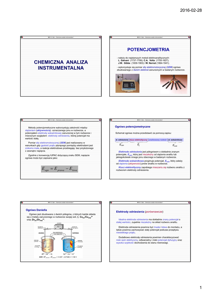 2016-02-28 W III B. Baś „Chemiczna analiza instrumentalna” W III B. Baś „Chemiczna analiza instrumentalna” POTENCJOMETRIA CHEMICZNA ANALIZA INSTRUMENTALNA - należy do najstarszych metod elektroanalitycznych: L. Galvani (1737-1799); C.A. Volta (1755-1827); J.W. Gibbs (1839-1903) i W. Nernst (1864-1941). - wykorzystuje się pomiar siły elektromotorycznej (SEM) ogniwa zbudowanego z dwóch elektrod zanurzonych w badanym roztworze. W III B. Baś „Chemiczna analiza instrumentalna” Metody potencjometryczne wykorzystują zależność między stężeniem (aktywnością) oznaczanego jonu w roztworze, a potencjałem elektrody wskaźnikowej zanurzonej w tym roztworze i mierzonym względem elektrody odniesienia, której potencjał ma wartość stałą. Pomiar siły elektromotorycznej (SEM) jest realizowany w warunkach gdy gęstość prądu płynącego pomiędzy elektrodami jest znikomo mała, a reakcje elektrodowe przebiegają bez przyłożonego z zewnątrz napięcia. Zgodnie z konwencją IUPAC dotyczącą znaku SEM, napięcie ogniwa może być zapisane jako: W III B. Baś „Chemiczna analiza instrumentalna” Ogniwo potencjometryczne Schemat ogniwa można przedstawić za pomocą zapisu: el. odniesienia │klucz elektrolityczny │analizowany roztwór │el. wskaźnikowa Eodn Ej Ewsk Elektroda odniesienia jest półogniwem o dokładnie znanym potencjale, Eodn, który jest niezależny od stężenia analitu lub jakiegokolwiek innego jonu obecnego w badanym roztworze. Elektroda wskaźnikowa przyjmuje potencjał, Ewsk, który zależy od stężenia (aktywności) jonów analitu w roztworze. E ogn E prawa E lewa W III B. Baś „Chemiczna analiza instrumentalna” Ogniwo Daniella Ogniwo jest zbudowane z dwóch półogniw, z których każde składa się z metalu zanurzonego w roztworze swojej soli, tj. Cu(s)/Cu(aq)2+ oraz Zn(s)/Zn(aq)2+. Klucz elektrolityczny zapobiega mieszaniu się roztworu analitu z roztworem elektrody odniesienia. W III B. Baś „Chemiczna analiza instrumentalna” Elektrody odniesienia (porównawcze) Idealna elektroda odniesienia ma dokładnie znany potencjał o stałej wartości, zupełnie niezależny na skład roztworu analitu. Elektroda odniesienia powinna być trwała i łatwa do montażu, a także powinna zachowywać stały potencjał podczas przepływu niewielkiego prądu. Dodatkowo elektrodę odniesienia powinien charakteryzować niski opór elektryczny, odtwarzalny i niski potencjał dyfuzyjny oraz wysoka szybkość dochodzenia do stanu równowagi. 1 2016-02-28 W III B. Baś „Chemiczna analiza instrumentalna” W III B. Baś „Chemiczna analiza instrumentalna” Elektroda chlorosrebrowa (Ag│AgCl│KCl║) Elektrody wskaźnikowe Półogniwo, z elektrodą srebrową zanurzoną w roztworze chlorku potasu i chlorku srebra. Schemat ogniwa: Ag │AgCl(nas.), KCl(aq) ║ Idealna elektroda wskaźnikowa powinna reagować szybko i odtwarzalnie na zmiany stężenia analizowanego jonu (lub grupy analizowanych jonów). Reakcja połówkowa: AgCl(s) + e ↔ Ag(s) + Cl-. Potencjał elektrody Ag│AgCl│KCl i stałej temperatury: 0 E Ag / AgCl E Ag / AgCl 0.059 log aCl W III B. Baś „Chemiczna analiza instrumentalna” Wskaźnikowe elektrody metaliczne Nie ma elektrody wskaźnikowej idealnie specyficznej. Spotyka się jedynie elektrody, które są tylko selektywne. Wyróżnia się trzy główne rodzaje elektrod wskaźnikowych: - elektrody metaliczne (I, II i III rodzaju) - elektrody redoks - elektrody membranowe (jonoselektywne) - ze szklanymi membranami - ze stałymi membranami - z ciekłymi membranami - z podwójnymi membranami (elektrody gazowe i enzymatyczne) W III B. Baś „Chemiczna analiza instrumentalna” Elektroda szklana do pomiarów pH - klasyfikuje się na elektrody pierwszego, I, drugiego, II, trzeciego, III, rodzaju i obojętne elektrody redoks (utleniająco-redukujące). 1906 – Cremer opisał zależność potencjału membrany szklanej od pH Elektroda I rodzaju 1909 – Haber, Klemensiewicz opisali konstrukcję elektrody szklanej jest elektrodą z czystego metalu pozostającego w równowadze z własnymi kationami obecnymi w roztworze: Me n (aq ) ne Me( s ) stąd potencjał elektrody: 0 E wsk E Me n / Me 0.0592 1 0.0592 0 log E Me pX n / Me n a Me n n W III B. Baś „Chemiczna analiza instrumentalna” Elektroda szklana zawiera cienką, czułą na zmiany pH szklaną membranę przytopioną do końca grubościennej szklanej rurki. Wewnątrz rurki znajduje się roztwór kwasu solnego (0.1 mol/L) nasycony chlorkiem srebra, drut srebrny pokryty AgCl i zanurzony w tym roztworze tworzy chlorosrebrową elektrodę odniesienia. W III B. Baś „Chemiczna analiza instrumentalna” Równanie Nernsta Potencjał elektrody wskazuje, jak stężenia indywiduów w półogniwie różnią się od ich wartości równowagowych. Dla reakcji: aA bB ... ne cC dD ... potencjał elektrodowy dla tego procesu określa równanie: E E0 RT [C ]c [ D] d ... ln nF [ A] a [ B]b ... E0 - standardowy potencjał elektrody (aMe+n = 1) R - stała gazowa (8.314 J·K-1· mol-1); T - temperatura w kelwinach, K F - stała Faradaya (96 500 C·mol-1); n - liczba elektronów. Jeżeli A jest indywiduum rozpuszczonym w roztworze, to [A] jest jego stężeniem [mol/L] (aktywnością); jeżeli A jest gazem to [A] jest ciśnieniem cząstkowym, pA , [atm]; jeżeli A jest cieczą, ciałem stałym lub rozpuszczalnikiem jego aktywność wynosi 1. 2 2016-02-28 W III B. Baś „Chemiczna analiza instrumentalna” W III B. Baś „Chemiczna analiza instrumentalna” Metody potencjometryczne Miareczkowanie podstawowe pojęcia - potencjometria bezpośrednia polega na wyznaczeniu stężenia oznaczanego składnika na podstawie wcześniej przygotowanej krzywej kalibracyjnej sporządzonej w oparciu o roztwory wzorcowe. - potencjometria pośrednia wykonuje się miareczkowanie roztworów i wyznacza zmianę SEM ogniwa wywołaną dodaniem titranta do roztworu badanego. Następnie wyznacza się punkt końcowy miareczkowani