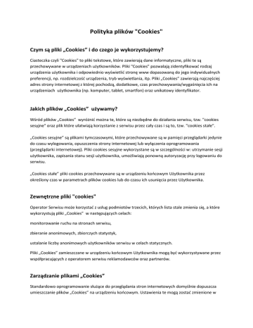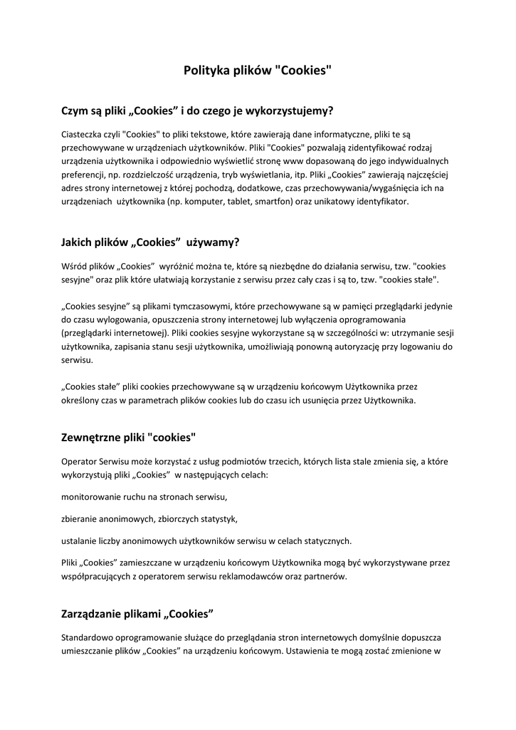 Polityka plików "Cookies" Czym są pliki „Cookies” i do czego je wykorzystujemy? Ciasteczka czyli "Cookies" to pliki tekstowe, które zawierają dane informatyczne, pliki te są przechowywane w urządzeniach użytkowników. Pliki "Cookies" pozwalają zidentyfikować rodzaj urządzenia użytkownika i odpowiednio wyświetlić stronę www dopasowaną do jego indywidualnych preferencji, np. rozdzielczość urządzenia, tryb wyświetlania, itp. Pliki „Cookies” zawierają najczęściej adres strony internetowej z której pochodzą, dodatkowe, czas przechowywania/wygaśnięcia ich na urządzeniach użytkownika (np. komputer, tablet, smartfon) oraz unikatowy identyfikator. Jakich plików „Cookies” używamy? Wśród plików „Cookies” wyróżnić można te, które są niezbędne do działania serwisu, tzw. "cookies sesyjne" oraz plik które ułatwiają korzystanie z serwisu przez cały czas i są to, tzw. "cookies stałe". „Cookies sesyjne” są plikami tymczasowymi, które przechowywane są w pamięci przeglądarki jedynie do czasu wylogowania, opuszczenia strony internetowej lub wyłączenia oprogramowania (przeglądarki internetowej). Pliki cookies sesyjne wykorzystane są w szczególności w: utrzymanie sesji użytkownika, zapisania stanu sesji użytkownika, umożliwiają ponowną autoryzację przy logowaniu do serwisu. „Cookies stałe” pliki cookies przechowywane są w urządzeniu końcowym Użytkownika przez określony czas w parametrach plików cookies lub do czasu ich usunięcia przez Użytkownika. Zewnętrzne pliki "cookies" Operator Serwisu może korzystać z usług podmiotów trzecich, których lista stale zmienia się, a które wykorzystują pliki „Cookies” w następujących celach: monitorowanie ruchu na stronach serwisu, zbieranie anonimowych, zbiorczych statystyk, ustalanie liczby anonimowych użytkowników serwisu w celach statycznych. Pliki „Cookies” zamieszczane w urządzeniu końcowym Użytkownika mogą być wykorzystywane przez współpracujących z operatorem serwisu reklamodawców oraz partnerów. Zarządzanie plikami „Cookies” Standardowo oprogramowanie służące do przeglądania stron internetowych domyślnie dopuszcza umieszczanie plików „Cookies” na urządzeniu końcowym. Ustawienia te mogą zostać zmienione w taki sposób, aby blokować automatyczną obsługę plików „Cookies” w ustawieniach przeglądarki internetowej bądź informować o ich każdorazowym przesłaniu na urządzenie użytkownika. Szczegółowe informacje o możliwości i sposobach obsługi plików „Cookies” dostępne są w ustawieniach oprogramowania (przeglądarki internetowej). Ograniczenie stosowania plików „Cookies”, może wpłynąć na niektóre funkcjonalności dostępne na stronie internetowej. Informujemy, że ograniczenia stosowania plików „Cookies” mogą zablokować korzystanie z niektórych funkcjonalności dostępnych na stronach internetowych serwisu www. Więcej informacji o plikach "Cookies"