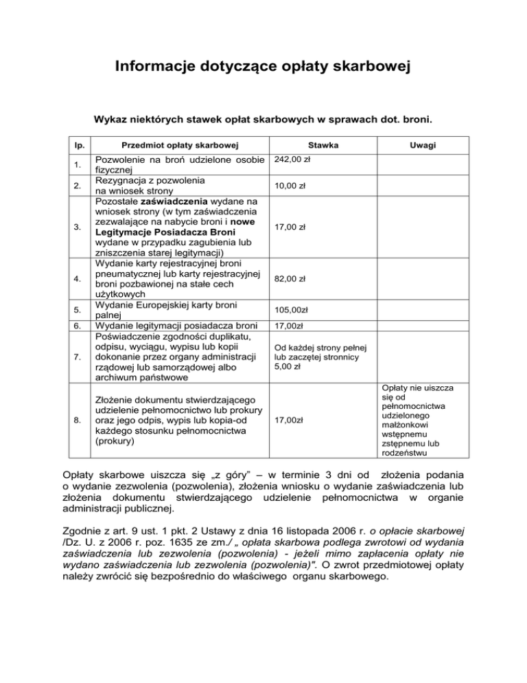 Informacje dotyczące opłaty skarbowej Wykaz niektórych stawek opłat skarbowych w sprawach dot. broni. lp. 1. 2. 3. 4. 5. 6. 7. 8. Przedmiot opłaty skarbowej Pozwolenie na broń udzielone osobie fizycznej Rezygnacja z pozwolenia na wniosek strony Pozostałe zaświadczenia wydane na wniosek strony (w tym zaświadczenia zezwalające na nabycie broni i nowe Legitymacje Posiadacza Broni wydane w przypadku zagubienia lub zniszczenia starej legitymacji) Wydanie karty rejestracyjnej broni pneumatycznej lub karty rejestracyjnej broni pozbawionej na stałe cech użytkowych Wydanie Europejskiej karty broni palnej Wydanie legitymacji posiadacza broni Poświadczenie zgodności duplikatu, odpisu, wyciągu, wypisu lub kopii dokonanie przez organy administracji rządowej lub samorządowej albo archiwum państwowe Złożenie dokumentu stwierdzającego udzielenie pełnomocnictwo lub prokury oraz jego odpis, wypis lub kopia-od każdego stosunku pełnomocnictwa (prokury) Stawka Uwagi 242,00 zł 10,00 zł 17,00 zł 82,00 zł 105,00zł 17,00zł Od każdej strony pełnej lub zaczętej stronnicy 5,00 zł 17,00zł Opłaty nie uiszcza się od pełnomocnictwa udzielonego małżonkowi wstępnemu zstępnemu lub rodzeństwu Opłaty skarbowe uiszcza się „z góry” – w terminie 3 dni od złożenia podania o wydanie zezwolenia (pozwolenia), złożenia wniosku o wydanie zaświadczenia lub złożenia dokumentu stwierdzającego udzielenie pełnomocnictwa w organie administracji publicznej. Zgodnie z art. 9 ust. 1 pkt. 2 Ustawy z dnia 16 listopada 2006 r. o opłacie skarbowej /Dz. U. z 2006 r. poz. 1635 ze zm./ „ opłata skarbowa podlega zwrotowi od wydania zaświadczenia lub zezwolenia (pozwolenia) - jeżeli mimo zapłacenia opłaty nie wydano zaświadczenia lub zezwolenia (pozwolenia)". O zwrot przedmiotowej opłaty należy zwrócić się bezpośrednio do właściwego organu skarbowego. UWAGA! Zgodnie z opinią Departamentu Podatków Lokalnych Ministerstwa Finansów z dnia 11 marca 2015r.( znak l.dz. PL-LM.836.14.2015 ) wniosek o zmianę posiadanego pozwolenia na broń (np. w zakresie ilości egzemplarzy) w trybie art. 155 kpa nie wymaga uiszczenia opłaty skarbowej. Ww. zasady nie dotyczą osób, którym prawo do posiadania broni wydano przed zmianą przepisów ustawy o broni i amunicji, tj. do dnia 10 marca 2011 r. włącznie. Osoby te z uwagi na inną podstawę prawną prowadzonego postępowania (art.10 ustawy o broni i amunicji) zobowiązane są do uiszczenia wymienionej opłaty skarbowej.