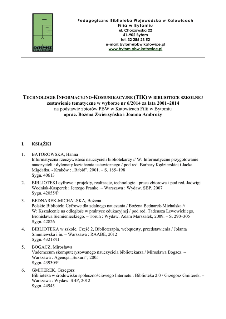 P eda go gi cz na B ibl io t ek a W oj e w ód zk a w K ato w ic ac h Filia w Bytomiu ul. Chorzowska 22 41-902 Bytom tel. 32 286 23 52 e-mail: [email protected] www.bytom.pbw.katowice.pl TECHNOLOGIE INFORMACYJNO-KOMUNIKACYJNE (TIK) W BIBLIOTECE SZKOLNEJ zestawienie tematyczne w wyborze nr 6/2014 za lata 2001–2014 na podstawie zbiorów PBW w Katowicach Filii w Bytomiu oprac. Bożena Zwierzyńska i Joanna Ambroży I. KSIĄŻKI 1. BATOROWSKA, Hanna Informatyczna rzeczywistość nauczycieli bibliotekarzy // W: Informatyczne przygotowanie nauczycieli : dylematy kształcenia ustawicznego / pod red. Barbary Kędzierskiej i Jacka Migdałka. - Kraków : „Rabid”, 2001. – S. 185–198 Sygn. 40613 2. BIBLIOTEKI cyfrowe : projekty, realizacje, technologie : praca zbiorowa / pod red. Jadwigi Wodniak-Kasperek i Jerzego Franke. – Warszawa : Wydaw. SBP, 2007 Sygn. 42055/P 3. BEDNAREK-MICHALSKA, Bożena Polskie Biblioteki Cyfrowe dla zdalnego nauczania / Bożena Bednarek-Michalska // W: Kształcenie na odległość w praktyce edukacyjnej / pod red. Tadeusza Lewowickiego, Bronisława Siemienieckiego. – Toruń : Wydaw. Adam Marszałek, 2009. – S. 290–305 Sygn. 42826 4. BIBLIOTEKA w szkole. Część 2, Biblioterapia, webquesty, przedstawienia / Jolanta Smuniewska i in. – Warszawa : RAABE, 2012 Sygn. 43218/II 5. BOGACZ, Mirosława Vademecum skomputeryzowanego nauczyciela bibliotekarza / Mirosława Bogacz. – Warszawa : Agencja „Sukurs”, 2005 Sygn. 43930/P 6. GMITEREK, Grzegorz Biblioteka w środowisku społecznościowego Internetu : Biblioteka 2.0 / Grzegorz Gmiterek. – Warszawa : Wydaw. SBP, 2012 Sygn. 44945 7. JANISZEWSKA, Kamila Elektroniczne dostarczanie dokumentów / Kamila Janiszewska. – Warszawa : Wydaw. SBP, 2003 Sygn. 40802/P 8. PULAK, Irena Kompetencje informacyjne i medialne nauczyciela/ucznia we współczesnym świecie / Irena Pulak, Małgorzata Wieczorek-Tomaszewska // W: Edukacja w przebiegu życia : od dzieciństwa do starości / red. nauk. Mirosław Kowalski, Agnieszka Kolczak. – Kraków : „Impuls”, 2014. – S. 79–91 Sygn. 44970 9. RAIZES-DZIEDUSZYCKI, Jerzy Technologie informacyjne w bibliotece // W: Bibliotekarstwo / pod red. Anny Tokarskiej. – Warszawa : Wydaw. SBP, 2013. – S. 405–416 Sygn. 44946/P 10. WOJCIECHOWSKI, Jacek O bibliotekach po mojemu / Jacek Wojciechowski. – Warszawa : Wydaw. SBP, 2012. – S. 192–19: Usługi na dystans : biblioteka w kieszeni Sygn. 44959/P II. ARTYKUŁY Z CZASOPISM 11. ARKABUS, Agata Cloud computing w bibliotece / Agata Arkabus // Biblioteka Centrum Informacji. – 2014, nr 1, s. 9–12 Usługi Google 12. BASAJ, Hanna Mój własny e-book w sieci / Hanna Basaj // Biblioteka Centrum Informacji. – 2012, nr 3, s. 10–11 Propozycja osadzania w Internecie np. publikacji uczniów 13. BASAJ, Hanna Mówiące fotografie, czyli talking photo / Hanna Basaj // Biblioteka Centrum Informacji. – 2013, nr 1, s. 16–18 Aplikacje Fotobabble i Blabberize - narzędzia, pozwalające dodać dźwiękowy komentarz do zdjęć, zamieszczonych w witrynie biblioteki czy na portalu społecznościowym. Propozycja dla kółek bibliotecznych 14. BASAJ, Hanna Warto poznać Scoop.it! / Hanna Basaj // Biblioteka Centrum Informacji. – 2012, nr 3, 14–15 Bezpłatny serwis do gromadzenia i porządkowania stron WWW, polecany nauczycielom bibliotekarzom oraz uczniom, poszukującym informacji 15. BIELAWSKI, Wiesław Rozwijamy sprawność ortograficzną przy wykorzystaniu programu Microsoft Word i Słownika poprawnej polszczyzny : scenariusz zajęć w gimnazjum związany z realizacją ścieżki edukacja czytelnicza i medialna / Wiesław Bielawski // Biblioteka w Szkole. – 2004, nr 9, s. 17 16. BOGACZ, Mirosława eTwinning na godzinie karcianej / Mirosława Bogacz // Biblioteka Centrum Informacji. – 2010, nr, 3, s. 10 Projekt Outdoor Library biblioteki szkoły ponadgimnazjalnej 2 17. BOGACZ, Mirosława O karaoke w ICIM / Mirosława Bogacz // Biblioteka Centrum Informacji. – 2009, nr 4, s. 19 Pomysły na wszechstronne zastosowania edukacyjne karaoke z wykorzystaniem strony www.ewa.bicom.pl 18. BOGACZ, Mirosława Pomóż mi to zrobić samemu : jak ICIM zmienia szkolną edukację / Mirosława Bogacz // Biblioteka Centrum Informacji. – 2009, nr 2, s. 3–5 19. BOGACZ, Mirosława Praca z maturzystą w SCI : inny pomysł na „godzinę karcianą” / Mirosława Bogacz // Biblioteka Centrum Informacji. – 2010, nr, 3, s. 12 Nauka sporządzania bibliografii załącznikowej 20. BOGACZ, Mirosława Szkolne centrum uczenia się w 2025 r. : prognozy / Mirosława Bogacz // Biblioteka Centrum Informacji. – 2014, nr 2, s. 3–5 21. BONK, Gabriela Prezentacja dobra na wszystko : czyli prezentacje multimedialne w pracy biblioteki szkolnej i nauczyciela bibliotekarza / Gabriela Bonk // Biblioteka Centrum Informacji. – 2009, nr 2, s. 6–9 22. BONK, Gabriela Promocja biblioteki szkolnej w Internecie / Gabriela Bonk, Anna Urbaniak // Biblioteka Centrum Informacji. – 2013, nr1, s. 8–11 Wskazówki dotyczące budowy witryny biblioteki szkolnej 23. BORYCZKA, Bożena E-książeczki : pomysł na pracę z czytelnikiem / Bożena Boryczka // Biblioteka Centrum Informacji. – 2012, nr 3, s. 12–14 Aplikacje dla dzieci – Storybird i StoryJumper 24. BORYCZKA, Bożena eTwinning w multimedialnym centrum informacji / Bożena Boryczka // Biblioteka Centrum Informacji. – 2008, nr 2, s. 1–2 Ogólnopolski konkurs dla nauczycieli bibliotekarzy 25. BORYCZKA, Bożena Jesteś dziennikarzem – jesteś wzorem : o projekcie Junior Media / Bożena Boryczka // Biblioteka Centrum Informacji. – 2013, nr 1, s. 19 Internetowa platforma „Redakcja on-line”. Tworzenie e-gazetek szkolnych 26. BORYCZKA, Bożena Szukamy swoich korzeni / Bożena Boryczka // Biblioteka Centrum Informacji. – 2012, nr 4, s. 8–10 Serwisy internetowe, pomocne w tworzeniu własnego drzewa genealogicznego. Pomysł na zajęcia w bibliotece szkolnej 27. BORYCZKA, Bożena Wix – to całkiem proste