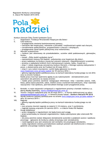 Regulamin Konkursu Literackiego 6. edycji Pól Nadziei 2015/2016 Konkurs literacki Żółty Żonkil Symbolem Życia I. Organizator: Fundacja Wrocławskie Hospicjum dla Dzieci II. Cele konkursu • propagowanie niesienia bezinteresownej pomocy, • szerzenie idei hospicyjnej, mówienie o potrzebie i możliwościach opieki nad chorymi, • uwrażliwianie społeczeństwa, przypominanie o chorych i cierpiących, • propagowanie zasad opieki paliatywnej oraz wolontariatu. III. Warunki uczestnictwa IV. • konkurs jest skierowany do przedszkolaków, uczniów szkół podstawowych, gimnazjów, liceów, • temat: „Żółty żonkil symbolem życia”, • zastosowanie motywu Pól Nadziei, wolontariatu oraz hospicjum dla dzieci, • prace nadesłane na Konkurs muszą być pracami własnymi, niepublikowanymi wcześniej. • prosimy o nadsyłanie krótkich form wierszowanych (sonety, haiku, fraszki etc.) • etap 1: szkoły organizują wewnętrzny konkurs literacki, z którego wyłonią maksymalnie 3 prace, o dostarczenie prac do Fundacji do 20 maja 2015 r., • etap 2: jury wyłoni zwycięzców; wyniki będą ogłoszone na stronie www.hospicjum.wroc.pl/pola-nadziei do 10 czerwca 2016 r., • główną nagrodą będzie publikacja pracy na kartach kalendarza fundacyjnego na rok 2016 oraz na stronie fundacji. Każda praca musi być opatrzona zgodą na jej wykorzystanie – oświadczeniem praw autorskich (do pobrania na naszej stronie) • każda praca powinna zawierać następujące informacje: imię i nazwisko autora, wiek, klasa, pełna nazwa placówki, adres, telefon (wraz z numerem kierunkowym), imię i nazwisko nauczyciela i/lub opiekuna, pod kierunkiem którego uczeń przygotował pracę. V. VI. VII. VIII. IX. Kontakt: w razie niejasności związanych z regulaminem prosimy o kontakt mailowy z p. Martą Międłą-Opalińską, [email protected] . Termin i miejsce nadsyłania prac do 20 maja 2015 r., w formie elektronicznej na adres: [email protected] ; w temacie proszę wpisać : Konkurs literacki PN 2016 Wyniki konkursu zostaną zamieszczone na stronie www.hospicjum.wroc.pl/pola-nadziei w dniu 10 czerwca 2015 r. Nagrody • główną nagrodą będzie publikacja pracy na kartach kalendarza fundacyjnego na rok 2016. • jury przyzna również nagrody za zajęcie II i III miejsca, oraz 3 wyróżnienia, • nagrody zostaną wręczone 24 czerwca 2015 r. w trakcie finału Pól Nadziei. Uwagi dodatkowe • prace niezgodne z regulaminem nie będą brane pod uwagę, • prace przechodzą na własność organizatorów i będą wykorzystane jako wizerunek Pól Nadziei, • do pracy powinno zostać dołączone oświadczenie autorskie z podpisem autora i opiekuna prawnego – zgłoszone do konkursu szkoły otrzymają wzór oświadczenia • rozstrzygnięcie jury jest ostateczne (od werdyktu nie przysługuje odwołanie), • osoby nagrodzone zostaną powiadomione osobnym pismem lub telefonicznie o miejscu i godzinie uroczystego rozdania nagród.