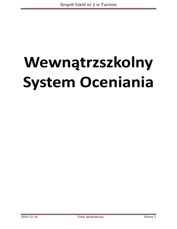 Zespół Szkół nr 2 w Turznie Wewnątrzszkolny System Oceniania 2016-12-14 Tekst ujednolicony Strona 1 Zespół Szkół nr 2 w Turznie §1 1. Zasady oceniania określa Wewnątrzszkolny System Oceniania, który jest wewnętrznym dokumentem Szkoły opiniowanym przez uczniów i rodziców, a zatwierdzanym przez Radę Pedagogiczną. 2. Wewnątrzszkolny System Oceniania obejmuje: 1) PSO 2) wymagania edukacyjne i sposób informowania o nich uczniów i rodziców 3) zasady bieżącego oceniania, w tym: co podlega ocenie, w jakiej formie, w jakich terminach, skalę i sposób formułowania ocen 4) terminy i formę informowania uczniów i rodziców o przewidywanych ocenach klasyfikacyjnych 5) tryb odwoławczy 6) terminy klasyfikacji 7) tryb przeprowadzania egzaminów klasyfikacyjnych i poprawkowych. §2 Założenia ogólne oceniania 1. Ocenianie wewnątrzszkolne osiągnięć edukacyjnych uczniów polega na rozpoznawaniu przez nauczycieli poziomu osiągnięć i postępów w opanowaniu przez ucznia umiejętności i wiadomości wynikających z podstawy programowej i realizowanych programów oraz formułowania ocen. 2 Wszyscy nauczyciele w procesie nauczania dążą do wszechstronnego rozwoju ucznia jako nadrzędnego celu pracy dydaktycznej. Edukacja szkolna na wszystkich etapach polega na harmonijnej realizacji przez nauczycieli zadań w zakresie nauczania, kształcenia umiejętności i wychowania. 3. Nauczyciele w zakresie nauczania zapewniają uczniom w szczególności: 1) naukę poprawnego i swobodnego wypowiadania się, pisania, czytania ze zrozumieniem 2) poznawanie wymaganych terminów i pojęć oraz zdobywanie wiedzy na poziomie umożliwiającym co najmniej kontynuację nauki na następnym etapie edukacyjnym 3) rozumienie, a nie tylko pamięciowe opanowanie przekazywanych treści 4) rozwijanie zdolności dostrzegania różnego rodzaju związków i zależności przyczynowo skutkowych, funkcjonalnych, czasowych, przestrzennych 5) rozwijanie myślenia analitycznego i syntetycznego 6) traktowanie wiadomości przedmiotowych, stanowiących wartość poznawczą samą w sobie, w sposób integralny, prowadzący do lepszego rozumienia świata, ludzi i siebie 7) poznawanie dorobku dziedzictwa kultury narodowej postrzeganej w perspektywie kultury europejskiej. 4. Nauczyciele stwarzają uczniom warunki do nabywania kluczowych umiejętności: 1) planowania, organizowania i oceniania własnej nauki oraz przyjmowania za nią coraz większej odpowiedzialności 2) skutecznego porozumiewania si(p w różnych sytuacjach, prezentacji własnego punktu widzenia i brania pod uwagę poglądów innych ludzi, poprawnego posługiwania się językiem ojczystym, przygotowywania się do publicznych wystąpień 3) efektywnego współdziałania w zespole i pracy w grupie, budowania więzi międzyludzkich, podejmowania indywidualnych i grupowych decyzji, skutecznego działania na gruncie zachowania obowiązujących norm 4) rozwiązywania problemów w twórczy sposób 2016-12-14 Tekst ujednolicony Strona 2 Zespół Szkół nr 2 w Turznie 5) poszukiwania, porządkowania, wykorzystywania informacji z różnych źródeł oraz efektywnego posługiwania się technologią informacyjną 6) zastosowania w praktyce zdobytej wiedzy i umiejętności fizycznych 7) rozwijania sprawności umysłowych oraz osobistych zainteresowań 8) przyswajania sobie metod i technik negocjacyjnego rozwiązywania konfliktów oraz problemów społecznych. 5. Cele oceniania wewnątrzszkolnego: 1) informowanie ucznia i jego rodziców o poziomie osiągnięć edukacyjnych i postępach w tym zakresie 2) udzielanie pomocy uczniowi w planowaniu jego rozwoju 3) motywowanie ucznia do pracy 4) dostarczanie rodzicom i prawnym opiekunom i nauczycielom informacji o postępach, specjalnych uzdolnieniach i trudnościach 5) doskonalenie organizacji i metod pracy dydaktyczno -wychowawczej nauczyciela. 6. Ocenianie wewnątrzszkolne obejmuje: 1) formułowanie przez nauczycieli wymagań edukacyjnych oraz informowanie o nich uczniów i rodziców 2) bieżące ocenianie 3) ustalanie warunków i sposobów poprawy ocen 4) ustalanie ocen semestralnych i rocznych 5) ustalenie warunków i sposobów przeprowadzania egzaminów klasyfikacyjnych, poprawkowych oraz sprawdzianów wiadomości i umiejętności. 7. Zasady oceniania w PSO: 1) rzetelnie 2) sprawiedliwie 3) obiektywnie 4) systematycznie 5) jawnie 6) stosując jasne dla wszystkich kryteria 7) uzasadniania oceny. 8 Oceny dzielą się na 1) bieżące (cząstkowe) 2) klasyfikacyjne śródroczne i roczne. §3 Zasady sprawdzania bieżących osiągnięć szkolnych i sposób ich dokumentowania w klasach 1 - 3 szkoły podstawowej 1. Nauczyciel na początku każdego roku szkolnego informuje uczniów i ich rodziców/prawnych opiekunów o wymaganiach edukacyjnych wynikających z realizowanego przez siebie szczegółowego rozkładu treści nauczania i sposobach sprawdzania osiągnięć edukacyjnych uczniów na swoim przedmiocie. 2. W klasach 1–3 szkoły podstawowej ocena klasyfikacyjna śródroczna i roczna jest oceną opisową, która polega na podsumowaniu zachowania i osiągnięć edukacyjnych. 3. Opis osiągnięć edukacyjnych odbywa się na podstawie obserwacji pracy ucznia, oceniania bieżącego, analizy okresowego sprawdzania wiedzy i umiejętności, zawierającego zestaw zintegrowanych zadań, uwzględniających treść kształcenia z różnych sfer edukacji. 4. Ocena osiągnięć edukacyjnych obejmuje wiadomości i umiejętności w zakresie: a) edukacji polonistycznej: - czytania - sposób czytania znanego i nowego tekstu, tempo, poprawność, 2016-12-14 Tekst ujednolicony Strona 3 Zespół Szkół nr 2 w Turznie rozumienie tekstu, inne walory; - pisania - kształt pisma, łączenie liter, sposób przepisywania, pisanie ze słuchu, rozmieszczenie tekstu na stronicy, przestrzeganie poprawności ortograficznej, samodzielne zapisywanie swoich wypowiedzi, redagowanie i pisanie podstawowych form użytkowych, np. list, życzenia, opis, op