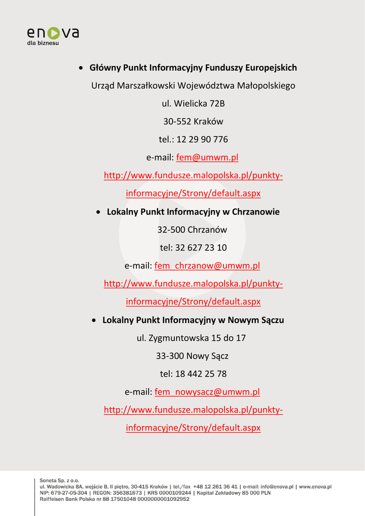 Główny Punkt Informacyjny Funduszy Europejskich Urząd Marszałkowski Województwa Małopolskiego ul. Wielicka 72B 30-552 Kraków tel.: 12 29 90 776 e-mail: [email protected] http://www.fundusze.malopolska.pl/punktyinformacyjne/Strony/default.aspx Lokalny Punkt Informacyjny w Chrzanowie 32-500 Chrzanów tel: 32 627 23 10 e-mail: [email protected] http://www.fundusze.malopolska.pl/punktyinformacyjne/Strony/default.aspx Lokalny Punkt Informacyjny w Nowym Sączu ul. Zygmuntowska 15 do 17 33-300 Nowy Sącz tel: 18 442 25 78 e-mail: [email protected] http://www.fundusze.malopolska.pl/punktyinformacyjne/Strony/default.aspx Lokalny Punkt Informacyjny w Nowym Targ al. 1000-lecia 35 34-400 Nowy Targ tel: 18 266 13 72 e-mail: [email protected] http://www.fundusze.malopolska.pl/punktyinformacyjne/Strony/default.aspx Lokalny Punkt Informacyjny w Tarnowie ul. Szujskiego 66 33-100 Tarnów tel: 14 628 88 12 e-mail: [email protected] http://www.fundusze.malopolska.pl/punktyinformacyjne/Strony/default.aspx Małopolskie Centrum Przedsiębiorczości ul. Jasnogórska 11 31-358 Kraków tel.: 12 376 91 91 e-mail: [email protected] www.mcp.malopolska.pl Informacje o Programie Regionalnym (RPO): Urząd Marszałkowski Województwa Małopolskiego ul. Wielicka 72 30-552 Kraków tel.: 12 299 07 40 e-mail: [email protected] www.fundusze.malopolska.pl/mrpo Informacja o Europejskim Funduszu Społecznym (Program Kapitał Ludzki): Wojewódzki Urząd Pracy w Krakowie Pl. Na Stawach 1 30-107 Kraków tel.: 12 424 07 37 e-mail: [email protected] www.wup-krakow.pl Oddział Zamiejscowy w Tarnowie Al. Solidarności 5-9 33-100 Tarnów tel: 14 626 95 43 e-mail: [email protected] Oddział Zamiejscowy w Nowym Sączu ul. Węgierska 146, 33-300 Nowy Sącz tel: 18 442 94 32 e-mail: [email protected] Regionalne Ośrodki Europejskiego Funduszu Społecznego: Regionalny Ośrodek EFS w Krakowie ul. Szlak 73 a 31-153 Kraków Tel./fax: 12 633 13 06 e-mail: [email protected] www.krakow.roEFS.pl Regionalny Ośrodek EFS w Oświęcimiu ul. Unii Europejskiej 10 32-600 Oświęcim tel.: 33 876 28 12 e-mail: [email protected] www.oswiecim.roEFS.pl Regionalny Ośrodek EFS w Tarnowie ul. Wałowa 2/4, 33-100 Tarnów tel.: 14 655 69 85 e-mail: [email protected] www.tarnow.roEFS.pl Regionalny Ośrodek EFS w Nowym Sączu ul. Nawojowska 4 (III piętro), 33-300 Nowy Sącz Telefon: 18 442 01 99 E-mail: [email protected] www.nowysacz.roEFS.pl Krajowy System Usług dla Małych i Średnich Przedsiębiorstw (nadzorowany przez Polską Agencję Rozwoju Przedsiębiorczości) Informacje o Europejskiej Współpracy Terytorialnej (INTERREG): Urząd Marszałkowski Województwa Małopolskiego ul. Wielicka 72 30-552 Kraków tel.: 12 29 90 699 e-mail: [email protected] www.malopolskie.pl Informacje nt. pomocy dla rolnictwa, produkcji rolno-spożywczej, rybołówstwa oraz przetwórstwa ryb: Agencja Restrukturyzacji i Modernizacji Rolnictwa ul. Lubicz 25 30-503 Kraków tel.: 12 629 80 50 Punkt Informacyjny o Funduszach Europejskich przy Polskiej Agencji Informacji i Inwestycji Zagranicznych S.A. e-mail: [email protected] www.paiz.gov.pl/fundusze www.paiz.gov.pl/pife Krajowa Sieć Obszarów Wiejskich (koordynowana przez Ministerstwo Rolnictwa i Rozwoju Wsi w ramach Programu Rozwoju Obszarów Wiejskich PROW) http://ksow.pl/ Regionalne Centra Informacji Europejskiej (sieć koordynowana przez UKIE) www.ukie.gov.pl Sieć Enterprise Europe Network (powstała na bazie EuroInfo Centre i Innovation Relay Centres, nadzorowana przez Polską Agencję Rozwoju Przedsiębiorczości) http://een.org.pl