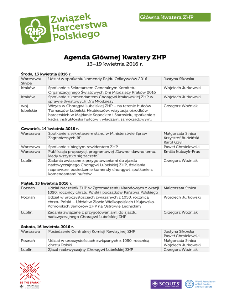 Agenda Głównej Kwatery ZHP 13–19 kwietnia 2016 r. Środa, 13 kwietnia 2016 r. Warszawa/ Udział w spotkaniu komendy Rajdu Odkrywców 2016 Skype Kraków Spotkanie z Sekretarzem Generalnym Komitetu Organizacyjnego Światowych Dni Młodzieży Kraków 2016 Kraków Spotkanie z komendantem Chorągwi Krakowskiej ZHP w sprawie Światowych Dni Młodzieży woj. Wizyta w Chorągwi Lubelskiej ZHP – na terenie hufców lubelskie Tomaszów Lubelski, Hrubieszów, wizytacja ośrodków harcerskich w Majdanie Sopockim i Starosielu, spotkanie z kadrą instruktorską hufców i władzami samorządowymi Czwartek, 14 kwietnia 2016 r. Warszawa Spotkanie z sekretarzem stanu w Ministerstwie Spraw Zagranicznych RP Warszawa Warszawa Spotkanie z biegłym rewidentem ZHP Publikacja propozycji programowej „Dawno, dawno temu, kiedy wszystko się zaczęło” Zadania związane z przygotowaniami do zjazdu nadzwyczajnego Chorągwi Lubelskiej ZHP, działania naprawcze, posiedzenie komendy chorągwi, spotkanie z komendantami hufców Lublin Piątek, 15 kwietnia 2016 r. Poznań Udział Naczelnik ZHP w Zgromadzeniu Narodowym z okazji 1050. rocznicy chrztu Polski i początków Państwa Polskiego Poznań Udział w uroczystościach związanych z 1050. rocznicą chrztu Polski – Udział w Zlocie Wielkopolskich i KujawskoPomorskich Seniorów ZHP na Ostrowie Lednickim Lublin Zadania związane z przygotowaniami do zjazdu nadzwyczajnego Chorągwi Lubelskiej ZHP Sobota, 16 kwietnia 2016 r. Warszawa Posiedzenie Centralnej Komisji Rewizyjnej ZHP Poznań Udział w uroczystościach związanych z 1050. rocznicą chrztu Polski Zjazd nadzwyczajny Chorągwi Lubelskiej ZHP Lublin Justyna Sikorska Wojciech Jurkowski Wojciech Jurkowski Grzegorz Woźniak Małgorzata Sinica Krzysztof Budziński Karol Gzyl Paweł Chmielewski Emilia Kulczyk-Prus Grzegorz Woźniak Małgorzata Sinica Wojciech Jurkowski Grzegorz Woźniak Justyna Sikorska Paweł Chmielewski Małgorzata Sinica Wojciech Jurkowski Grzegorz Woźniak Niedziela, 17 kwietnia 2016 r. Poniedziałek, 18 kwietnia 2016 r. Wrocław Spotkanie z Prezydentem Miasta Wrocławia ws. Central European Jamboree 2016 Wrocław Udział w posiedzeniu komendy Chorągwi Dolnośląskiej ZHP oraz spotkanie z komendą Central European Jamboree 2016 Wrocław Spotkanie z Royal Rangers Polska Gdańsk Robocze spotkanie sztabu organizacyjnego „Zlotu 2018” Gdynia Warszawa/ Skype Posiedzenie Rady Nadzorczej Fundacji Harcerstwa „Centrum Wychowania Morskiego” Spotkanie Harcerskiego Instytutu Badawczego Wtorek, 19 kwietnia 2016 r. Warszawa Posiedzenie Głównej Kwatery ZHP Warszawa Warszawa Gdańsk Gdańsk Warszawa/ Skype Warszawa Spotkanie w Ministerstwie Rodziny, Pracy i Polityki Społecznej ws. Światowych Dni Młodzieży Spotkanie w Kancelarii Prezydenta RP ws. Central European Jamboree oraz Światowych Dni Młodzieży Spotkanie z Zastępcą Prezydenta Miasta Gdańska Piotrem Grzelakiem ws. przygotowań oferty „Jamboree 2023” Spotkanie z przedstawicielami Wydziału Bezpieczeństwa i Zarządzania Kryzysowego Urzędu Miejskiego w Gdańsku w sprawie oferty „Jamboree 2023” Spotkanie Zespołu ds. ewaluacji Strategii Rozwoju ZHP na lata 2012-2017 - Dalsza praca nad raportem, analiza wyników Arkusza Analizy Chorągwi 2015 Udział w Święcie Dowództwa Garnizonu Warszawa Małgorzata Sinica Małgorzata Sinica Małgorzata Sinica Krzysztof Budziński Karol Gzyl Paweł Chmielewski Justyna Sikorska Wszyscy Członkowie GK ZHP Małgorzata Sinica Paweł Chmielewski Małgorzata Sinica Krzysztof Budziński Karol Gzyl Krzysztof Budziński Karol Gzyl Justyna Sikorska Małgorzata Sinica Krzysztof Budziński Uwaga! Agenda nie zawiera codziennych zadań i wewnętrznych spotkań Członków Głównej Kwatery ZHP. 2016-04-20 06.00 KGZ
