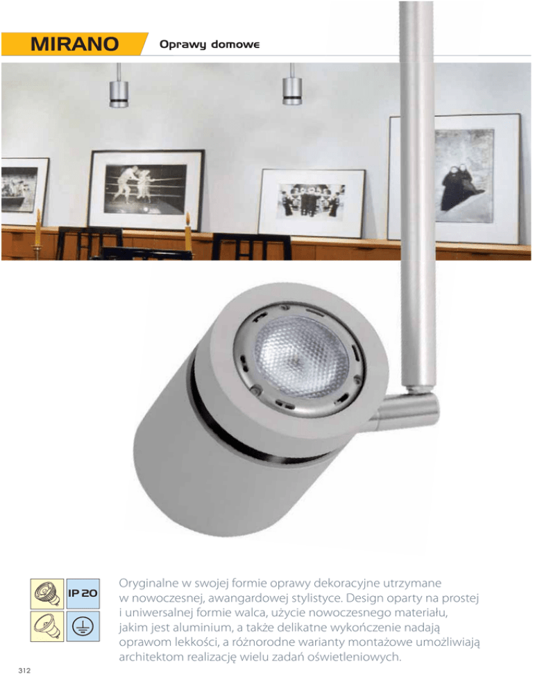 MIRANO IP 20 312 Oprawy domowe Oryginalne w swojej formie oprawy dekoracyjne utrzymane w nowoczesnej, awangardowej stylistyce. Design oparty na prostej i uniwersalnej formie walca, użycie nowoczesnego materiału, jakim jest aluminium, a także delikatne wykończenie nadają oprawom lekkości, a różnorodne warianty montażowe umożliwiają architektom realizację wielu zadań oświetleniowych. Energooszczędne źródła światła • Żarówka halogenowa o mocy max. 20W, trzonek GU10. • Źródła światła LED, trzonek GU10 – polecane ledowe lampy QUARE GU10, ALCRE GU10 i ACRICHE GU10 marki ELGO. Oprawa MIRANO z żarówką halogenową GU10 System montażu • Oprawy przeznaczone do montażu sufitowego (nastropowa, zwieszana na przewodzie zasilającym lub sztywnym wysięgniku), ścienno-sufitowego, ściennego (bezpośrednio na ścianie lub na sztywnym wysięgniku) lub do wbudowania. • Oprawy w wersjach z ruchomymi lub stałymi reflektorami. Oprawa MIRANO ze źródłem światła LED typu ACRICHE GU10 Budowa • Obudowa wykonana z aluminium, anodowana lub malowana proszkowo. • Walcowa obudowa reflektorów o prostej konstrukcji, złożona z korpusu, pierścienia i drobnego gwintu pomiędzy tymi elementami. • Reflektory ruchome lub stałe. • Smukłe wsporniki stałe (anodowane) lub ruchome (niklowane). • Standardowa wersja kolorystyczna: anodowany lub szary. Ruchome mocowanie reflektora na przegubie Stałe mocowanie reflektora www.elgo.pl 313 Oprawy ścienno-sufitowe MIRANO 11 MIRANO 22 MIRANO 23 Pojedyncza oprawa ścienno-sufitowa z ruchomym reflektorem. Podwójna oprawa ścienno-sufitowa z ruchomymi reflektorami. Potrójna oprawa ścienno-sufitowa z ruchomymi reflektorami. Oprawy ścienne MIRANO K1 MIRANO K2 MIRANO K1W Pojedyncza oprawa ścienna ze stałym reflektorem. Dwuźródłowa oprawa ścienna typu up&down. Pojedyncza oprawa ścienna na wysięgniku z ruchomym reflektorem. Oprawy sufitowe MIRANO W MIRANO 51 MIRANO 52 Oprawa typu downlight do montażu w suficie podwieszanym. Pojedyncza oprawa nastropowa z ruchomym reflektorem. Podwójna oprawa nastropowa z ruchomymi reflektorami. Oprawy zwieszane 314 MIRANO 10 MIRANO 20 MIRANO 30 Pojedyncza oprawa zwieszana na przewodzie zasilającym. Podwójna oprawa zwieszana na przewodzie zasilającym. Potrójna oprawa zwieszana na przewodzie zasilającym. MIRANO 10W MIRANO 11W Pojedyncza oprawa nastropowa, na sztywnym Pojedyncza oprawa nastropowa, na sztywnym wysięgniku bez możliwości regulacji reflektora. wysięgniku z ruchomym reflektorem. Indeks MIRANO Źródło światła Model Moc źródła światła Trzonek lampy Stopień ochrony Klasa ochronności Regulacja kierunku świecenia malowana szara Oprawa dekoracyjna YM-WO0054-37 MIRANO 11 1 x max. 20W GU10 IP 20 I • YM-WO0054-67 MIRANO 11 1 x max. 20W GU10 IP 20 I • YM-WO0054-40 MIRANO 22 2 x max. 20W GU10 IP 20 I • YM-WO0054-70 MIRANO 22 2 x max. 20W GU10 IP 20 I • YM-WO0054-44 MIRANO 23 3 x max. 20W GU10 IP 20 I • YM-WO0054-74 MIRANO 23 3 x max. 20W GU10 IP 20 I • YM-WO0054-36 MIRANO K1 1 x max. 20W GU10 IP 20 I YM-WO0054-66 MIRANO K1 1 x max. 20W GU10 IP 20 I YM-WO0054-38 MIRANO K2 2 x max. 20W GU10 IP 20 I YM-WO0054-68 MIRANO K2 2 x max. 20W GU10 IP 20 I YM-WO0054-43 MIRANO K1W 1 x max. 20W GU10 IP 20 I • 1 x max. 20W GU10 IP 20 I • 1 x max. 20W GU10 IP 20 I • YM-WO0054-65 MIRANO 51 1 x max. 20W GU10 IP 20 I • YM-WO0054-39 MIRANO 52 2 x max. 20W GU10 IP 20 I • YM-WO0054-69 MIRANO 52 2 x max. 20W GU10 IP 20 I • YM-WO0054-49 MIRANO W 1 x max. 20W GU10 IP 20 I YM-WO0054-79 MIRANO W 1 x max. 20W GU10 IP 20 I YM-WO0054-47 MIRANO 10 1 x max. 20W GU10 IP 20 I YM-WO0054-77 MIRANO 10 1 x max. 20W GU10 IP 20 I YM-WO0054-41 MIRANO 20 2 x max. 20W GU10 IP 20 I YM-WO0054-71 MIRANO 20 2 x max. 20W GU10 IP 20 I YM-WO0054-45 MIRANO 30 3 x max. 20W GU10 IP 20 I YM-WO0054-75 MIRANO 30 3 x max. 20W GU10 IP 20 I YM-WO0054-46 MIRANO 10W 1 x max. 20W GU10 IP 20 I YM-WO0054-76 MIRANO 10W 1 x max. 20W GU10 IP 20 I YM-WO0054-42 MIRANO 11W 1 x max. 20W GU10 IP 20 I • YM-WO0054-72 MIRANO 11W 1 x max. 20W GU10 IP 20 I • MIRANO 23 MIRANO W MIRANO K1W MIRANO 11W MIRANO 10 MIRANO 51 • • MIRANO K1W MIRANO 22 • • • MIRANO 51 MIRANO 11 • • • YM-WO0054-73 żarówka halogenowa lub źródło światła LED • • YM-WO0054-35 MIRANO 10W Obudowa anodowana • • • • • • • • • • • • • • MIRANO K2 MIRANO K1 MIRANO 52 MIRANO 20 MIRANO 30 230V IP 20 www.elgo.pl 315