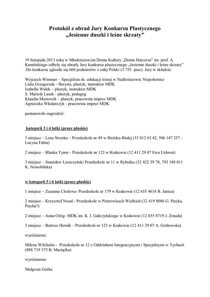 Protokół z obrad Jury Konkursu Plastycznego „Jesienne duszki i leśne skrzaty” 19 listopada 2013 roku w Młodzieżowym Domu Kultury „Domu Harcerza” im. prof. A. Kamińskiego odbyły się obrady Jury konkursu plastycznego „Jesienne duszki i leśne skrzaty” .Do konkursu zgłosiło się 660 podmiotów z całej Polski (3.755 prac). Jury w składzie: Wojciech Wimmer – Specjalista ds. edukacji leśnej w Nadleśnictwie Niepołomice Lidia Grzegorzak - florysta, plastyk, instruktor MDK Izabella Wałek – plastyk, instruktor MDK S. Mariola Lasek - plastyk, pedagog Klaudia Mostowik – plastyk, pracownia imprez MDK Agnieszka Włodarczyk - pracownia imprez MDK postanowiło nagrodzić: kategorii 3 i 4 latki (prace płaskie) 1 miejsce – Lena Strzelec - Przedszkole nr 49 w Bielsku-Białej (33 812 63 42, 506 147 257 – Lucyna Fabia) 2 miejsce – Blanka Tynor - Przedszkole nr 123 w Krakowie (12 411 29 07 Ewa Uchwat) 3 miejsce – Stanisław Leszczyński Przedszkole nr 11 w Rybniku (32 422 39 78, 793 188 011 K. Nowobilska) w kategorii 5 i 6 latki (prace płaskie) 1 miejsce – Zuzanna Cholewa- Przedszkole nr 179 w Krakowie (12 655 4618 B. Janica) 2 miejsce – Krzysztof Nosal - Przedszkole w Pietrowicach Wielkich (32 419 8086 G. Piecka, Piecha?) 2 miejsce – Anna Ożóg- MDK im. K. I. Gałczyńskiego w Krakowie (12 655 0719 J. Żmuda) 3 miejsce – Bartosz Hernik – Przedszkole nr 123 w Krakowie (12 411 29 07 A. Grabowska) wyróżnienie: Milena Wilchelm - Przedszkole nr 12 z Oddziałami Integracyjnymi i Specjalnymi w Tychach (888 719 375 B. Maciążka) wyróżnienie: Małgosia Górka Zosia Adamska – Przedszkole nr 179 w Krakowoe (12 655 46 18 B. Janica) w kategorii I - III klasa (praca płaska) 1 miejsce – Dorota Marszałkowska – SP nr 1 w Gorzycach (32 4511 611 Ilona Matuszek – Świerszcz) 2 miejsce – Wiktoria Gardas – SP w Rycerce Dolnej (33 8644 050 Celina Rak) 3 miejsce – Gabriela Uchwat- MDK im. K. I. Gałczyńskiego w Krakowie (12 655 0719 J. Żmuda) Wyróżnienie: Natalia Pełzak – Zespół Szkolno-Przedszkolny dla Dzieci Niesłyszących i Słabo Słyszących w Katowicach (32 258 43 59 A. Dragan) Wyróżnienie: Sylwia Mróz – Biłgorajskie Centrum Kultury (84 686 04 15 Kamil Łukasik 502 090 251) Wyróżnienie: Anna Wójcik – SP nr 3 w Lublinie (502 024 777, 81 525 25 26 J. Wabik-Wielgus) w kategorii IV-VI klasy (praca płaska): 1 miejsce – Izabela Wołek – SP nr 98 w Krakowie (12 645 49 49 J. Gubała) 2 miejsce – Maja Kuchta – SP z Oddziałami Integracyjnymi nr 64 w Rybniku (509 992 498 M. Tomoś) 2 miejsce – Oliwia Drozd – SP w Miączynie (84 618 0009 A. Berezyńska) 3 miejsce – Paulina Orzeł – Zespół Szkolno-Przedszkolny w Kaniowie (32 215 73 23, J. Gajer 692 722 083) 3 miejsce – Klaudia Kawula – MDK im. K. I. Gałczyńskiego w Krakowie (655 07 12) Wyróżnienie: Dominika Emilia Stec – Ośrodek Rehabilitacyjno- Edukacyjno-Wychowawczy w Olsztynie (89 533 05 32 – A. Przybyszewska) Wyróżnienie: Izabela Lewicka - Ośrodek Rehabilitacyjno-Edukacyjno-Wychowawczy w Olsztynie (89 533 05 32 – A. Przybyszewska) Wyróżnienie: Aleksandra Stawska – Specjalny Ośrodek Szkolno Wychowawczy dla Dzieci Niewidomych i Słabowidzących w Krakowie (692 293 444 A. Dębska) Ponadto na wystawę zakwalifikowały się prace następujących osób: Daria Koźluk – SP Fundacji „Elementarz” w Katowicach Nela Grzechca – SP nr 17 w Gliwicach Karina Żółty – Zespół Szkolno-Przedszkolny w Mazańcowicach Paulina Osadnik- SP w Rogowie Lidia Czarnecka – SP w Elblągu Dobrosława Kamińska – SP w Ciółkówku Julia Płóciennik – SP w Kołacinie Zuzanna Szlachetka – Centrum Młodzieży im. dr H. Jordana w Krakowie Patrycja Żywocińska – SP nr 5 Integracyjna we Włocławku Maja Buczek – Zespół Szkolno – Przedszkolny w Kaniowie Maciej Wasag – SP Miączynie Anna Kaczor – MDK im. K. I. Gałczyńskiego w Krakowie Julia Zajączkowska – SP nr 3 w Lublinie Oliwia Jelonek - MDK im. K. I. Gałczyńskiego w Krakowie Nikola Piątkowska – P. nr 56 w Katowicach Krzysztof Ułański – P. w Bogusławicach Paulina Gotkowska – SP w Rycerce Dolnej Vanessa Guzy – Powiatowe Ognisko Pracy Pozaszkolnej przy SP w Książnicach Kacper Białożyt – Zespół Szkolno – Przedszkolny w Kamesznicy w kategorii 3-4 latki (praca przestrzenna): wyróżnienie: Emilia Kazek – Przedszkole nr 4 w Jastrzębiu Zdroju (604 502 813 M. Pruszczyk) w kategorii 5 i 6 latki (praca przestrzenna): 1 miejsce – Eryk Drzał – Przedszkole w Katowicach (32 725 26 58 B. Glinkowska 504 216 814) 2 miejsce – Kornel Żółty – Zespół Szkolno –Przedszkolny w Mazańcowicach (K. Materna 692 735 187) 3 miejsce –Oliwia Sowińska – Przedszkole w Sopotni Wielkiej M. Wąs 782 059 816 3 miejsce – Karol Snopkowski – ZSP w Pewli Małej, Przedszkole Publiczne (33 863 80 12) wyróżnienie: Adam Szostok- gminne Przedszkole Publiczne w Górze 32 211 71 20, 784 881 657) w kategorii I-III klasa (praca przestrzenna) 1 miejsce – Kamila Liwak – Specjalny Ośrodek Szkolno-Wychowawczy dla Dzieci i Młodzieży Niepełnosprawnej w Lublinie (81 7471423) M. Lenard 2 miejsce – Aleksandra Chuchro – SP nr 132 w Krakowie (12 267 5233 D. Sobolewska) 3 miejsce – Kacper Kulig – SP nr 156 w Krakowie (644 9241 A. Lipiak) 3 miejsce – Magda Katryniok – SP w Rogowie (32 451 2555 i. Gulec) Wyróżnienie: Kacper Czendlik – SP w Rudniku (K. Czendlik 512 492 007, 33 856 9846) Wyróżnienie: Olga Michno – Centrum Młodzieży im. dr H. Jordana w Krakowie (501 480 142, I. Wałek) Wyróżnienie dla placówki: Ośrodek Szkolno-Wychowawczy dla Dzieci Słabo Widzących i Niewidomych w Dąbrowie Górniczej (Zenon Dworczak, 32 2618 003) Jan Tracz, Michał Siemczuk, Remigiusz Krush, Arkadiusz Szostek, Roy Pelc, Albin Pietrasiak, Klaudia Koterba, Klaudia Kamela, Maciej Pańczyk, Krzysztof Owsiany w kategorii IV-VI klasa (praca przestrzenna): 1 miejsce – Maria Pilarczyk – Zesp
