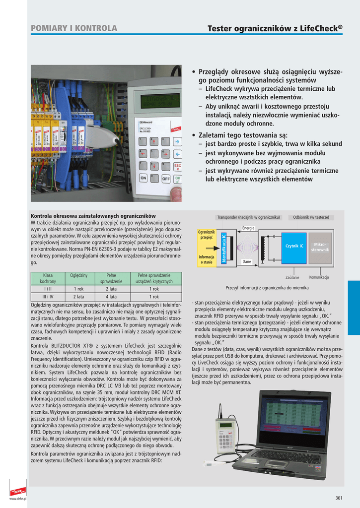 tester ograniczników z LifeCheck® poMiary i kontroLa • Przeglądy okresowe służą osiągnięciu wyższego poziomu funkcjonalności systemów – LifeCheck wykrywa przeciążenie termiczne lub elektryczne wsztstkich elementów. – Aby uniknąć awarii i kosztownego przestoju instalacji, należy niezwłocznie wymieniać uszkodzone moduły ochronne. • Zaletami tego testowania są: – jest bardzo proste i szybkie, trwa w kilka sekund – jest wykonywane bez wyjmowania modułu ochronnego i podczas pracy ogranicznika – jest wykrywane również przeciążenie termiczne lub elektryczne wszystkich elementów Klasa kochrony Oględziny Pełne sprawdzenie Pełne sprawdzenie urządzeń krytycznych I i II 1 rok 2 lata 1 rok III i IV 2 lata 4 lata 1 rok Oględziny ograniczników przepięć w instalacjach sygnałowych i teleinformatycznych nie ma sensu, bo zasadniczo nie mają one optycznej sygnalizacji stanu, dlatego potrzebne jest wykonanie testu. W przeszłości stosowano wielofunkcyjne przyrządy pomiarowe. Te pomiary wymagały wiele czasu, fachowych kompetencji i uprawnień i miały z zasady ograniczone znaczenie. Kontrola BLITZDUCTOR XT® z systemem LifeCheck jest szczególnie łatwa, dzięki wykorzystaniu nowoczesnej technologii RFID (Radio Frequency Identification). Umieszczony w ograniczniku czip RFID w ograniczniku nadzoruje elementy ochronne oraz służy do komunikacji z czytnikiem. System LifeCheck pozwala na kontrolę ograniczników bez konieczności wyłączania obwodów. Kontrola może być dokonywana za pomocą przenośnego miernika DRC LC M3 lub też poprzez montowany obok ograniczników, na szynie 35 mm, moduł kontrolny DRC MCM XT. Informacja przed uszkodzeniem: trójstopniowy nadzór systemu LifeCheck wraz z funkcją ostrzegania obejmuje wszystkie elementy ochronne ogranicznika. Wykrywa on przeciążenie termiczne lub elektryczne elementów jeszcze przed ich fizycznym zniszczeniem. Szybką i bezdotykową kontrolę ogranicznika zapewnia przenośne urządzenie wykorzystujące technologię RFID. Optyczny i akustyczny meldunek “OK” potwierdza sprawność ogranicznika. W przeciwnym razie należy moduł jak najszybciej wymienić, aby zapewnić dalszą skuteczną ochronę podłączonego do niego obwodu. Transponder (nadajnik w ograniczniku) Transponder (SPD) Ogranicznik SPD przepięć Informacja Info über oZustand stanie Odbiornik (w testerze) Reader (Prüfgerät) Energia Energy Identification ICIC Identyfikacja Kontrola okresowa zainstalowanych ograniczników W trakcie działania ogranicznika przepięć np. po wyładowaniu piorunowym w obiekt może nastąpić przekroczenie (przeciążenie) jego dopuszczalnych parametrów. W celu zapewnienia wysokiej skuteczności ochrony przepięciowej zainstalowane ograniczniki przepięć powinny być regularnie kontrolowane. Norma PN-EN 62305-3 podaje w tablicy E2 maksymalne okresy pomiędzy przeglądami elementów urządzenia piorunochronnego. Reader ICIC Czytnik MikroMicrocontroller sterownik Dane Data Power Zasilanie Communication Komunikacja Przesył informacji z ogranicznika do miernika - stan przeciążenia elektrycznego (udar prądowy) - jeżeli w wyniku przepięcia elementy elektroniczne modułu ulegną uszkodzeniu, znacznik RFID przerywa w sposób trwały wysyłanie sygnału „OK.” - stan przeciążenia termicznego (przegrzanie) - jeżeli elementy ochronne modułu osiągnęły temperaturę krytyczną znajdujące się wewnątrz modułu bezpieczniki termiczne przerywają w sposób trwały wysyłanie sygnału „OK.” Dane z testów (data, czas, wynik) wszystkich ograniczników można przesyłać przez port USB do komputera, drukować i archiwizować. Przy pomocy LiveCheck osiąga się wyższy poziom ochrony i funkcjonalności instalacji i systemów, ponieważ wykrywa również przeciążenie elementów (jeszcze przed ich uszkodzeniem), przez co ochrona przepięciowa instalacji może być permanentna. Kontrola parametrów ogranicznika związana jest z trójstopniowym nadzorem systemu LifeCheck i komunikacją poprzez znacznik RFID: www.dehn.pl 361 tester ograniczników z LifeCheck® DrC LC M3+ poMiary i kontroLa Pamięć testera umożliwia łatwe prowadzenie dokumentacji na komputerze • Do szybkiego testowania ograniczników z funkcją LifeCheck • Tester, łatwy w transporcie i użytkowaniu OŚĆ NOW Czytnik LifeCheck z czasie testu Przenośny tester z czytnikiem LifeCheck. Do szybkiego i łatwego testowania ograniczników z funkcją LifeCheck. Z optycznym i akustycznym wskaźnikiem testu. Dodatkowo przy pomocy połączenia USB i oprogramowania na PC można prowadzić zarządzanie badaniami okresowymi przychowywać dokumentację wyników testów. Tester DRC LC M3+ ma nowy czytnik LifeCheck z możliwością zatrzaskiwania na badanym module, dlatego nie trzeba trzymać czytnika w ręce w czasie testu. Tester umożliwia również parametryzowanie monitorowanych ograniczników przepięć (patrz DRC MCM XT). • Z pamięcią do zapisu i dokumentacji testów • Do łatwego i szybkiego parametryzowania monitorowanych ograniczników z LifeCheck DRC LC M3+ Do testowania Zasilanie bateryjne (bateria w zestawie) Częstotliwość sygnału RFID Wskaźnik wyniku testu Czas testu Zakres temperatur pracy Test baterii Długość przewodu czytnika LifeCheck Wymiary: Czytnik LifeCheck Wymiary: Tester W zestawie Wymiary: walizka BLITZDUCTOR XT ML BLITZDUCTOR XT ML EX tylko poza strefami Ex ! Li-Ion (ładowane) 125 kHz sygnał akustyczny i optyczny na LCD typowo od 3 do 10 sekund -10°C...+65°C automatyczne odłączenie wyczerpanego akumulatora ok. 1000 mm 0 x 51 x 12 mm 166 x 5 x 30 mm tester, czytnik LifeCheck do BXT, ładowarka, kabel USB, moduł referencyjny do autotestu, oprogramowanie na CD, walizka 340 x 275 x 83 mm Dane potrzebne do zamówienia Typ Numer katalogowy Opakowanie jednostkowe DRC LC M3+ 910 653 1 szt. Akcesoria do testera ograniczników z LifeCheck® Czytnik LifeCheck do DRC BXT / BCT Zapasowy czytnik LifeCheck i moduł ref