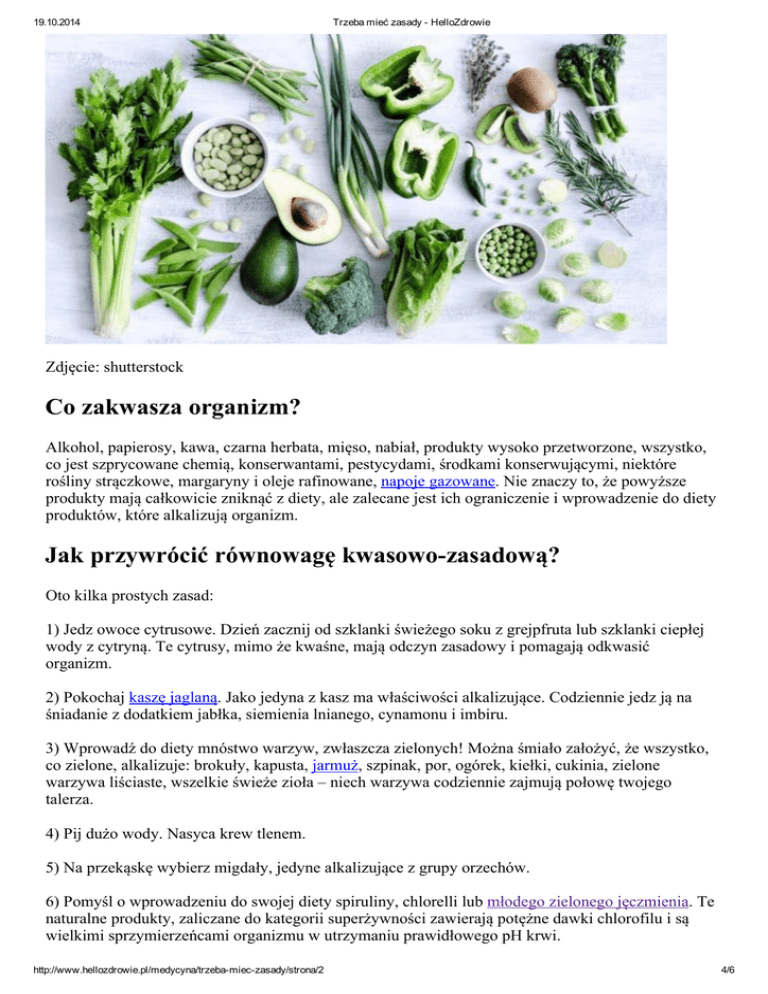 19.10.2014 Trzeba mieć zasady - HelloZdrowie Zdjęcie: shutterstock Co zakwasza organizm? Alkohol, papierosy, kawa, czarna herbata, mięso, nabiał, produkty wysoko przetworzone, wszystko, co jest szprycowane chemią, konserwantami, pestycydami, środkami konserwującymi, niektóre rośliny strączkowe, margaryny i oleje rafinowane, napoje gazowane. Nie znaczy to, że powyższe produkty mają całkowicie zniknąć z diety, ale zalecane jest ich ograniczenie i wprowadzenie do diety produktów, które alkalizują organizm. Jak przywrócić równowagę kwasowo-zasadową? Oto kilka prostych zasad: 1) Jedz owoce cytrusowe. Dzień zacznij od szklanki świeżego soku z grejpfruta lub szklanki ciepłej wody z cytryną. Te cytrusy, mimo że kwaśne, mają odczyn zasadowy i pomagają odkwasić organizm. 2) Pokochaj kaszę jaglaną. Jako jedyna z kasz ma właściwości alkalizujące. Codziennie jedz ją na śniadanie z dodatkiem jabłka, siemienia lnianego, cynamonu i imbiru. 3) Wprowadź do diety mnóstwo warzyw, zwłaszcza zielonych! Można śmiało założyć, że wszystko, co zielone, alkalizuje: brokuły, kapusta, jarmuż, szpinak, por, ogórek, kiełki, cukinia, zielone warzywa liściaste, wszelkie świeże zioła – niech warzywa codziennie zajmują połowę twojego talerza. 4) Pij dużo wody. Nasyca krew tlenem. 5) Na przekąskę wybierz migdały, jedyne alkalizujące z grupy orzechów. 6) Pomyśl o wprowadzeniu do swojej diety spiruliny, chlorelli lub młodego zielonego jęczmienia. Te naturalne produkty, zaliczane do kategorii superżywności zawierają potężne dawki chlorofilu i są wielkimi sprzymierzeńcami organizmu w utrzymaniu prawidłowego pH krwi. http://www.hellozdrowie.pl/medycyna/trzeba-miec-zasady/strona/2 4/6