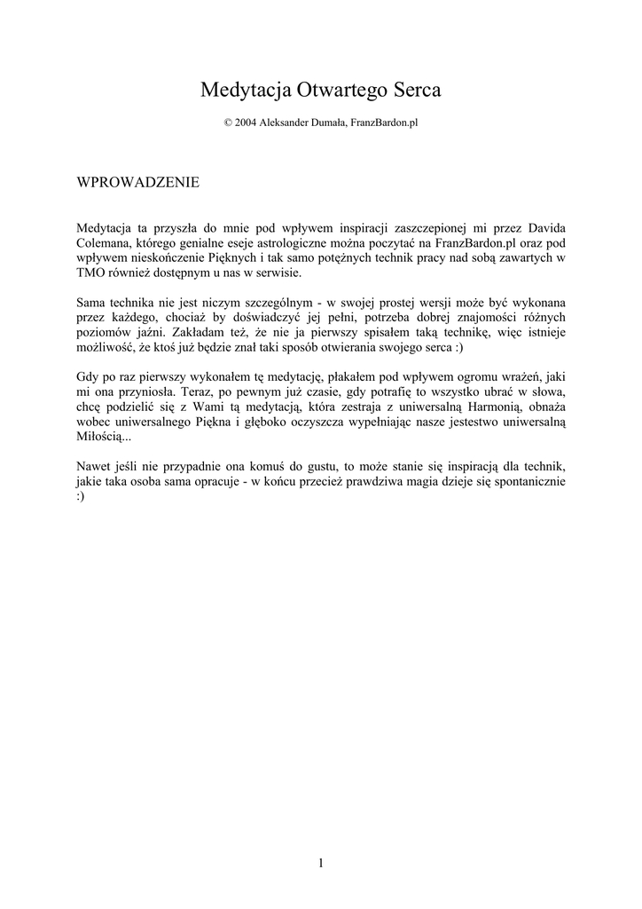 Medytacja Otwartego Serca © 2004 Aleksander Dumała, FranzBardon.pl WPROWADZENIE Medytacja ta przyszła do mnie pod wpływem inspiracji zaszczepionej mi przez Davida Colemana, którego genialne eseje astrologiczne można poczytać na FranzBardon.pl oraz pod wpływem nieskończenie Pięknych i tak samo potężnych technik pracy nad sobą zawartych w TMO również dostępnym u nas w serwisie. Sama technika nie jest niczym szczególnym - w swojej prostej wersji może być wykonana przez każdego, chociaż by doświadczyć jej pełni, potrzeba dobrej znajomości różnych poziomów jaźni. Zakładam też, że nie ja pierwszy spisałem taką technikę, więc istnieje możliwość, że ktoś już będzie znał taki sposób otwierania swojego serca :) Gdy po raz pierwszy wykonałem tę medytację, płakałem pod wpływem ogromu wrażeń, jaki mi ona przyniosła. Teraz, po pewnym już czasie, gdy potrafię to wszystko ubrać w słowa, chcę podzielić się z Wami tą medytacją, która zestraja z uniwersalną Harmonią, obnaża wobec uniwersalnego Piękna i głęboko oczyszcza wypełniając nasze jestestwo uniwersalną Miłością... Nawet jeśli nie przypadnie ona komuś do gustu, to może stanie się inspiracją dla technik, jakie taka osoba sama opracuje - w końcu przecież prawdziwa magia dzieje się spontanicznie :) 1 PRAKTYKA Sugeruję wykonywanie tej medytacji na świeżym powietrzu, najlepiej stojąc boso na ziemi/trawie. Można to również wykonać siedząc czy leżąc, jeśli tak wolisz. Oczy powinny być na początku otwarte. Weź kilka głębokich oddechów i przez całą medytację staraj się oddychać dość głęboko, chociaż spokojnie i równomiernie. Rozejrzyj się... Spójrz na otaczającą cię przyrodę... Dostrzegaj każdy szczegół, jaki masz przed oczami... Oddychając czuj dokładnie mieszaninę zapachów, jaka cię teraz otacza... Poczuj powiew wiatru i światło słońca na twarzy. Jeśli jest noc, to obserwuj blask księżyca; jeśli pada deszcz, to obserwuj dotyk każdej jego kropli; jeśli dokoła grzmią pioruny, to obserwuj burzę i poczuj jak powietrze zmienia się pod wpływem wyzwalanych ładunków etc. Posłuchaj wszystkich dźwięków, jakie cię otaczają. Wsłuchaj się w nie bardzo wyraźnie. Połącz te wszystkie wrażenia w jedno całościowe postrzeganie. DOŚWIADCZAJ chwili obecnej. Bądź jej świadomą częścią... Teraz mając przed sobą te wszystkie obrazy, dźwięki, zapachy, odczucia poczuj, że ty również jesteś obserwowany. Każde drzewo, na jakie patrzysz, patrzy na ciebie. Każdy kwiat, którego zapach czujesz, czuje ciebie. Pomyśl, że wszystkie rzeczy, jakie widzisz przed sobą są świadome. Trawa, na której stoisz, czuje twoje stopy i raduje się kontaktem z tobą, tak samo jak tobie przyjemność sprawia odczuwanie jej dotyku. Jeśli chcesz, to możesz sięgnąć w tej chwili myślą do całego wszechświata by zaobserwować i cieszyć się tym, że każda jego najdrobniejsza cząstka jest świadoma i obserwuje ciebie, gdy ty obserwujesz ją. Poczuj otaczające cię Piękno i Harmonię. Spędź chwilę skupiając się na tym wszystkim... Teraz otwórz swoje serce. Wyobraź sobie, że rozrywasz wszystkie otaczające je skorupy egoizmu, lęku, wszelkiego napięcia i wszelkiej negatywności. Zrzuć to wszystko na ziemię, która to wchłonie. Niech twoje serce będzie nagie wobec twojego otoczenia i całego wszechświata, tak jak one są nagie wobec ciebie. 2 Teraz z każdym oddechem wdychaj do swojego serca1 Piękno, Harmonię i Miłość wszechświata, a przy wydechu emanuj2 tym samym ze swojego serca. Niech te trzy rzeczy wypełnią całe twoje jestestwo. Niech twój oddech będzie złączony z oddechem wszechświata. Poczuj, że ty, twoje otoczenie i cały wszechświat tworzycie Jedno. Jeśli jesteś w stanie3, to wznieś się do swojego Tiphareth i poczuj, jak Piękno, Harmonia i Miłość wypełniają cały Tiphareth i wszystkie twoje wcielenia. Potem wznieś się do swojego Binah i poczuj, jak Piękno, Harmonia i Miłość wypełniają całe Binah, wszystkie jaźnie Indywidualności w nim zawarte i ich wszystkie wcielenia, zarówno te obecne, przeszłe jak i przyszłe. Wznieś się do swojego Chokmah i poczuj, jak Piękno, Harmonia i Miłość wypełniają całe Chokmah i wszystko, co istniało, istnieje i będzie istnieć we wszechświecie. Wznieś się do Kether i poczuj, jak Piękno, Harmonia i Miłość są w Kether wypełniając sobą WSZYSTKO. Trwaj w tym stanie uniesienia, aż poczujesz, że jesteś całkowicie wypełniony Pięknem, Harmonią i Miłością. Wtedy wróć do normalnej świadomości, zmów dziękczynienie za błogosławieństwo, jakiego doświadczyłeś i emanuj Pięknem, Harmonią i Miłością w trakcie normalnych czynności codziennego dnia. Bądźmy wszyscy tak błogosławieni! 1 Nie chodzi tutaj o oddychanie organem serca, a jedynie o wizualizowanie przepływu Harmonii, Piękna i Miłości do całego ciała *poprzez* serce. Można tutaj jednak zamiennie wprowadzić oddychanie porami całego ciała, jeśli jesteś zaznajomiony z tą metodą. 2 Nie chodzi tutaj o wydychanie tego, co wdychasz, lecz o *emanowanie* tym, co już znajduje się w tobie. 3 Jest to zaawansowana technika Magii IHVH-ADNI opisana w "Ostatecznej Formie TMO", znajdującej się na www.FranzBardon.pl oraz na www.tmo-wg.net. 3