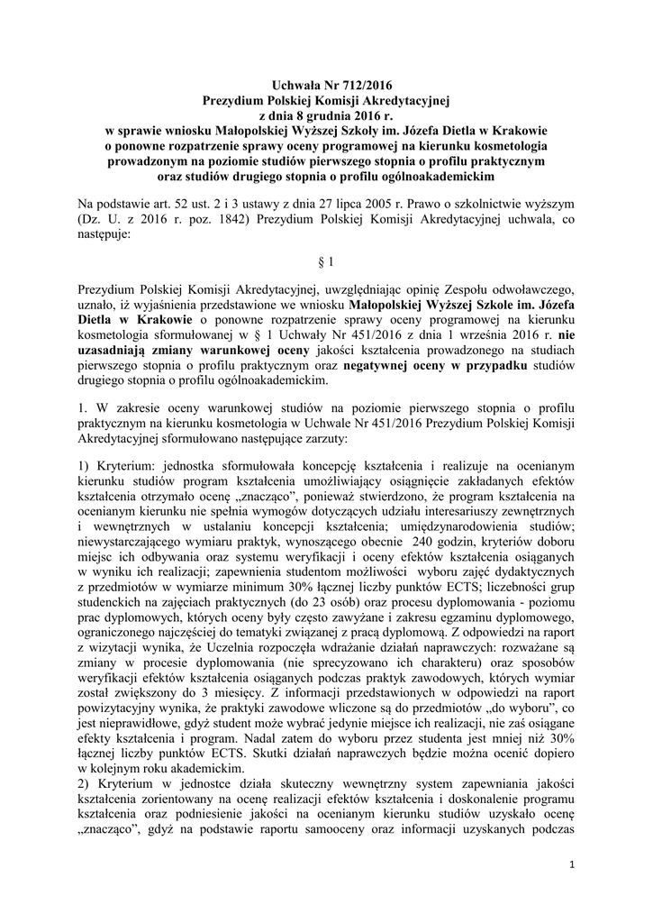 Uchwała Nr 712/2016 Prezydium Polskiej Komisji Akredytacyjnej z dnia 8 grudnia 2016 r. w sprawie wniosku Małopolskiej Wyższej Szkoły im. Józefa Dietla w Krakowie o ponowne rozpatrzenie sprawy oceny programowej na kierunku kosmetologia prowadzonym na poziomie studiów pierwszego stopnia o profilu praktycznym oraz studiów drugiego stopnia o profilu ogólnoakademickim Na podstawie art. 52 ust. 2 i 3 ustawy z dnia 27 lipca 2005 r. Prawo o szkolnictwie wyższym (Dz. U. z 2016 r. poz. 1842) Prezydium Polskiej Komisji Akredytacyjnej uchwala, co następuje: §1 Prezydium Polskiej Komisji Akredytacyjnej, uwzględniając opinię Zespołu odwoławczego, uznało, iż wyjaśnienia przedstawione we wniosku Małopolskiej Wyższej Szkole im. Józefa Dietla w Krakowie o ponowne rozpatrzenie sprawy oceny programowej na kierunku kosmetologia sformułowanej w § 1 Uchwały Nr 451/2016 z dnia 1 września 2016 r. nie uzasadniają zmiany warunkowej oceny jakości kształcenia prowadzonego na studiach pierwszego stopnia o profilu praktycznym oraz negatywnej oceny w przypadku studiów drugiego stopnia o profilu ogólnoakademickim. 1. W zakresie oceny warunkowej studiów na poziomie pierwszego stopnia o profilu praktycznym na kierunku kosmetologia w Uchwale Nr 451/2016 Prezydium Polskiej Komisji Akredytacyjnej sformułowano następujące zarzuty: 1) Kryterium: jednostka sformułowała koncepcję kształcenia i realizuje na ocenianym kierunku studiów program kształcenia umożliwiający osiągnięcie zakładanych efektów kształcenia otrzymało ocenę „znacząco”, ponieważ stwierdzono, że program kształcenia na ocenianym kierunku nie spełnia wymogów dotyczących udziału interesariuszy zewnętrznych i wewnętrznych w ustalaniu koncepcji kształcenia; umiędzynarodowienia studiów; niewystarczającego wymiaru praktyk, wynoszącego obecnie 240 godzin, kryteriów doboru miejsc ich odbywania oraz systemu weryfikacji i oceny efektów kształcenia osiąganych w wyniku ich realizacji; zapewnienia studentom możliwości wyboru zajęć dydaktycznych z przedmiotów w wymiarze minimum 30% łącznej liczby punktów ECTS; liczebności grup studenckich na zajęciach praktycznych (do 23 osób) oraz procesu dyplomowania - poziomu prac dyplomowych, których oceny były często zawyżane i zakresu egzaminu dyplomowego, ograniczonego najczęściej do tematyki związanej z pracą dyplomową. Z odpowiedzi na raport z wizytacji wynika, że Uczelnia rozpoczęła wdrażanie działań naprawczych: rozważane są zmiany w procesie dyplomowania (nie sprecyzowano ich charakteru) oraz sposobów weryfikacji efektów kształcenia osiąganych podczas praktyk zawodowych, których wymiar został zwiększony do 3 miesięcy. Z informacji przedstawionych w odpowiedzi na raport powizytacyjny wynika, że praktyki zawodowe wliczone są do przedmiotów „do wyboru”, co jest nieprawidłowe, gdyż student może wybrać jedynie miejsce ich realizacji, nie zaś osiągane efekty kształcenia i program. Nadal zatem do wyboru przez studenta jest mniej niż 30% łącznej liczby punktów ECTS. Skutki działań naprawczych będzie można ocenić dopiero w kolejnym roku akademickim. 2) Kryterium w jednostce działa skuteczny wewnętrzny system zapewniania jakości kształcenia zorientowany na ocenę realizacji efektów kształcenia i doskonalenie programu kształcenia oraz podniesienie jakości na ocenianym kierunku studiów uzyskało ocenę „znacząco”, gdyż na podstawie raportu samooceny oraz informacji uzyskanych podczas 1 wizytacji stwierdzono, że wewnętrzny system zapewnienia jakości kształcenia funkcjonuje w Uczelni jedynie w bardzo ograniczonym zakresie. Brak jest analizy informacji zebranych na podstawie ankiet i przełożenia wyników tych analiz na działania naprawcze. Podjęto działania zmierzające do naprawy WSZJK, m.in. powołano na nowo Uczelnianą Komisję ds. Jakości Kształcenia, oraz nowego Pełnomocnika ds. Jakości Kształcenia, wpływ tych zmian i innych działań naprawczych na funkcjonowanie oraz skuteczność systemu będzie jednak można ocenić najwcześniej w roku akademickim 2016/2017. 3) Kryterium: jednostka zapewnia studentom wsparcie w procesie uczenia się i wchodzenia na rynek pracy otrzymało ocenę „częściowo”, ponieważ stwierdzono, że Jednostka nie podjęła działań mających na celu umożliwienie studentom udziału w międzynarodowych i krajowych wymianach studenckich, nie przedstawiono dokumentów potwierdzających funkcjonowanie Biura Karier, budynek, w którym realizowane są zajęcia dydaktyczne, nie jest przystosowany do potrzeb osób z niepełnosprawnością narządu słuchu, w trakcie ustalania organizacji roku akademickiego nie są brane pod uwagę terminy odbywających się w kraju targów i konferencji kosmetycznych, co uniemożliwia studentom wzięcie w nich udziału z uwagi na zaplanowane na ten sam termin zajęcia dydaktyczne. W odpowiedzi na raport powizytacyjny Władze Uczelni nie odniosły się do zarzutów dotyczących tego kryterium. 4) Kryterium: współpraca z otoczeniem społecznym, gospodarczym lub kulturalnym w procesie kształcenia oceniono na „znacząco”, ponieważ stwierdzono, że Jednostka nie ma podpisanych umów, czy porozumień z pracodawcami dotyczących prowadzenia praktyk zawodowych, nie dokumentuje też osiąganych efektów kształcenia oraz czynności wykonywanych podczas tych praktyk, co nie sprzyja zapewnianiu należytej jakości kształcenia praktycznego w warunkach rzeczywistych dla przyszłej pracy zawodowej. Ponadto pracodawcy są jedynie w minimalnym stopniu włączani w proces kształtowania efektów kształcenia oraz programu studiów. W odpowiedzi na raport Uczelnia przedstawiła podpisane umowy z pracodawcami o przyjęciu odpowiedniej liczby studentów na praktykę zawodową, przedstawiono również zarządzenie Rektora powołujące opiekunów praktyk oraz precyzujące ich zadania i kompetencje, decyzją Rektora zmieniona i ujednolicona 