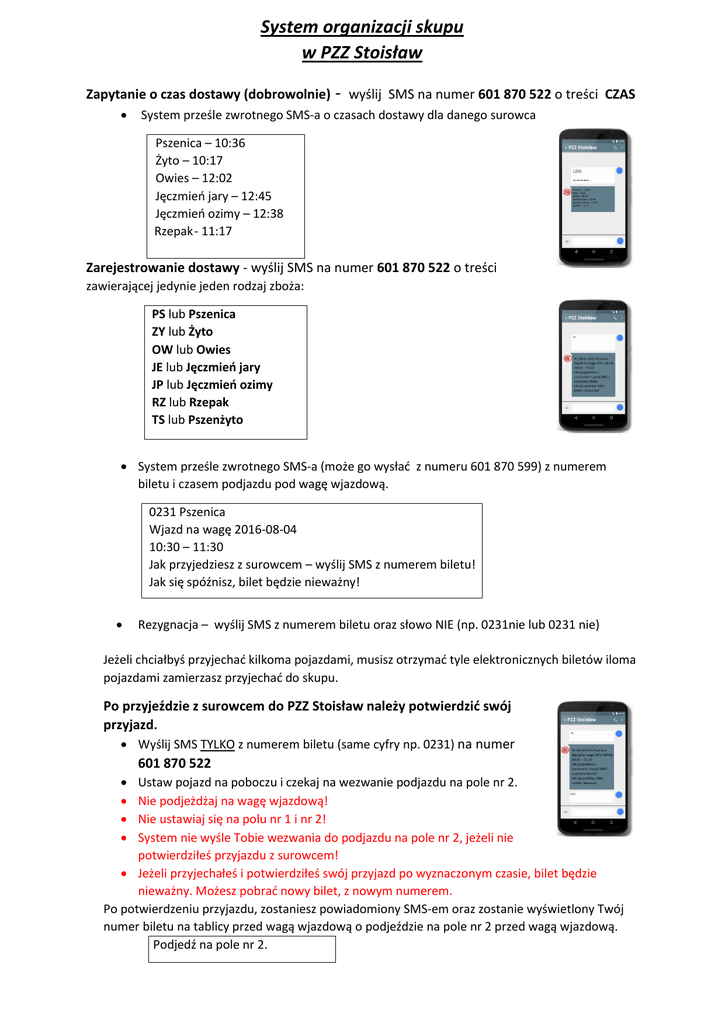 System organizacji skupu w PZZ Stoisław Zapytanie o czas dostawy (dobrowolnie) - wyślij SMS na numer 601 870 522 o treści CZAS System prześle zwrotnego SMS-a o czasach dostawy dla danego surowca Pszenica – 10:36 Żyto – 10:17 Owies – 12:02 Jęczmień jary – 12:45 Jęczmień ozimy – 12:38 Rzepak - 11:17 Zarejestrowanie dostawy - wyślij SMS na numer 601 870 522 o treści zawierającej jedynie jeden rodzaj zboża: PS lub Pszenica ZY lub Żyto OW lub Owies JE lub Jęczmień jary JP lub Jęczmień ozimy RZ lub Rzepak TS lub Pszenżyto System prześle zwrotnego SMS-a (może go wysłać z numeru 601 870 599) z numerem biletu i czasem podjazdu pod wagę wjazdową. 0231 Pszenica Wjazd na wagę 2016-08-04 10:30 – 11:30 Jak przyjedziesz z surowcem – wyślij SMS z numerem biletu! Jak się spóźnisz, bilet będzie nieważny! Rezygnacja – wyślij SMS z numerem biletu oraz słowo NIE (np. 0231nie lub 0231 nie) Jeżeli chciałbyś przyjechać kilkoma pojazdami, musisz otrzymać tyle elektronicznych biletów iloma pojazdami zamierzasz przyjechać do skupu. Po przyjeździe z surowcem do PZZ Stoisław należy potwierdzić swój przyjazd. Wyślij SMS TYLKO z numerem biletu (same cyfry np. 0231) na numer 601 870 522 Ustaw pojazd na poboczu i czekaj na wezwanie podjazdu na pole nr 2. Nie podjeżdżaj na wagę wjazdową! Nie ustawiaj się na polu nr 1 i nr 2! System nie wyśle Tobie wezwania do podjazdu na pole nr 2, jeżeli nie potwierdziłeś przyjazdu z surowcem! Jeżeli przyjechałeś i potwierdziłeś swój przyjazd po wyznaczonym czasie, bilet będzie nieważny. Możesz pobrać nowy bilet, z nowym numerem. Po potwierdzeniu przyjazdu, zostaniesz powiadomiony SMS-em oraz zostanie wyświetlony Twój numer biletu na tablicy przed wagą wjazdową o podjeździe na pole nr 2 przed wagą wjazdową. Podjedź na pole nr 2. Jeżeli pole nr 1 jest puste, nie stoi żaden pojazd, podjedź na nie. Jeżeli waga wjazdowa jest pusta, wjedź na nią. Badanie próby i wycena surowca - Pracownikowi na wadze, podaj numer biletu i kod jaki otrzymałeś w ostatnim SMS-ie. Obsługa wagi wjazdowej pobierze próbę. Jeżeli jedno z pól „Badanie 1” lub „Badanie 2” jest puste, podjedź na nie i czekaj na wynik analizy. Podejdź do obsługi wagi wjazdowej, która przekaże Tobie dowód zgłoszenia dostawy, na którym zawarty będzie wynik badania surowca, cena skupu i nr kosza rozładunkowego. Jeżeli zaakceptujesz warunki skupu surowca, sprawdź numer kosza rozładunkowego. Jeżeli na polu A przypisanym do numeru kosza nie ma pojazdu, podjedź na to pole (np. masz rozładować surowiec na koszu nr 2, najpierw podjeżdżasz na pole 2B, następnie 2A. Jeżeli na koszu zostanie włączone zielone światło sygnalizacyjne, podjedź do kosza. Uwaga.: W przypadku wątpliwości prosimy o kontakt pod numerem telefonu 605 741 462 , 607 547 103