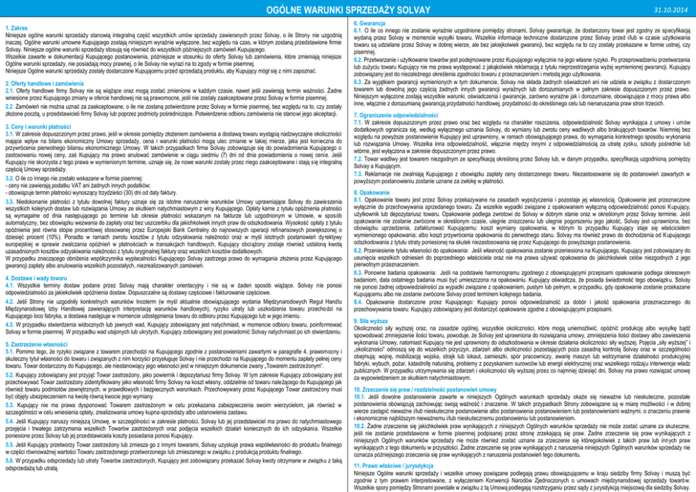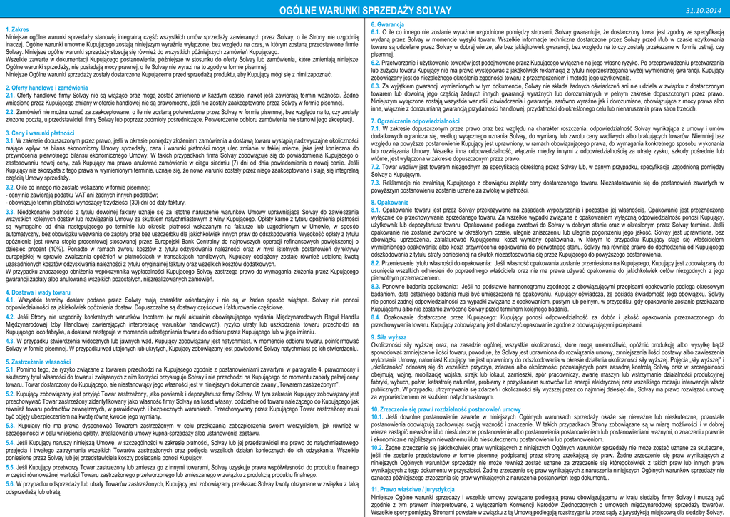 OGÓLNE WARUNKI SPRZEDAŻY SOLVAY 1. Zakres Niniejsze ogólne warunki sprzedaży stanowią integralną część wszystkich umów sprzedaży zawieranych przez Solvay, o ile Strony nie uzgodnią inaczej. Ogólne warunki umowne Kupującego zostają niniejszym wyraźnie wyłączone, bez względu na czas, w którym zostaną przedstawione firmie Solvay. Niniejsze ogólne warunki sprzedaży stosują się również do wszystkich późniejszych zamówień Kupującego. Wszelkie zawarte w dokumentacji Kupującego postanowienia, późniejsze w stosunku do oferty Solvay lub zamówienia, które zmieniają niniejsze Ogólne warunki sprzedaży, nie posiadają mocy prawnej, o ile Solvay nie wyrazi na to zgody w formie pisemnej. Niniejsze Ogólne warunki sprzedaży zostały dostarczone Kupującemu przed sprzedażą produktu, aby Kupujący mógł się z nimi zapoznać. 2. Oferty handlowe i zamówienia 2.1. Oferty handlowe firmy Solvay nie są wiążące oraz mogą zostać zmienione w każdym czasie, nawet jeśli zawierają termin ważności. Żadne wniesione przez Kupującego zmiany w ofercie handlowej nie są prawomocne, jeśli nie zostały zaakceptowane przez Solvay w formie pisemnej. 2.2. Zamówień nie można uznać za zaakceptowane, o ile nie zostaną potwierdzone przez Solvay w formie pisemnej, bez względu na to, czy zostały złożone pocztą, u przedstawicieli firmy Solvay lub poprzez podmioty pośredniczące. Potwierdzenie odbioru zamówienia nie stanowi jego akceptacji. 3. Ceny i warunki płatności 3.1. W zakresie dopuszczonym przez prawo, jeśli w okresie pomiędzy złożeniem zamówienia a dostawą towaru wystąpią nadzwyczajne okoliczności mające wpływ na bilans ekonomiczny Umowy sprzedaży, cena i warunki płatności mogą ulec zmianie w takiej mierze, jaka jest konieczna do przywrócenia pierwotnego bilansu ekonomicznego Umowy. W takich przypadkach firma Solvay zobowiązuje się do powiadomienia Kupującego o zastosowaniu nowej ceny, zaś Kupujący ma prawo anulować zamówienie w ciągu siedmiu (7) dni od dnia powiadomienia o nowej cenie. Jeśli Kupujący nie skorzysta z tego prawa w wymienionym terminie, uznaje się, że nowe warunki zostały przez niego zaakceptowane i stają się integralną częścią Umowy sprzedaży. 3.2. O ile co innego nie zostało wskazane w formie pisemnej: - ceny nie zawierają podatku VAT ani żadnych innych podatków; - obowiązuje termin płatności wynoszący trzydzieści (30) dni od daty faktury. 3.3. Niedokonanie płatności z tytułu dowolnej faktury uznaje się za istotne naruszenie warunków Umowy uprawniające Solvay do zawieszenia wszystkich kolejnych dostaw lub rozwiązania Umowy ze skutkiem natychmiastowym z winy Kupującego. Opłaty karne z tytułu opóźnienia płatności są wymagalne od dnia następującego po terminie lub okresie płatności wskazanym na fakturze lub uzgodnionym w Umowie, w sposób automatyczny, bez obowiązku wezwania do zapłaty oraz bez uszczerbku dla jakichkolwiek innych praw do odszkodowania. Wysokość opłaty z tytułu opóźnienia jest równa stopie procentowej stosowanej przez Europejski Bank Centralny do najnowszych operacji refinansowych powiększonej o dziesięć procent (10%). Ponadto w ramach zwrotu kosztów z tytułu odzyskiwania należności oraz w myśl istotnych postanowień dyrektywy europejskiej w sprawie zwalczania opóźnień w płatnościach w transakcjach handlowych, Kupujący obciążony zostaje również ustaloną kwotą uzasadnionych kosztów odzyskiwania należności z tytułu oryginalnej faktury oraz wszelkich kosztów dodatkowych. W przypadku znaczącego obniżenia współczynnika wypłacalności Kupującego Solvay zastrzega prawo do wymagania złożenia przez Kupującego gwarancji zapłaty albo anulowania wszelkich pozostałych, niezrealizowanych zamówień. 4. Dostawa i wady towaru 4.1. Wszystkie terminy dostaw podane przez Solvay mają charakter orientacyjny i nie są w żaden sposób wiążące. Solvay nie ponosi odpowiedzialności za jakiekolwiek opóźnienia dostaw. Dopuszczalne są dostawy częściowe i fakturowanie częściowe. 4.2. Jeśli Strony nie uzgodniły konkretnych warunków Incoterm (w myśl aktualnie obowiązującego wydania Międzynarodowych Reguł Handlu Międzynarodowej Izby Handlowej zawierających interpretację warunków handlowych), ryzyko utraty lub uszkodzenia towaru przechodzi na Kupującego loco fabryka, a dostawa następuje w momencie udostępnienia towaru do odbioru przez Kupującego lub w jego imieniu. 4.3. W przypadku stwierdzenia widocznych lub jawnych wad, Kupujący zobowiązany jest natychmiast, w momencie odbioru towaru, poinformować Solvay w formie pisemnej. W przypadku wad utajonych lub ukrytych, Kupujący zobowiązany jest powiadomić Solvay natychmiast po ich stwierdzeniu. 5. Zastrzeżenie własności 5.1. Pomimo tego, że ryzyko związane z towarem przechodzi na Kupującego zgodnie z postanowieniami zawartymi w paragrafie 4, prawomocny i skuteczny tytuł własności do towaru i związanych z nim korzyści przysługuje Solvay i nie przechodzi na Kupującego do momentu zapłaty pełnej ceny towaru. Towar dostarczony do Kupującego, ale niestanowiący jego własności jest w niniejszym dokumencie zwany „Towarem zastrzeżonym”. 5.2. Kupujący zobowiązany jest przyjąć Towar zastrzeżony, jako powiernik i depozytariusz firmy Solvay. W tym zakresie Kupujący zobowiązany jest przechowywać Towar zastrzeżony zidentyfikowany jako własność firmy Solvay na koszt własny, oddzielnie od towaru należącego do Kupującego jak również towaru podmiotów zewnętrznych, w prawidłowych i bezpiecznych warunkach. Przechowywany przez Kupującego Towar zastrzeżony musi być objęty ubezpieczeniem na kwotę równą kwocie jego wymiany. 5.3. Kupujący nie ma prawa dysponować Towarem zastrzeżonym w celu przekazania zabezpieczenia swoim wierzycielom, jak również w szczególności w celu wniesienia opłaty, zrealizowania umowy kupna-sprzedaży albo ustanowieni