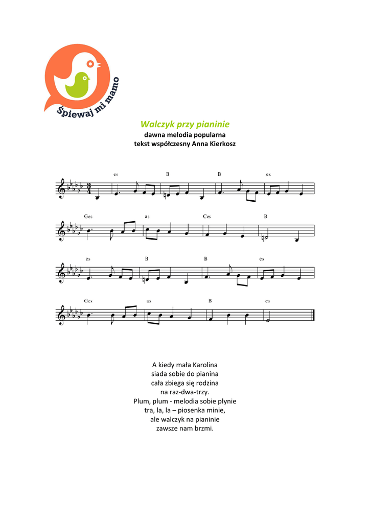 Walczyk przy pianinie dawna melodia popularna tekst współczesny Anna Kierkosz A kiedy mała Karolina siada sobie do pianina cała zbiega się rodzina na raz-dwa-trzy. Plum, plum - melodia sobie płynie tra, la, la – piosenka minie, ale walczyk na pianinie zawsze nam brzmi. A czasem mama prosi Witka, by na swoich zagrał skrzypcach i piosenka dźwięczy szybka na raz-dwa-trzy. Plum, plum – melodia sobie płynie, tra-la-la – piosenka minie, ale walczyk przy pianinie zawsze nam brzmi. A kiedy tata na niedzielę bierze swoją wiolonczelę, walczyk skacze jak wróbelek na raz-dwa-trzy. Plum, plum – melodia sobie płynie, tra-la-la – piosenka minie, ale walczyk przy pianinie zawsze nam brzmi.