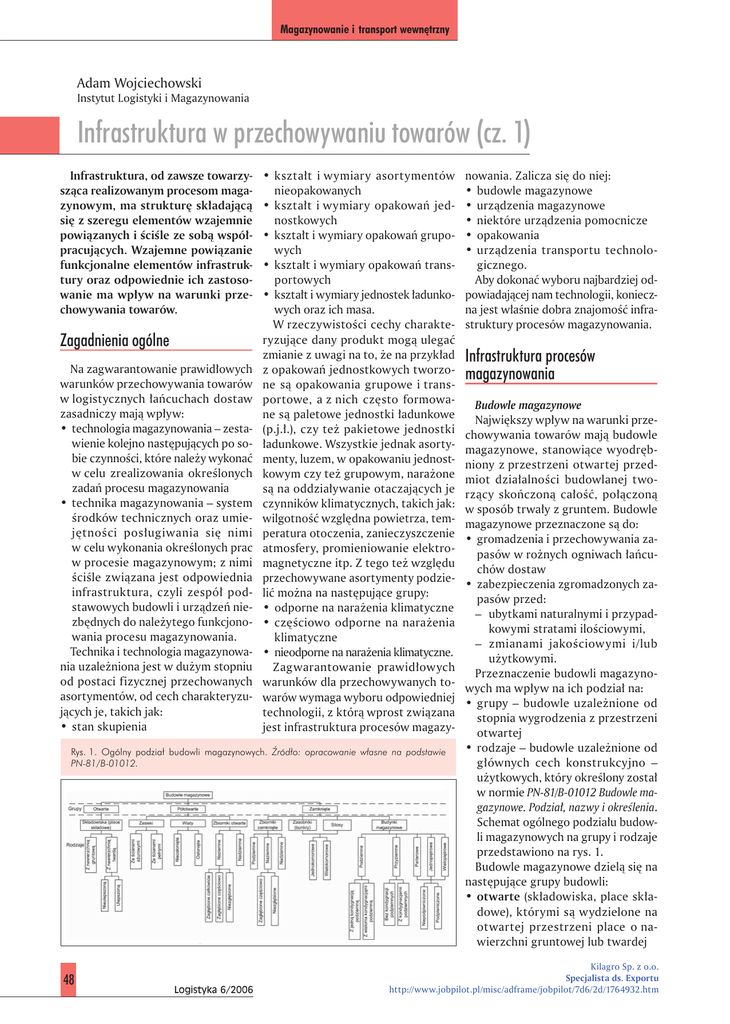 Magazynowanie i transport wewnętrzny Adam Wojciechowski Instytut Logistyki i Magazynowania Infrastruktura w przechowywaniu towarów (cz. 1) Infrastruktura, od zawsze towarzysząca realizowanym procesom magazynowym, ma strukturę składającą się z szeregu elementów wzajemnie powiązanych i ściśle ze sobą współpracujących. Wzajemne powiązanie funkcjonalne elementów infrastruktury oraz odpowiednie ich zastosowanie ma wpływ na warunki przechowywania towarów. Zagadnienia ogólne Na zagwarantowanie prawidłowych warunków przechowywania towarów w logistycznych łańcuchach dostaw zasadniczy mają wpływ: • technologia magazynowania – zestawienie kolejno następujących po sobie czynności, które należy wykonać w celu zrealizowania określonych zadań procesu magazynowania • technika magazynowania – system środków technicznych oraz umiejętności posługiwania się nimi w celu wykonania określonych prac w procesie magazynowym; z nimi ściśle związana jest odpowiednia infrastruktura, czyli zespół podstawowych budowli i urządzeń niezbędnych do należytego funkcjonowania procesu magazynowania. Technika i technologia magazynowania uzależniona jest w dużym stopniu od postaci fizycznej przechowanych asortymentów, od cech charakteryzujących je, takich jak: • stan skupienia • kształt i wymiary asortymentów nieopakowanych • kształt i wymiary opakowań jednostkowych • kształt i wymiary opakowań grupowych • kształt i wymiary opakowań transportowych • kształt i wymiary jednostek ładunkowych oraz ich masa. W rzeczywistości cechy charakteryzujące dany produkt mogą ulegać zmianie z uwagi na to, że na przykład z opakowań jednostkowych tworzone są opakowania grupowe i transportowe, a z nich często formowane są paletowe jednostki ładunkowe (p.j.ł.), czy też pakietowe jednostki ładunkowe. Wszystkie jednak asortymenty, luzem, w opakowaniu jednostkowym czy też grupowym, narażone są na oddziaływanie otaczających je czynników klimatycznych, takich jak: wilgotność względna powietrza, temperatura otoczenia, zanieczyszczenie atmosfery, promieniowanie elektromagnetyczne itp. Z tego też względu przechowywane asortymenty podzielić można na następujące grupy: • odporne na narażenia klimatyczne • częściowo odporne na narażenia klimatyczne • nieodporne na narażenia klimatyczne. Zagwarantowanie prawidłowych warunków dla przechowywanych towarów wymaga wyboru odpowiedniej technologii, z którą wprost związana jest infrastruktura procesów magazy- Rys. 1. Ogólny podział budowli magazynowych. Źródło: opracowanie własne na podstawie PN-81/B-01012. 48 Logistyka 6/2006 nowania. Zalicza się do niej: • budowle magazynowe • urządzenia magazynowe • niektóre urządzenia pomocnicze • opakowania • urządzenia transportu technologicznego. Aby dokonać wyboru najbardziej odpowiadającej nam technologii, konieczna jest właśnie dobra znajomość infrastruktury procesów magazynowania. Infrastruktura procesów magazynowania Budowle magazynowe Największy wpływ na warunki przechowywania towarów mają budowle magazynowe, stanowiące wyodrębniony z przestrzeni otwartej przedmiot działalności budowlanej tworzący skończoną całość, połączoną w sposób trwały z gruntem. Budowle magazynowe przeznaczone są do: • gromadzenia i przechowywania zapasów w rożnych ogniwach łańcuchów dostaw • zabezpieczenia zgromadzonych zapasów przed: – ubytkami naturalnymi i przypadkowymi stratami ilościowymi, – zmianami jakościowymi i/lub użytkowymi. Przeznaczenie budowli magazynowych ma wpływ na ich podział na: • grupy – budowle uzależnione od stopnia wygrodzenia z przestrzeni otwartej • rodzaje – budowle uzależnione od głównych cech konstrukcyjno – użytkowych, który określony został w normie PN-81/B-01012 Budowle magazynowe. Podział, nazwy i określenia. Schemat ogólnego podziału budowli magazynowych na grupy i rodzaje przedstawiono na rys. 1. Budowle magazynowe dzielą się na następujące grupy budowli: • otwarte (składowiska, place składowe), którymi są wydzielone na otwartej przestrzeni place o nawierzchni gruntowej lub twardej Kilagro Sp. z o.o. Specjalista ds. Exportu http://www.jobpilot.pl/misc/adframe/jobpilot/7d6/2d/1764932.htm Magazynowanie i transport wewnętrzny Rys. 2. Budowla magazynowa otwarta – różne formy budowy zasieków: a) jednokomorowa jednorzędowa dwustronna, b) jednokomorowa jednorzędowa jednostronna, c) wielokomorowa jednorzędowa jednostronna, d) wielokomorowa dwurzędowa. Źródło: Opracowanie własne. a) b) c) d) • półotwarte, którymi są wydzielone z otwartej przestrzeni za pomocą wybudowanych przegród (pionowych i/lub poziomych) obiekty posiadające minimum jeden nie osłonięty bok • zamknięte, którymi są obiekty budowlane całkowicie wydzielone z otwartej przestrzeni za pomocą wybudowanych pionowych i poziomych przegród. Wśród otwartych budowli magazynowych rozróżnia się ich następujące rodzaje: • place składowe o nawierzchni gruntowej • place składowe o nawierzchni twardej. Place składowe o nawierzchni gruntowej charakteryzują się nawierzchnią wykonaną z gruntu rodzimego (nieulepszonego) lub nawiezionego gruntu ulepszonego mechanicznie, bądź chemicznie. Place składowe tego rodzaju przeznaczone są głównie do składowania materiałów masowych luzem, które odporne są na narażenia klimatyczne. Materiały masowe (sypkie, kawałkowe, bryłowe) składowane są na placach luzem w pryzmach. Nachylenie powierzchni bocznych tych pryzm uzależnione jest od kąta usypowego, charakterystycznego dla każdego materiału sypkiego. Właściwość tą należy o to uwzględniać podczas planowania ich rozmieszczenia w celu zachowania odpowiednich dróg dojazdowych. Place składowe o nawierzchni twardej charakteryzują się nawierzchnią o grubości wynoszącej ponad 12 cm i wytrzymałości na ściskanie co najmniej 100 MPa, p