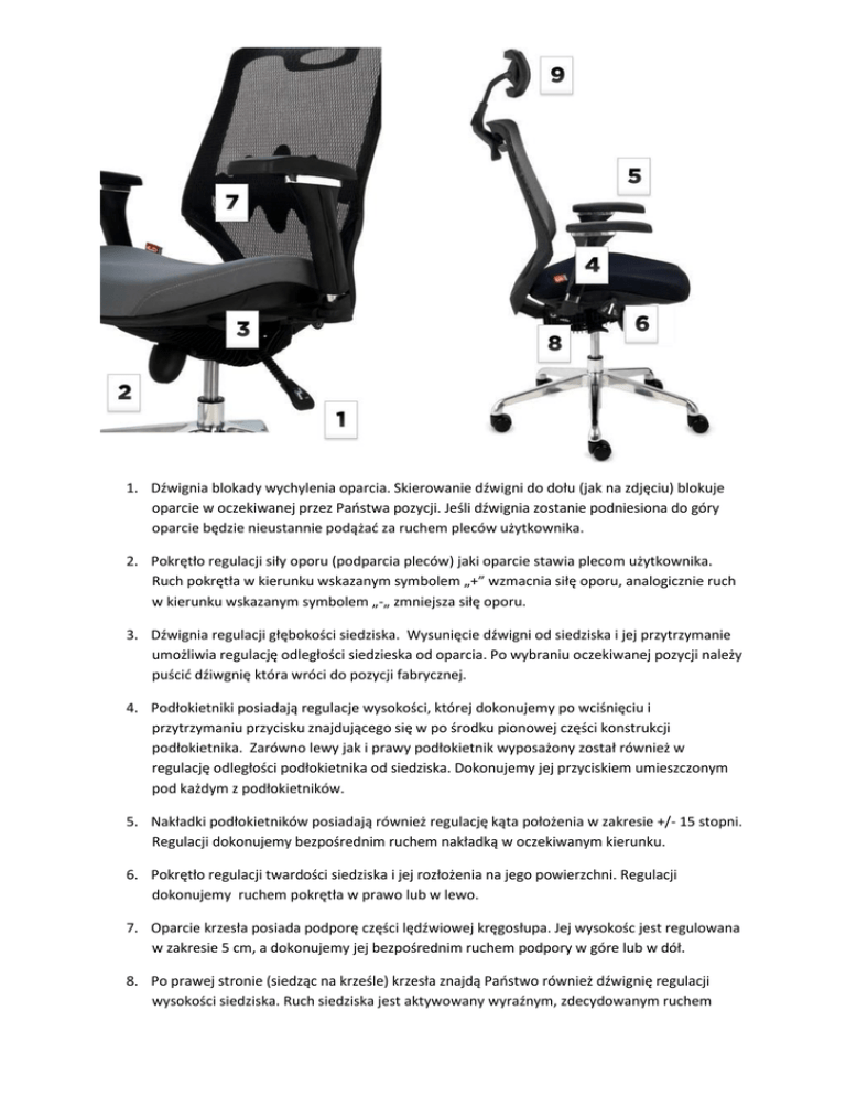 1. Dźwignia blokady wychylenia oparcia. Skierowanie dźwigni do dołu (jak na zdjęciu) blokuje oparcie w oczekiwanej przez Paostwa pozycji. Jeśli dźwignia zostanie podniesiona do góry oparcie będzie nieustannie podążad za ruchem pleców użytkownika. 2. Pokrętło regulacji siły oporu (podparcia pleców) jaki oparcie stawia plecom użytkownika. Ruch pokrętła w kierunku wskazanym symbolem „+” wzmacnia siłę oporu, analogicznie ruch w kierunku wskazanym symbolem „-„ zmniejsza siłę oporu. 3. Dźwignia regulacji głębokości siedziska. Wysunięcie dźwigni od siedziska i jej przytrzymanie umożliwia regulację odległości siedzieska od oparcia. Po wybraniu oczekiwanej pozycji należy puścid dźiwgnię która wróci do pozycji fabrycznej. 4. Podłokietniki posiadają regulacje wysokości, której dokonujemy po wciśnięciu i przytrzymaniu przycisku znajdującego się w po środku pionowej części konstrukcji podłokietnika. Zarówno lewy jak i prawy podłokietnik wyposażony został również w regulację odległości podłokietnika od siedziska. Dokonujemy jej przyciskiem umieszczonym pod każdym z podłokietników. 5. Nakładki podłokietników posiadają również regulację kąta położenia w zakresie +/- 15 stopni. Regulacji dokonujemy bezpośrednim ruchem nakładką w oczekiwanym kierunku. 6. Pokrętło regulacji twardości siedziska i jej rozłożenia na jego powierzchni. Regulacji dokonujemy ruchem pokrętła w prawo lub w lewo. 7. Oparcie krzesła posiada podporę części lędźwiowej kręgosłupa. Jej wysokośc jest regulowana w zakresie 5 cm, a dokonujemy jej bezpośrednim ruchem podpory w góre lub w dół. 8. Po prawej stronie (siedząc na krześle) krzesła znajdą Paostwo również dźwignię regulacji wysokości siedziska. Ruch siedziska jest aktywowany wyraźnym, zdecydowanym ruchem dźwigni w dół. Podniesienie siedziska jest możliwe tylko wtedy kiedy siedzisko jest nieobciążone. 9. Zagłówek regulowany jest w zakresie góra – dół. Regulacji dokonujemy po wciśnięciu srebrnego przycisku. Możliwa jest również regulacja zagłówka wokół jego poziomej osi, której dokonujemy bezpośrednim ruchem poziomej części zagłówka.