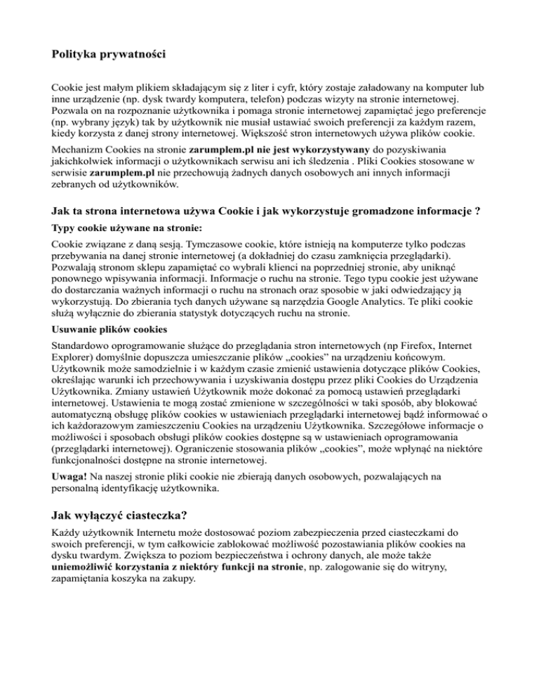 Polityka prywatności Cookie jest małym plikiem składającym się z liter i cyfr, który zostaje załadowany na komputer lub inne urządzenie (np. dysk twardy komputera, telefon) podczas wizyty na stronie internetowej. Pozwala on na rozpoznanie użytkownika i pomaga stronie internetowej zapamiętać jego preferencje (np. wybrany język) tak by użytkownik nie musiał ustawiać swoich preferencji za każdym razem, kiedy korzysta z danej strony internetowej. Większość stron internetowych używa plików cookie. Mechanizm Cookies na stronie zarumplem.pl nie jest wykorzystywany do pozyskiwania jakichkolwiek informacji o użytkownikach serwisu ani ich śledzenia . Pliki Cookies stosowane w serwisie zarumplem.pl nie przechowują żadnych danych osobowych ani innych informacji zebranych od użytkowników. Jak ta strona internetowa używa Cookie i jak wykorzystuje gromadzone informacje ? Typy cookie używane na stronie: Cookie związane z daną sesją. Tymczasowe cookie, które istnieją na komputerze tylko podczas przebywania na danej stronie internetowej (a dokładniej do czasu zamknięcia przeglądarki). Pozwalają stronom sklepu zapamiętać co wybrali klienci na poprzedniej stronie, aby uniknąć ponownego wpisywania informacji. Informacje o ruchu na stronie. Tego typu cookie jest używane do dostarczania ważnych informacji o ruchu na stronach oraz sposobie w jaki odwiedzający ją wykorzystują. Do zbierania tych danych używane są narzędzia Google Analytics. Te pliki cookie służą wyłącznie do zbierania statystyk dotyczących ruchu na stronie. Usuwanie plików cookies Standardowo oprogramowanie służące do przeglądania stron internetowych (np Firefox, Internet Explorer) domyślnie dopuszcza umieszczanie plików „cookies” na urządzeniu końcowym. Użytkownik może samodzielnie i w każdym czasie zmienić ustawienia dotyczące plików Cookies, określając warunki ich przechowywania i uzyskiwania dostępu przez pliki Cookies do Urządzenia Użytkownika. Zmiany ustawień Użytkownik może dokonać za pomocą ustawień przeglądarki internetowej. Ustawienia te mogą zostać zmienione w szczególności w taki sposób, aby blokować automatyczną obsługę plików cookies w ustawieniach przeglądarki internetowej bądź informować o ich każdorazowym zamieszczeniu Cookies na urządzeniu Użytkownika. Szczegółowe informacje o możliwości i sposobach obsługi plików cookies dostępne są w ustawieniach oprogramowania (przeglądarki internetowej). Ograniczenie stosowania plików „cookies”, może wpłynąć na niektóre funkcjonalności dostępne na stronie internetowej. Uwaga! Na naszej stronie pliki cookie nie zbierają danych osobowych, pozwalających na personalną identyfikację użytkownika. Jak wyłączyć ciasteczka? Każdy użytkownik Internetu może dostosować poziom zabezpieczenia przed ciasteczkami do swoich preferencji, w tym całkowicie zablokować możliwość pozostawiania plików cookies na dysku twardym. Zwiększa to poziom bezpieczeństwa i ochrony danych, ale może także uniemożliwić korzystania z niektóry funkcji na stronie, np. zalogowanie się do witryny, zapamiętania koszyka na zakupy. Informacje na temat ustawień dotyczących ciasteczek w poszczególnych przeglądarkach internetowych dostępne są na poniższej liście stron: • • • • • w przeglądarce Opera w przegladarce Firefox w przeglądarce Chrome w przeglądarce Internet Explorer w przeglądarce Safari Jeśli korzystasz z urządzenia przenośnego (telefon, smartfon, tablet), zapoznaj się z opcjami dotyczącymi ochrony prywatności w dokumentacji na stronie internetowej producenta Twojego urządzenia.