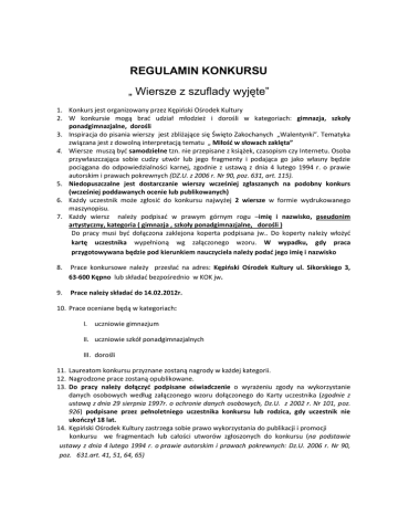 REGULAMIN KONKURSU „ Wiersze z szuflady wyjęte” 1. Konkurs jest organizowany przez Kępioski Ośrodek Kultury 2. W konkursie mogą brad udział młodzież i dorośli w kategoriach: gimnazja, szkoły ponadgimnazjalne, dorośli 3. Inspiracja do pisania wierszy jest zbliżające się Święto Zakochanych „Walentynki”. Tematyka związana jest z dowolną interpretacją tematu „ Miłośd w słowach zaklęta” 4. Wiersze muszą byd samodzielne tzn. nie przepisane z książek, czasopism czy Internetu. Osoba przywłaszczająca sobie cudzy utwór lub jego fragmenty i podająca go jako własny będzie pociągana do odpowiedzialności karnej, zgodnie z ustawą z dnia 4 lutego 1994 r. o prawie autorskim i prawach pokrewnych (DZ.U. z 2006 r. Nr 90, poz. 631, art. 115). 5. Niedopuszczalne jest dostarczanie wierszy wcześniej zgłaszanych na podobny konkurs (wcześniej poddawanych ocenie lub publikowanych) 6. Każdy uczestnik może zgłosid do konkursu najwyżej 2 wiersze w formie wydrukowanego maszynopisu. 7. Każdy wiersz należy podpisad w prawym górnym rogu –imię i nazwisko, pseudonim artystyczny, kategoria ( gimnazja , szkoły ponadgimnazjalne, dorośli ) Do pracy musi byd dołączona zaklejona koperta podpisana jw.. Do koperty należy włożyd kartę uczestnika wypełnioną wg załączonego wzoru. W wypadku, gdy praca przygotowywana będzie pod kierunkiem nauczyciela należy podad jego imię i nazwisko 8. Prace konkursowe należy przesład na adres: Kępioski Ośrodek Kultury ul. Sikorskiego 3, 63-600 Kępno lub składad bezpośrednio w KOK jw. 9. Prace należy składad do 14.02.2012r. 10. Prace oceniane będą w kategoriach: I. uczniowie gimnazjum II. uczniowie szkół ponadgimnazjalnych III. dorośli 11. Laureatom konkursu przyznane zostaną nagrody w każdej kategorii. 12. Nagrodzone prace zostaną opublikowane. 13. Do pracy należy dołączyd podpisane oświadczenie o wyrażeniu zgody na wykorzystanie danych osobowych według załączonego wzoru dołączonego do Karty uczestnika (zgodnie z ustawą z dnia 29 sierpnia 1997r. o ochronie danych osobowych, Dz.U. z 2002 r. Nr 101, poz. 926) podpisane przez pełnoletniego uczestnika konkursu lub rodzica, gdy uczestnik nie ukooczył 18 lat. 14. Kępioski Ośrodek Kultury zastrzega sobie prawo wykorzystania do publikacji i promocji konkursu we fragmentach lub całości utworów zgłoszonych do konkursu (na podstawie ustawy z dnia 4 lutego 1994 r. o prawie autorskim i prawach pokrewnych: Dz.U. 2006 r. Nr 90, poz. 631.art. 41, 51, 64, 65)
