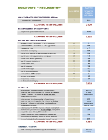 KOSZTORYS "INTELIGENTNY" WARTOŚĆ ILOŚĆ SZTUK WYBRANYCH URZĄDZEŃ LUB FUNKCJI 1 2400 KONCENTRATOR MULTIMEDIALNY ABIdom z wyposażeniem podstawowym 2400 CAŁKOWITY KOSZT URZĄDZEŃ ZABEZPIECZENIE ENERGETYCZNE 1298 przepięciowe / przeciwzakłóceniowe 1298 CAŁKOWITY KOSZT URZĄDZEŃ SYSTEM ANTYWŁAMANIOWY centrala do 64 linii + akumulator 18 A/h + sygnalizator 0 1 1 1 0 0 869 0 manipulatory LCD 1 manipulator sensoryczny 1 417 0 856 czujniki ruchu odporne na obecność zwierząt do 25 kg. 5 280 czujniki ruchu z funkcją oświetlenia awaryjnego 2 czujniki ruchu dualne (garażowe) 1 140 0 160 0 czujniki otwarcia (kontaktrony) 2 czujniki zalania wodą 1 czujniki pożarowe 1 czujniki tlenku węgla 1 182 0 182 0 czujniki gazu usypiającego 1 190 powiadomienie GSM + antena 0 radiolinia p. napadowa 1 0 0 95 transformator centrali 1 69 centrala do 32 linii + akumulator 18 A/h + sygnalizator 30 0 95 0 do sterowania automatyką 3565 CAŁKOWITY KOSZT URZĄDZEŃ TELEWIZJA odbiór sygnału dowolnego satelity, cyfrowej telewizji naziemnej oraz innych sygnałów (np. z kamer) w trzech lub wliczone w cenę czterech* pokojach z możliwością współzależnego przełączania programów. odbiór sygnału dowolnego satelity, cyfrowej telewizji naziemnej oraz innych sygnałów (np. z kamer) w siedmiu koncentratora 1 1 0 280 kwota lub ośmiu* pokojach z możliwością współzależnego pomniejszona przełączania programów. 1 o wersję 0 4 kan. odbiór sygnału TV CYFRA+ w pięciu pokojach z jednej karty abonamentowej z możliwością niezależnego przełączania 1 358 0 1 0 380 1 1 0 266 programów. (cena dotyczy 3 telewizorów) kamera z zasilaczem i modulatorem oraz oświetlaczem podczerwieni do obserwacji obrazu na ekranie telewizora. domowa instalacja światłowodowa dla telewizji i internetu CAŁKOWITY KOSZT URZĄDZEŃ 1284 INTERNET / TELEFON swich 8 portowy do rozdzielenia sygnału internetowego wliczone w cenę koncentratora bramka IP do tanich rozmów przez 0 0 0 0 1 795 internet z całym światem, centralka telefoniczna z funkcją obsługi domofonu przez telefon, centralka telefoniczna z obsługą tel. IP oraz z obsługą domofonu przez telefon, 795 CAŁKOWITY KOSZT URZĄDZEŃ AUTOMATYKA DOMOWA UWAGA !! należy podać liczbę sterowanych obwodów. Pojedynczy moduł obsługuje osiem obwodów, dla optymalizacji kosztów należy wybrać ilość funkcji będącą krotnością liczby "8" sterowanie oświetleniem za pomocą czujników ruchu, 4 236 sterowanie oświetleniem - tworzenie scen, funkcje czasowe, 4 292 0 0 regulacja natężeni światła. Sterowanie ręczne i systemowe. (cena dotyczy jednego obwodu do 350W) alarmowe załączenie oświetlenia w wybranych pomieszczeniach w chwili alarmu, oświetlanie awaryjne wybranych pomieszczeń po zaniku prądu (dwa pomieszczenia) wliczone w cenę systemu alarm. 0 0 sterowanie roletami i markizami - indywidualne i centralne 0 0 automatyczne sterowanie podlewaniem ogrodu 0 0 centralne wyłączanie zbędnych w danej chwili 1 120 1 500 symulacja obecności - czasowe, sekwencyjne załączenie oświetlenia w wybranych pokojach, obwodów elektrycznych automatyczne odcięcie dopływu wody lub gazu w przypadku wykrycia wycieku przez czujnik. 1148 CAŁKOWITY KOSZT URZĄDZEŃ AUTOMATYKA - "INTELEGENTNY DOM" UWAGA !! należy podać liczbę sterowanych obwodów. Pojedynczy moduł obsługuje cztery obwody, dla optymalizacji kosztów należy wybrać ilość funkcji będącą krotnością liczby "4" za wyjątkiem czterech ostatnich pozycji 8 1710 ściemniacz systemowy 0 0 czasowe, ręczne lub automatyczne sterowanie 8 2628 moduł pogodowy 1 667 stacja pogodowa 1 1495 czujnik wiatru 1 544 zegar astronomiczny 1 630 sterowanie oświetleniem z możliwością ściemniania, i tworzenia scen na wybranych obwodach. funkcja "paniki" załączająca oświetlenie wybranych obwodów jednym przyciskiem lub sygnałem systemu alarmowego. symulacja obecności - system losowo odtwarza sekwencje włączania oświetlenia w poszczególnych pokojach z ostatniego tygodnia. funkcje czasowe na wybranych obwodach roletami i markizami w zależności od temperatury, oświetlenia i siły wiatru 7674 CAŁKOWITY KOSZT URZĄDZEŃ KABLE I PRZEWODY przewód sat. RG-6CU m 1 0 1 0 0 0 przewód sat. RG-6CU zewnętrzny żelowany 0 przewód sat. TRI-sat 200 0 0 360 przewód sat. TRI-sat zewnętrzny żelowany 100 216 przewód komputerowy UTP kat. 5 300 420 0 100 0 przewód komputerowy UTP kat. 5 zewnętrzny 50 0 przewód "głośnikowy" przewód "domofonowy" 2x3x0,5mm 100 0 0 80 1176 CAŁKOWITY KOSZT PRZEWODU ZABEZPIECZENIE ENERGETYCZNE wyłącznik nadprądowy 1-polowy 6-16A 10 wyłącznik nadprądowy 3-polowy 16A 2 wyłącznik różnicowoprądowy 4-p 40A 2 wyłącznik różnicowoprądowy 2-p 40A 2 rozłącznik izolacji 4-p 100A 1 ochronnik przepięciowy 4-p kl. C 0 ochronnik przepięciowy 4-p kl. B+C 1 ochronnik przepięciowy1-p kl. D z filtrem 0 lstwa ochronna 4 kros kablowy 1 INSTALACJA SYSTEMÓW instalacja urządzeń - punktów instalacyjnych 190 0 154 86 0 0 632 0 0 0 32 0 60 0 1298 CAŁKOWITY KOSZT URZĄDZEŃ instalacja okablowania 80 0 64 0 750 0 750 31 2480 20 1000 uruchomienie systemów. instalacja systemu "inteligentnego domu" LUXOR CAŁKOWITY KOSZT INSTALACJI CAŁKOWITY KOSZT ZESTAWU BRUTTO 4230 24868 2400 772 869 417 856 56 70 160 15 95 182 182 190 460 95 69 280 358 380 266 180 563 795 59 73 59 59 59 59 120 500 213,75 278 328,5 667 1495 544 630 0,9 1,2 1,8 2,16 1,4 2 3,5 0,8 8 32 95 77 86 388 632 160 8 60 1 80 50