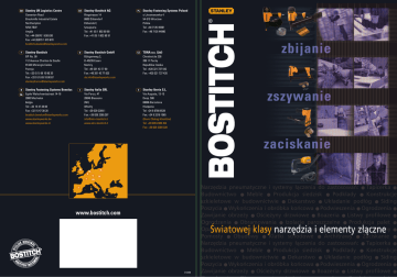 Stanley UK Logistics Centre Stanley-Bostitch AG Stanley Fastening Systems Poland Gowerton Road Brackmills Industrial Estate Northampton NN4 7BW Anglia Tel: +44 (0)870 1 630 630 Fax: +44 (0)870 1 670 670 [email protected] Ringstrasse 14 8600 Dübendorf Dübendorf, Szwajcaria Tel: +41 (0) 1 802 80 90 Fax: +41 (0) 1 802 80 91 ul Jerzmanowka 4 54-519 Wroclaw Polska Tel: +48 7135 45501 Fax: +48 7135 44990 Stanley-Bostitch Stanley Bostitch GmbH TONA a.s. (Ltd) BP No. 90 112 Avenue Charles de Gaulle 91423 Morangis Cedex Francja Tel: +33 0 (1) 69 10 80 20 Fax: +33 0 (1) 69 10 80 67 [email protected] Bützgenweg 2, D-45239 Essen Niemcy Tel: +49 201 43 77 90 Fax: +49 201 43 77 925 [email protected] Chvalovicka 326 289 11 Pecky Republika Czeska Tel: +420 321 737 542 Fax: +420 321 737 435 Stanley Fastening Systems Benelux Stanley Italia SRL Stanley Iberia S.L. Egide Walschaertsstraat 14-16 2800 Mechelen Belgia Tel: +32 15 47 38 00 Fax: +32 15 47 38 20 [email protected] www.stanleyworks.be www.stanleyworks.nl Via Parco, 47 20046 Biassono (MI) Włochy Tel: +39 039 2389.1 Fax: +39 039 2389.297 [email protected] www.atro-bostitch.it Via Augusta, 13-15 Desp. 506 08006 Barcelona Hiszpania Tel: +34 6 0788 6539 Fax: +34 9 3218 1065 (Biuro Obsługi klientów) Tel: +39 039 2389 454 Fax: +39 039 2389 320 www.bostitch.com Narzędzia pneumatyczne i systemy łączenia do zastosowań: ● Tapicerka ● Budownictwo ● Meble ● Produkcja siedzisk ● Podkłady ● Konstrukcje szkieletowe w budownictwie ● Dekarstwo ● Układanie podłóg ● Siding Poszycia ● Wykończenia i obróbka końcowa ● Podwieszenia ● Ogrodzenia ● Zawijanie obrzeży ● Ościeżyny drzwiowe ● Boazeria ● Listwy profilowe ● Ogrodzenia ● Obramowania ● Izolacje paroszczelne ● Produkcja palet ● Opakowania ● Skrzynie ● Produkcja materacy ● Przemysł motoryzacyjny ● Pomosty ● Obudowy ● Klatki schodowe ● Architrawy ● Zaciskanie ● Narzędzia pneumatyczne i systemy łączenia do zastosowań: ● Tapicerka ● Budownictwo ● Meble ● Produkcja siedzisk ● Podkłady ● Konstrukcje szkieletowe w budownictwie ● Dekarstwo ● Układanie podłóg ● Siding Poszycia ● Wykończenia i obróbka końcowa ● Podwieszenia ● Ogrodzenia ● Zawijanie obrzeży ● Ościeżyny drzwiowe ● Boazeria ● Listwy profilowe ● Światowej klasy narzędzia i elementy złączne C12358 Systemy mocujące dla rynku światowego Narzędzia Stanley’a Bostitchanajwyższa klasa jakości, wytrzymałości i niezawodności. Ponad 100 lat doświadczenia ● Firma założona w roku 1896 przez Thomasa Briggsa ● Należy do Stanley Corporation od roku 1986 ● Jest zaliczana do grupy S&P 500 notowanej na giełdzie nowojorskiej Ekstremalne badania klimatyczneSymulacja niskich / wysokich temperatur i warunków wilgotnościowych Badania wytrzymałościowe elementów złącznychIntegralność materiału i parametry obciążeniowe Innowacje Symulacja warunków atmosferycznychTest huraganowy dla paneli dachowych mocowanych gwoździami RH produkcji Stanley Bostitch ● Pierwszy producent zszywek w pakietach, rok 1924 ● Pierwsza gwoździarka na gwoździe w taśmach, wprowadzona na rynek w 1965 roku ● Pierwsza gwoździarka z magazynkiem szynowym wprowadzona w 1970 roku ● Gwoździarka dwu-funkcyjna: do przybijania metalowych łączników gwoździami ciesielskimi oraz do gwoździ standardowych, wprowadzona do sprzedaży w roku 2004 ● Pionierskie zastosowanie w narzędziach obudów ze stopu magnezu dla zmniejszenia ciężaru ● Światowy lider w zakresie metod badania trwałości i parametrów działania Jakość i niezawodność ● Produkty podlegają ciągłym badaniom, by była pewność, że odpowiadają klasie światowej ● Jakość narzędzi przemysłowych sprawdza się w testach obejmujących 3,000,000 cykli ● Konstrukcję każdego narzędzia testuje się wykonując próby zrzucania i wleczenia, symulujące rzeczywiste użytkowanie ● Kompleksowe badania na głośność i wibracje ● Kombinowane badania na działanie wilgoci i ognia, dla wszystkich narzędzi i elementów złącznych Serwis ● We wszystkich regionach są przedstawiciele prowadzący Obsługę Klientów ● Terenowi Technicy Serwisowi / wyspecjalizowane Centra Naprawcze serwisujące tysiące narzędzi rocznie ● Rozległa sieć autoryzowanych niezależnych regionalnych agentów wykonujących naprawy ● Centralne Europejskie Centrum Dystrybucyjne zajmujące powierzchnię 15,000m2 i dysponujące ponad 4000 wyrobów gotowych i 25,000 części zapasowych ● Na składzie konsekwentnie utrzymuje się stan dostępności powyżej 93% Wsparcie techniczne ● Ponad 70 kompetentnych i dobrze wyszkolonych przedstawicieli handlowych na terytorium całej Europy ● Programy szkoleń z zakresu BHP ● Programy szkoleń w zakresie produktów dla dystrybutorów i współpracujących detalistówcych ● Wsparcie marketingowe dla współpracujących dystrybutorów i detalistów ● Dane techniczne i o częściach zapasowych dostępne przez całą dobę i cały tydzień pod adresem @ www.bostitch.com ● 9 Centów Obsługi Klientów na terytorium całej Europy Doskonała jakość produkcji narzędzi i elementów złącznych ● 7 zakładów produkcyjnych na całym świecie – w tym 2 w Europie ● Największy światowy producent gwoździ – ponad 150 milionów szt. dziennie ● Największy światowy producent zszywek, ponad 500 milionów szt. dziennie ● Zespół ponad 100 wysoko wyszkolonych i doświadczonych konstruktorów i techników terenowych ● Każdego roku zużywa się ponad 100,000 ton stalitali ● W każdym tygodniu wytwarza się 20,000 narzędzi ● Każde narzędzie przed wysyłką jest testowane Przemysł wybiera markę S t a n l e y B o s t i t c h Certyfikaty Uznane w skali międzynarodowej elementy złączne Kontrola jakościOgólnoświatowa produkcja i ekspedycja