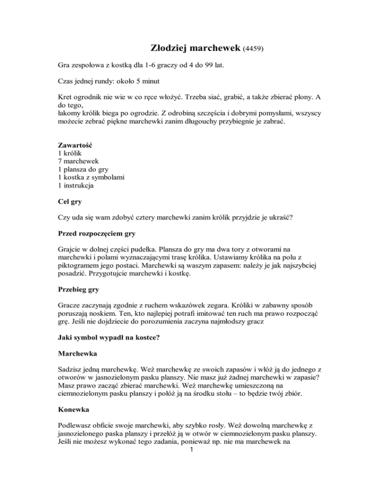 Złodziej marchewek (4459) Gra zespołowa z kostką dla 1-6 graczy od 4 do 99 lat. Czas jednej rundy: około 5 minut Kret ogrodnik nie wie w co ręce włożyć. Trzeba siać, grabić, a także zbierać plony. A do tego, łakomy królik biega po ogrodzie. Z odrobiną szczęścia i dobrymi pomysłami, wszyscy możecie zebrać piękne marchewki zanim długouchy przybiegnie je zabrać. Zawartość 1 królik 7 marchewek 1 plansza do gry 1 kostka z symbolami 1 instrukcja Cel gry Czy uda się wam zdobyć cztery marchewki zanim królik przyjdzie je ukraść? Przed rozpoczęciem gry Grajcie w dolnej części pudełka. Plansza do gry ma dwa tory z otworami na marchewki i polami wyznaczającymi trasę królika. Ustawiamy królika na polu z piktogramem jego postaci. Marchewki są waszym zapasem: należy je jak najszybciej posadzić. Przygotujcie marchewki i kostkę. Przebieg gry Gracze zaczynają zgodnie z ruchem wskazówek zegara. Króliki w zabawny sposób poruszają noskiem. Ten, kto najlepiej potrafi imitować ten ruch ma prawo rozpocząć grę. Jeśli nie dojdziecie do porozumienia zaczyna najmłodszy gracz Jaki symbol wypadł na kostce? Marchewka Sadzisz jedną marchewkę. Weź marchewkę ze swoich zapasów i włóż ją do jednego z otworów w jasnozielonym pasku planszy. Nie masz już żadnej marchewki w zapasie? Masz prawo zacząć zbierać marchewki. Weź marchewkę umieszczoną na ciemnozielonym pasku planszy i połóż ją na środku stołu – to będzie twój zbiór. Konewka Podlewasz obficie swoje marchewki, aby szybko rosły. Weź dowolną marchewkę z jasnozielonego paska planszy i przełóż ją w otwór w ciemnozielonym pasku planszy. Jeśli nie możesz wykonać tego zadania, ponieważ np. nie ma marchewek na 1 jasnozielonym polu, masz prawo ponownie rzucić kostką. Kret ogrodnik Masz prawo podjąć decyzję, co będziesz robił. ⦁ Jeśli masz jeszcze zapas marchewek możesz posadzić jedną lub możesz ją podlać ⦁ Jeśli posadziłeś już wszystkie marchewki, masz prawo podlać jedną z nich lub jedną zebrać Królik Czy ukradnie wam marchewki? Przesuń królika o jedno pole. Jeśli znajdzie się na polu, na którym znajduje się jedna lub nawet dwie marchewki, ma prawo je zabrać. Należy odłożyć jego zbiory do przykrywki pudełka. To są zapasy królika. Dwa króliki Królik skacze z całej siły. Przesuń królika o dwa pola. Jeśli może zabrać już jedną marchewkę na pierwszym polu, ma do tego prawo. Jeśli na drugim polu również znajdują się marchewki to one także należą do królika. Zebrane marchewki włóż do przykrywki pudełka. Gra kończy się gdy... ...królik zebrał cztery marchewki. W tym przypadku , gracz przegrywają. Ale nie załamujcie się wygracie następnym razem. ...cztery marchewki znajdują się na środku stołu. Wówczas świadczy to o tym, że jesteście dobrymi ogrodnikami i wszyscy wygraliście tę partię. Dla uczczenia wygranej możecie przygotować surówkę z marchewki Wariant dla jednego gracza Możesz grać sam przeciwko królikowi. Czy uda ci się zdobyć cztery marchewki. 2