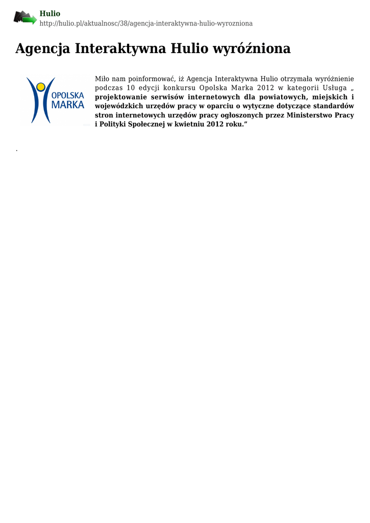 Hulio http://hulio.pl/aktualnosc/38/agencja-interaktywna-hulio-wyrozniona Agencja Interaktywna Hulio wyróźniona Miło nam poinformować, iż Agencja Interaktywna Hulio otrzymała wyróżnienie podczas 10 edycji konkursu Opolska Marka 2012 w kategorii Usługa „ projektowanie serwisów internetowych dla powiatowych, miejskich i wojewódzkich urzędów pracy w oparciu o wytyczne dotyczące standardów stron internetowych urzędów pracy ogłoszonych przez Ministerstwo Pracy i Polityki Społecznej w kwietniu 2012 roku.” .