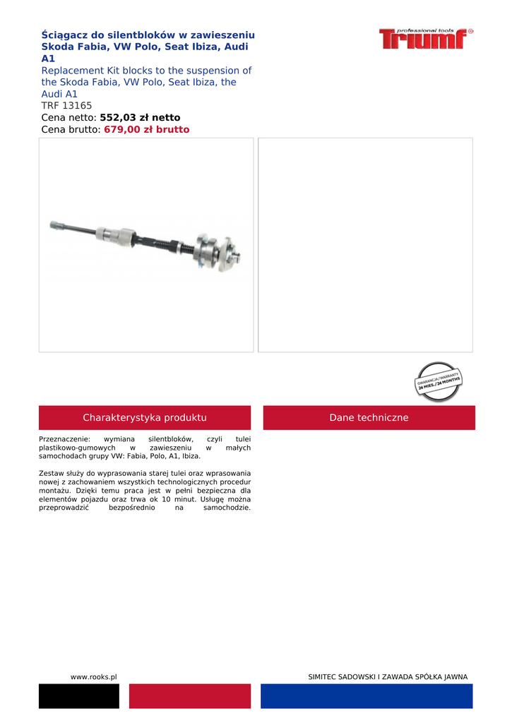 Ściągacz do silentbloków w zawieszeniu Skoda Fabia, VW Polo, Seat Ibiza, Audi A1 Replacement Kit blocks to the suspension of the Skoda Fabia, VW Polo, Seat Ibiza, the Audi A1 TRF 13165 Cena netto: 552,03 zł netto Cena brutto: 679,00 zł brutto Charakterystyka produktu Dane techniczne Przeznaczenie: wymiana silentbloków, czyli tulei plastikowo-gumowych w zawieszeniu w małych samochodach grupy VW: Fabia, Polo, A1, Ibiza. Zestaw służy do wyprasowania starej tulei oraz wprasowania nowej z zachowaniem wszystkich technologicznych procedur montażu. Dzięki temu praca jest w pełni bezpieczna dla elementów pojazdu oraz trwa ok 10 minut. Usługę można przeprowadzić bezpośrednio na samochodzie. www.rooks.pl SIMITEC SADOWSKI I ZAWADA SPÓŁKA JAWNA