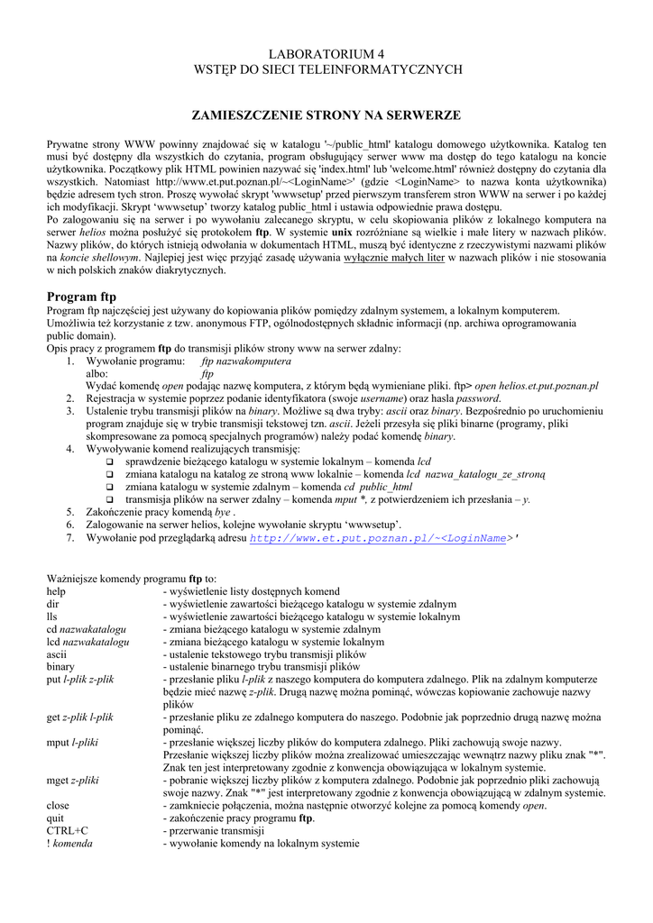 LABORATORIUM 4 WSTĘP DO SIECI TELEINFORMATYCZNYCH ZAMIESZCZENIE STRONY NA SERWERZE Prywatne strony WWW powinny znajdować się w katalogu '~/public_html' katalogu domowego użytkownika. Katalog ten musi być dostępny dla wszystkich do czytania, program obsługujący serwer www ma dostęp do tego katalogu na koncie użytkownika. Początkowy plik HTML powinien nazywać się 'index.html' lub 'welcome.html' również dostępny do czytania dla wszystkich. Natomiast http://www.et.put.poznan.pl/~<LoginName>' (gdzie <LoginName> to nazwa konta użytkownika) będzie adresem tych stron. Proszę wywołać skrypt 'wwwsetup' przed pierwszym transferem stron WWW na serwer i po każdej ich modyfikacji. Skrypt ‘wwwsetup’ tworzy katalog public_html i ustawia odpowiednie prawa dostępu. Po zalogowaniu się na serwer i po wywołaniu zalecanego skryptu, w celu skopiowania plików z lokalnego komputera na serwer helios można posłużyć się protokołem ftp. W systemie unix rozróżniane są wielkie i małe litery w nazwach plików. Nazwy plików, do których istnieją odwołania w dokumentach HTML, muszą być identyczne z rzeczywistymi nazwami plików na koncie shellowym. Najlepiej jest więc przyjąć zasadę używania wyłącznie małych liter w nazwach plików i nie stosowania w nich polskich znaków diakrytycznych. Program ftp Program ftp najczęściej jest używany do kopiowania plików pomiędzy zdalnym systemem, a lokalnym komputerem. Umożliwia też korzystanie z tzw. anonymous FTP, ogólnodostępnych składnic informacji (np. archiwa oprogramowania public domain). Opis pracy z programem ftp do transmisji plików strony www na serwer zdalny: 1. Wywołanie programu: ftp nazwakomputera albo: ftp Wydać komendę open podając nazwę komputera, z którym będą wymieniane pliki. ftp> open helios.et.put.poznan.pl 2. Rejestracja w systemie poprzez podanie identyfikatora (swoje username) oraz hasla password. 3. Ustalenie trybu transmisji plików na binary. Możliwe są dwa tryby: ascii oraz binary. Bezpośrednio po uruchomieniu program znajduje się w trybie transmisji tekstowej tzn. ascii. Jeżeli przesyła się pliki binarne (programy, pliki skompresowane za pomocą specjalnych programów) należy podać komendę binary. 4. Wywoływanie komend realizujących transmisję: sprawdzenie bieżącego katalogu w systemie lokalnym – komenda lcd zmiana katalogu na katalog ze stroną www lokalnie – komenda lcd nazwa_katalogu_ze_stroną zmiana katalogu w systemie zdalnym – komenda cd public_html transmisja plików na serwer zdalny – komenda mput *, z potwierdzeniem ich przesłania – y. 5. Zakończenie pracy komendą bye . 6. Zalogowanie na serwer helios, kolejne wywołanie skryptu ‘wwwsetup’. 7. Wywołanie pod przeglądarką adresu http://www.et.put.poznan.pl/~<LoginName>' Ważniejsze komendy programu ftp to: help - wyświetlenie listy dostępnych komend dir - wyświetlenie zawartości bieżącego katalogu w systemie zdalnym lls - wyświetlenie zawartości bieżącego katalogu w systemie lokalnym cd nazwakatalogu - zmiana bieżącego katalogu w systemie zdalnym lcd nazwakatalogu - zmiana bieżącego katalogu w systemie lokalnym ascii - ustalenie tekstowego trybu transmisji plików binary - ustalenie binarnego trybu transmisji plików put l-plik z-plik - przesłanie pliku l-plik z naszego komputera do komputera zdalnego. Plik na zdalnym komputerze będzie mieć nazwę z-plik. Drugą nazwę można pominąć, wówczas kopiowanie zachowuje nazwy plików get z-plik l-plik - przesłanie pliku ze zdalnego komputera do naszego. Podobnie jak poprzednio drugą nazwę można pominąć. mput l-pliki - przesłanie większej liczby plików do komputera zdalnego. Pliki zachowują swoje nazwy. Przesłanie większej liczby plików można zrealizować umieszczając wewnątrz nazwy pliku znak "*". Znak ten jest interpretowany zgodnie z konwencja obowiązująca w lokalnym systemie. mget z-pliki - pobranie większej liczby plików z komputera zdalnego. Podobnie jak poprzednio pliki zachowują swoje nazwy. Znak "*" jest interpretowany zgodnie z konwencja obowiązującą w zdalnym systemie. close - zamkniecie połączenia, można następnie otworzyć kolejne za pomocą komendy open. quit - zakończenie pracy programu ftp. CTRL+C - przerwanie transmisji ! komenda - wywołanie komendy na lokalnym systemie
