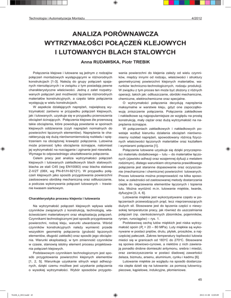 Technologia i Automatyzacja Montażu 4/2012 ANALIZA PORÓWNAWCZA WYTRZYMAŁOŚCI POŁĄCZEŃ KLEJOWYCH I LUTOWANYCH BLACH STALOWYCH Anna Rudawska, Piotr trebik Połączenia klejowe i lutowane są jednym z rodzajów połączeń montażowych występującymi w różnorodnych konstrukcjach [1-3]. Należą do grupy połączeń spajanych nierozłącznych i w związku z tym posiadają pewne charakterystyczne właściwości. Jedną z zalet rozpatrywanych połączeń jest możliwość łączenia różnorodnych materiałów konstrukcyjnych, a często takie połączenia występują w wielu konstrukcjach. W aspekcie działających naprężeń, największą wytrzymałość zarówno w przypadku połączeń klejowych, jak i lutowanych, uzyskuje się w przypadku przenoszenia obciążeń ścinających. Połączenia klejowe źle przenoszą takie obciążenia, które powodują powstanie w spoinach klejowych oddzierania (czyli naprężeń normalnych do powierzchni łączonych elementów). Naprężenia te charakteryzują się dużą nierównomiernością rozkładu i spiętrzeniem na obciążonej krawędzi połączenia. Lutowina może przenosić tylko obciążenia ścinające, natomiast jej wytrzymałość na rozciąganie i zginanie jest niewielka. Wymaga to odpowiedniego ukształtowania połączenia. Celem pracy jest analiza wytrzymałości połączeń klejowych i lutowanych zakładkowych blach stalowych: blacha ze stali C45 (wg EN10083) oraz blacha stalowa Z-II/2T (08X, wg PN-81/H-92121). W przypadku połączeń klejowych jako sposób przygotowania powierzchni zastosowano obróbkę mechaniczną oraz odtłuszczanie, a podczas wykonywania połączeń lutowanych – trawienie kwasem siarkowym. Charakterystyka procesu klejenia i lutowania Na wytrzymałość połączeń klejowych wpływa wiele czynników związanych z konstrukcją, technologią, właściwościami materiałowymi oraz eksploatacją połączeń. Czynnikami technologicznymi jest sposób przygotowania powierzchni, rodzaj kleju, warunki utwardzania. Wśród czynników konstrukcyjnych należy wymienić przede wszystkim geometrię połączenia (grubość łączonych elementów, długość zakładki) oraz sposób jego obciążenia. Warunki eksploatacji, w tym zmienność czynników w czasie, stanowią istotny element procesu projektowania połączeń klejowych. Podstawowym czynnikiem technologicznym jest sposób przygotowania powierzchni klejonych elementów [1, 2, 5]. Warunkuje uzyskanie silnych więzi adhezyjnych, dzięki czemu możliwe jest uzyskanie połączenia o wysokiej wytrzymałości. Wybór sposobów przygoto- wania powierzchni do klejenia zależy od wielu czynników, między innymi od rodzaju, właściwości i struktury geometrycznej powierzchni klejonych materiałów, warunków techniczno-technologicznych, rodzaju produkcji. W związku z tym proces ten może być złożony z różnych operacji, takich jak: odtłuszczanie, obróbki mechaniczne, chemiczne, elektrochemiczne oraz specjalne. O wytrzymałości połączenia decydują naprężenia maksymalne w warstwie kleju, gdyż one zapoczątkowują zniszczenie połączenia. Połączenia zakładkowe i nakładkowe są najpopularniejsze ze względu na prostą konstrukcję, mały ciężar oraz dużą wytrzymałość na naprężenia ścinające. W połączeniach zakładkowych i nakładkowych powstaje wzdłuż kierunku działania obciążeń nierównomierny rozkład naprężeń, spowodowany różnicą fizycznych właściwości łączonych materiałów oraz kształtem i wymiarami połączenia [1]. Połączenie lutowane uzyskuje się dzięki przyczepności materiału dodatkowego – lutu – do materiałów łączonych (zjawisko adhezji oraz wzajemnej dyfuzji z metalem rodzimym), dlatego warunkiem otrzymania prawidłowego połączenia jest staranne dopasowanie oraz oczyszczenie (mechaniczne i chemiczne) powierzchni lutowanych. Proces lutowania można przeprowadzić na kilka sposobów, w zależności od zastosowanej metody dostarczania ciepła do nagrzewania elementów łączonych i topienia lutu. Można wyróżnić m.in. lutowanie miękkie, twarde, dyfuzyjne [3, 4, 6]. Lutowanie miękkie jest wykorzystywane często w połączeniach przewodzących prąd, lecz nieprzenoszących dużych sił. Stosowane jest do łączenia części o niewysokiej temperaturze pracy, jak również do uszczelniania połączeń (np. cienkościennych zbiorników, pojemników, rynien, rurociągów) – rys. 1. Podstawową cechą lutów miękkich jest niska wytrzymałość spoin (Rt = 20 – 80 MPa). Luty miękkie są wykonywane w postaci prętów, drutu, płytek, proszków, a najczęściej pałeczek. Zakres temperatury topliwości lutowia mieści się w granicach od 183oC do 270oC. Stosowane są spoiwa ołowiowo-cynowe, a niektóre z nich zawierają ponadto drobne domieszki antymonu, srebra i miedzi, oraz zanieczyszczenia w postaci śladowej zawartości żelaza, bizmutu, arsenu, aluminium, cynku i kadmu [6]. Lutowanie miękkie ze względu na sposób dostarczania ciepła dzieli się na lutowanie: za pomocą lutownicy, piecowe, kąpielowe, indukcyjne, płomieniowe. 45 TiAM_4_2012.indd 45 2012-11-08 12:05:09 4/2012 Technologia i Automatyzacja Montażu •• Charakterystyka połączeń klejowych Do badań wykorzystano połączenia klejowe jednozakładkowe wykonane z blach ze stali C45 i blach ze stali do tłoczenia Z-II/2T, których geometrię zamieszczono na rys. 2. a) Rys. 1. Połączenia lutowane lutami miękkimi [3] Lutowanie twarde jest połączeniem o właściwościach pośrednich pomiędzy lutowaniem miękkim a spawaniem. Lutowanie twarde umożliwia łączenie blach, kształtowników, części mechanizmów, elementów narzędzi skrawających. Do najbardziej perspektywicznych metod łączenia nowoczesnych materiałów inżynierskich zalicza się m.in. lutowanie dyfuzyjne. Metoda ta łączy cechy zgrzewania dyfuzyjnego i lutowania [7]. Wykonanie połączenia lutowanego wymaga doboru odpowiedniej metody lutowania, właściwego rod