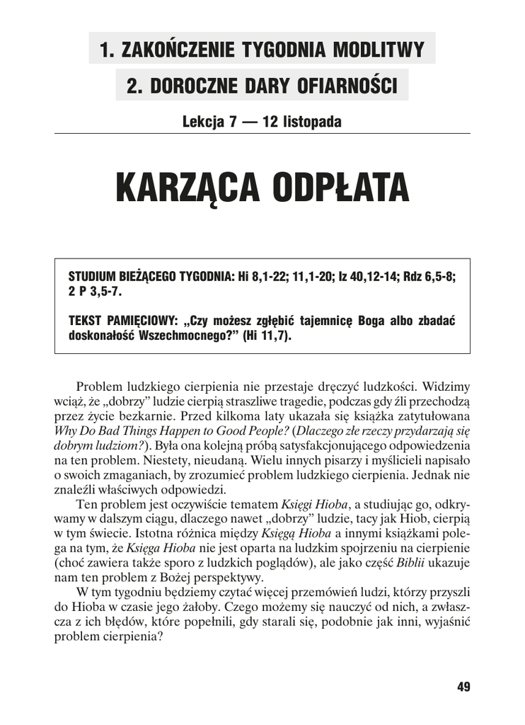 1. ZAKOŃCZENIE TYGODNIA MODLITWY 2. DOROCZNE DARY OFIARNOŚCI Lekcja 7 — 12 listopada KARZĄCA ODPŁATA STUDIUM BIEŻĄCEGO TYGODNIA: Hi 8,1-22; 11,1-20; Iz 40,12-14; Rdz 6,5-8; 2 P 3,5-7. TEKST PAMIĘCIOWY: „Czy możesz zgłębić tajemnicę Boga albo zbadać doskonałość Wszechmocnego?” (Hi 11,7). Problem ludzkiego cierpienia nie przestaje dręczyć ludzkości. Widzimy wciąż, że „dobrzy” ludzie cierpią straszliwe tragedie, podczas gdy źli przechodzą przez życie bezkarnie. Przed kilkoma laty ukazała się książka zatytułowana Why Do Bad Things Happen to Good People? (Dlaczego złe rzeczy przydarzają się dobrym ludziom?). Była ona kolejną próbą satysfakcjonującego odpowiedzenia na ten problem. Niestety, nieudaną. Wielu innych pisarzy i myślicieli napisało o swoich zmaganiach, by zrozumieć problem ludzkiego cierpienia. Jednak nie znaleźli właściwych odpowiedzi. Ten problem jest oczywiście tematem Księgi Hioba, a studiując go, odkrywamy w dalszym ciągu, dlaczego nawet „dobrzy” ludzie, tacy jak Hiob, cierpią w tym świecie. Istotna różnica między Księgą Hioba a innymi książkami polega na tym, że Księga Hioba nie jest oparta na ludzkim spojrzeniu na cierpienie (choć zawiera także sporo z ludzkich poglądów), ale jako część Biblii ukazuje nam ten problem z Bożej perspektywy. W tym tygodniu będziemy czytać więcej przemówień ludzi, którzy przyszli do Hioba w czasie jego żałoby. Czego możemy się nauczyć od nich, a zwłaszcza z ich błędów, które popełnili, gdy starali się, podobnie jak inni, wyjaśnić problem cierpienia? 49 Więcej oskarżeń NIEDZIELA — 6 listopada Jakby wykład Elifaza nie był wystarczająco dotkliwy, Hiob musiał wysłuchać potem mowy Bildada, który powiedział coś podobnego do tego, co wcześniej wygłosił Elifaz. Niestety, Bildad był mniej wrażliwy i bardziej surowy niż Elifaz. Wyobraź sobie, że odwiedzasz kogoś, kto stracił dzieci, i mówisz mu: — „Gdy twoi synowie zgrzeszyli przeciwko niemu, wydał ich na łup ich występku” (Hi 8,4). Jest w tym ironia, jako że 1. rozdział Księgi Hioba (zob. Hi 1,5) mówi jasno, że Hiob składał ofiary za swoje dzieci właśnie z tego powodu — na wypadek gdyby zgrzeszyły. Tak więc widzimy tu przeciwieństwo między zrozumieniem łaski (widocznym w postępowaniu Hioba), a pierwszymi słowami Bildada, które ukazywały surowy i mściwy legalizm. Co gorsza, Bildad przemawia w taki sposób, usiłując bronić charakter Boga. Przeczytaj Hi 8,1-22. Jaki argument przytacza Bildad i ile prawdy jest w jego słowach? Gdybyś miał zapomnieć o bezpośrednim kontekście i zwracać uwagę tylko na wyrażone uczucia, jakie błędy znalazłbyś w tych słowach? ................................................................................................................................................................................................................................................................... ................................................................................................................................................................................................................................................................... Trudno znaleźć jakikolwiek błąd w większości tego, co mówi Bildad: — „Wszak my od wczoraj jesteśmy i nic nie wiemy, gdyż nasze dni są cieniem na ziemi” (Hi 8,9). To mocne, prawdziwe i bardzo biblijne słowa (zob. Jk 4,14). Albo co złego mogłoby być w jego ostrzeżeniu przed bezbożnikiem, który pokłada nadzieję w ziemskich rzeczach i ufa czemuś, co jest słabe jak pajęczyna (zob. Hi 8,14)? Przecież te myśli są tak głęboko biblijne. Przypuszczalnie największym problemem jest to, że Bildad przedstawia tylko jeden rys charakteru Boga. To jest przykład skrajności — wpadania w rów z jednej strony drogi albo z drugiej. Każda skrajność jest niewłaściwa. Ktoś może, na przykład, skupiać się wyłącznie na prawie, sprawiedliwości i posłuszeństwie, podczas gdy ktoś inny jedynie na łasce, przebaczeniu i zastępczej ofierze. Każda skrajność zazwyczaj prowadzi do wypaczonego obrazu Boga i prawdy. Dostrzegamy tu podobny problem. Jako ludzie powinniśmy zawsze dążyć do równowagi między prawem i łaską w naszej teologii i postępowaniu z ludźmi. Jednak jeśli miałbyś popełnić błąd (co jako ludziom nam się zdarza), po której stronie byłoby lepiej błądzić w postępowaniu z błądzącymi? Dlaczego? 50 Mniej niż zasłużyłeś przez swoje winy PONIEDZIAŁEK — 7 listopada — „Czy możesz zgłębić tajemnicę Boga albo zbadać doskonałość Wszechmocnego? Wyższa jest niż niebiosa — cóż poczniesz? Głębsza jest niż kraina umarłych — cóż ty wiesz? Jej miara jest dłuższa niż ziemia, a szersza nawet niż morze” (Hi 11,7-9; zob. także Iz 40,12-14). Jaka prawda została wyrażona w tych słowach i dlaczego ważne jest, byśmy zawsze o niej pamiętali? ................................................................................................................................................................................................................................................................... Powyższe słowa są pięknym wyrażeniem faktu, że tak wielu rzeczy nie wiemy o Bogu, a wszystkie nasze starania, by znaleźć Go o własnych siłach, nie pomogą nam dowiedzieć się niemal nic więcej. Ciekawe, że jeden z amerykańskich XX-wiecznych filozofów, Richard Rorty, w zasadzie twierdził, że nigdy nie zrozumiemy rzeczywistości ani prawdy, więc nawet nie powinniśmy próbować. Twierdził, że zamiast próbować zrozumieć rzeczywistość, możemy jedynie starać się z nią sobie poradzić. Ciekawe, że 2,6 tys. lat filozoficznej tradycji zachodniej doprowadziło jedynie do tego wyrazu klęski. Jeśli wszystkie nasze poszukiwania pozostawiają nas w ciemności co do natury rzeczywistości, 