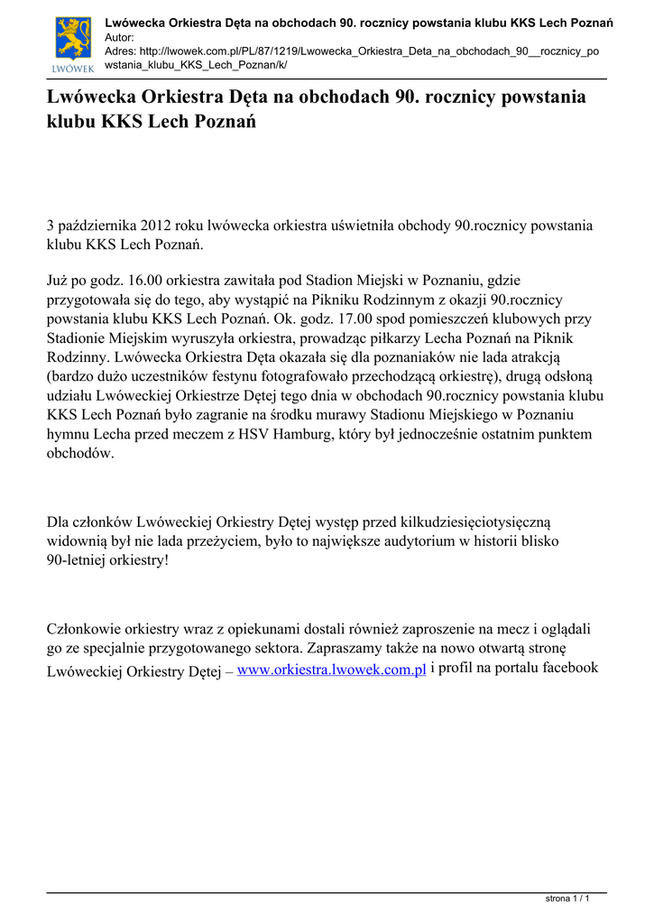Lwówecka Orkiestra Dęta na obchodach 90. rocznicy powstania klubu KKS Lech Poznań Autor: Adres: http://lwowek.com.pl/PL/87/1219/Lwowecka_Orkiestra_Deta_na_obchodach_90__rocznicy_po wstania_klubu_KKS_Lech_Poznan/k/ Lwówecka Orkiestra Dęta na obchodach 90. rocznicy powstania klubu KKS Lech Poznań 3 października 2012 roku lwówecka orkiestra uświetniła obchody 90.rocznicy powstania klubu KKS Lech Poznań. Już po godz. 16.00 orkiestra zawitała pod Stadion Miejski w Poznaniu, gdzie przygotowała się do tego, aby wystąpić na Pikniku Rodzinnym z okazji 90.rocznicy powstania klubu KKS Lech Poznań. Ok. godz. 17.00 spod pomieszczeń klubowych przy Stadionie Miejskim wyruszyła orkiestra, prowadząc piłkarzy Lecha Poznań na Piknik Rodzinny. Lwówecka Orkiestra Dęta okazała się dla poznaniaków nie lada atrakcją (bardzo dużo uczestników festynu fotografowało przechodzącą orkiestrę), drugą odsłoną udziału Lwóweckiej Orkiestrze Dętej tego dnia w obchodach 90.rocznicy powstania klubu KKS Lech Poznań było zagranie na środku murawy Stadionu Miejskiego w Poznaniu hymnu Lecha przed meczem z HSV Hamburg, który był jednocześnie ostatnim punktem obchodów. Dla członków Lwóweckiej Orkiestry Dętej występ przed kilkudziesięciotysięczną widownią był nie lada przeżyciem, było to największe audytorium w historii blisko 90-letniej orkiestry! Członkowie orkiestry wraz z opiekunami dostali również zaproszenie na mecz i oglądali go ze specjalnie przygotowanego sektora. Zapraszamy także na nowo otwartą stronę Lwóweckiej Orkiestry Dętej – www.orkiestra.lwowek.com.pl i profil na portalu facebook strona 1 / 1 Powered by TCPDF (www.tcpdf.org)