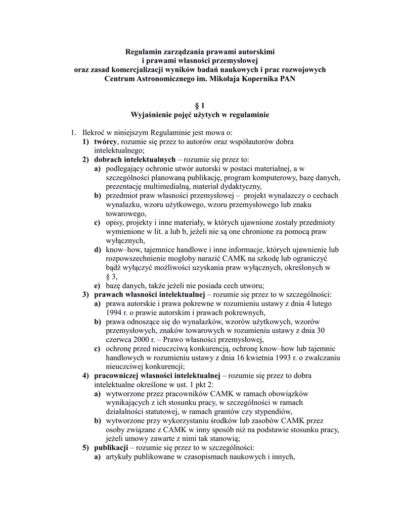 Regulamin zarządzania prawami autorskimi i prawami własności przemysłowej oraz zasad komercjalizacji wyników badań naukowych i prac rozwojowych Centrum Astronomicznego im. Mikołaja Kopernika PAN §1 Wyjaśnienie pojęć użytych w regulaminie 1. Ilekroć w niniejszym Regulaminie jest mowa o: 1) twórcy, rozumie się przez to autorów oraz współautorów dobra intelektualnego; 2) dobrach intelektualnych – rozumie się przez to: a) podlegający ochronie utwór autorski w postaci materialnej, a w szczególności planowaną publikację, program komputerowy, bazę danych, prezentację multimedialną, materiał dydaktyczny, b) przedmiot praw własności przemysłowej – projekt wynalazczy o cechach wynalazku, wzoru użytkowego, wzoru przemysłowego lub znaku towarowego, c) opisy, projekty i inne materiały, w których ujawnione zostały przedmioty wymienione w lit. a lub b, jeżeli nie są one chronione za pomocą praw wyłącznych, d) know–how, tajemnice handlowe i inne informacje, których ujawnienie lub rozpowszechnienie mogłoby narazić CAMK na szkodę lub ograniczyć bądź wyłączyć możliwości uzyskania praw wyłącznych, określonych w § 3, e) bazę danych, także jeżeli nie posiada cech utworu; 3) prawach własności intelektualnej – rozumie się przez to w szczególności: a) prawa autorskie i prawa pokrewne w rozumieniu ustawy z dnia 4 lutego 1994 r. o prawie autorskim i prawach pokrewnych, b) prawa odnoszące się do wynalazków, wzorów użytkowych, wzorów przemysłowych, znaków towarowych w rozumieniu ustawy z dnia 30 czerwca 2000 r. – Prawo własności przemysłowej, c) ochronę przed nieuczciwą konkurencją, ochronę know–how lub tajemnic handlowych w rozumieniu ustawy z dnia 16 kwietnia 1993 r. o zwalczaniu nieuczciwej konkurencji; 4) pracowniczej własności intelektualnej – rozumie się przez to dobra intelektualne określone w ust. 1 pkt 2: a) wytworzone przez pracowników CAMK w ramach obowiązków wynikających z ich stosunku pracy, w szczególności w ramach działalności statutowej, w ramach grantów czy stypendiów, b) wytworzone przy wykorzystaniu środków lub zasobów CAMK przez osoby związane z CAMK w inny sposób niż na podstawie stosunku pracy, jeżeli umowy zawarte z nimi tak stanowią; 5) publikacji – rozumie się przez to w szczególności: a) artykuły publikowane w czasopismach naukowych i innych, b) książki, skrypty, foldery, materiały szkoleniowe, w tym materiały w kursach e-learning oraz ich części, c) referaty, odczyty, wykłady i inne wystąpienia publiczne, w tym na konferencjach naukowych, zjazdach, seminariach, lub prowadzone w ramach pracy dydaktycznej, d) prezentacje multimedialne wykorzystywane zarówno podczas wystąpień określonych w c), jak i publikowane on line, e) postery, plakaty i inne plastyczne przedstawienia wyników, f) inne udostępniane publicznie przedstawienia tekstowe, tabelaryczne, graficzne i pozostałe; 6) know-how – rozumie się przez to wiedzę techniczną, technologiczną, organizacyjną lub inną posiadająca wartość gospodarczą; 7) komercjalizacji – rozumie się przez to działanie podjęte w celu udostępnienia prawa do korzystania z wyniku badania innym podmiotom, za wynagrodzeniem, w szczególności poprzez: a) udostępnienie wyniku osobie prawnej lub fizycznej za wynagrodzeniem, a w szczególności przez udzielenie licencji na korzystanie z tego wyniku, b) przeniesienie prawa własności do tego wyniku na osobę prawną lub fizyczną za wynagrodzeniem, c) sprzedaż lub dzierżawienie przedmiotu, na którym utrwalony został utwór autorski, osobie prawnej lub fizycznej, d) utworzenie spółki handlowej z udziałem CAMK, w której będzie komercjalizowany wynik badania; 8) procesie komercjalizacji – rozumie się przez to zarówno czynności prawne i faktyczne zmierzające do udostępnienia określonego w pkt 7 jak i cały okres pobierania z tego tytułu pożytków przez CAMK przy jednoczesnym przysługiwaniu praw majątkowych twórcy; 9) Komisji – rozumie się przez to komisję, o której mowa w § 13. 2. Ilekroć w niniejszym Regulaminie mowa o „pracowniku” lub „osobach zatrudnionych w Instytucie”, pojęcie to odnosi się również do doktoranta, studenta, praktykanta lub innej osoby wykonującej prace w CAMK na podstawie innego rodzaju umowy – jeśli ta umowa bądź warunki wykonywania prac tak stanowią. §2 Zakres zastosowania 1. Niniejszy Regulamin ustala: 1) prawa i obowiązki Centrum Astronomicznego im. Mikołaja Kopernika PAN, zwanego dalej CAMK, oraz jego pracowników i doktorantów, w zakresie ochrony i korzystania z praw autorskich i praw pokrewnych oraz praw własności przemysłowej; 2) zasady wynagradzania twórców; 3) zasady podziału środków uzyskanych z komercjalizacji między twórcą będącym pracownikiem CAMK a CAMK; 4) zasady i procedury komercjalizacji wyników badań naukowych i prac rozwojowych oraz know-how związanego z tymi wynikami; 5) zasady korzystania z majątku CAMK wykorzystywanego do komercjalizacji wyników badań naukowych i prac rozwojowych oraz świadczenia usług naukowo-badawczych; 6) zasady i tryb przekazywania CAMK przez twórcę informacji o wynikach badań naukowych lub prac rozwojowych oraz o know-how związanym z tymi wynikami, informacji o uzyskanych przez twórcę środkach z komercjalizacji oraz zasady i tryb przekazywania przez twórcę przysługujących CAMK części środków uzyskanych z komercjalizacji; 7) zasady i tryb przekazywania twórcy przez CAMK informacji o decyzjach co do komercjalizacji oraz zasady i tryb przekazywania przez CAMK przysługujących twórcy części środków uzyskanych z komercjalizacji. 2. Niniejszy Regulamin znajduje zastosowanie do dóbr intelektualnych powstałych na podstawie umów o pracę oraz innych umów, których stroną jest CAMK, jeżeli umowy te tak stanowią. §3 Prawa do pracowniczej własności intelektualnej 1. Do dóbr intelektualnych stworzonych przez praco