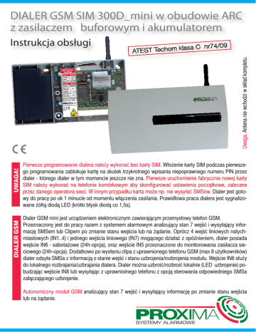 DIALER GSM SIM 300D_mini w obudowie ARC z zasilaczem buforowym i akumulatorem DIALER GSM UWAGA! UWAG asa C nr74/09 ATEST Techom kl Uwaga. Antena nie wchodzi w skład kompletu. Instrukcja obsługi Pierwsze programowanie dialera należy wykonać bez karty SIM. Włożenie karty SIM podczas pierwszego programowania zablokuje kartę na skutek trzykrotnego wpisania niepoprawnego numeru PIN przez dialer - którego dialer w tym momencie jeszcze nie zna. Pierwsze uruchomienie fabrycznie nowej karty SIM należy wykonać na telefonie komórkowym aby skonfigurować ustawienia początkowe, zalecane przez danego operatora sieci. W innym przypadku karta może np. nie wysyłać SMSów. Dialer jest gotowy do pracy po ok 1 minucie od momentu włączenia zasilania. Prawidłowa praca dialera jest sygnalizowane żółtą diodą LED (krótki błysk diodą co 1,5s). Dialer GSM mini jest urządzeniem elektronicznym zawierającym przemysłowy telefon GSM. Przeznaczony jest do pracy razem z systemem alarmowym analizujący stan 7 wejść i wysyłający informację SMSem lub Clipem po zmianie stanu wejścia lub na żądanie. Oprócz 4 wejść liniowych natychmiastowych (IN1..4) i jednego wejścia liniowego (IN7) mogącego działać z opóźnieniem, dialer posiada wejście IN6 - sabotażowe (24h-opcja), oraz wejście IN5 przeznaczone do monitorowania zasilacza sieciowego (24h-opcja). Dodatkowo po wysłaniu clipa z uprawnionego telefonu GSM (max 8 użytkowników) dialer odsyła SMSa z informacją o stanie wejść i stanu uzbrojenia/rozbrojenia modułu. Wejście IN8 służy do lokalnego rozbrajania/uzbrajania dialera. Dialer można uzbroić/rozbroić lokalnie (LED uzbrojenie) pobudzając wejście IN8 lub wysyłając z uprawnioinego telefonu z opcją sterowania odpowiedniego SMSa załączającego uzbrojenie. Autonomiczny moduł GSM analizujący stan 7 wejść i wysyłający informację po zmianie stanu wejścia lub na żądanie. Charakterystyka urządzenia t 8 wejść, w tym 6 natychmiastowych (IN1-do IN 4), wej. IN5 kontrolujące zasilacz sieciowy (może być 24h) , wej. IN6 będące linią sabotażową (może być 24h), 1 zwłoczne przy powrocie do obiektu/natychmiastowe (IN7), 1 uzbrajające/ rozbrajające (IN8). Tylko uzbrojone urządzenie reaguje na stan wejść (wyjątkiem są wej. IN5 i IN6, jeśli są 24h), t Możliwość zdalnego odczytu stanu 8 wejść (Wysłanie CLIPa, odpowiedź SMS), tzw. status dialera, t Możliwość zdalnego sterowania dialerem poprzez wiadomość SMS (uzbrojenie/rozbrojenie), t Możliwość lokalnego uzbrojenia/rozbrojenia (wej. nr 8), t Zaprogramowanie do 8 numerów telefonów użytkowników, t Każdy z użytkowników może mieć ustawione uprawnienia do uzbrajania/rozbrajania, t Osiem niezależnych testów o zaprogramowanych godzinach, t Tabela max 64 reakcji na zdarzenia. Zdarzeniem jest zmiana stanu na wejściu 1-7 i nadejście każdej zaprogramowanej godziny bezwzględnego sygnału testowego, oraz uzbrojenie i rozbrojenie dialera, t Programowane ograniczenie ilości komunikatów wysyłanych w ciągu 1 godziny, t Wysyłanie SMSów o maksymalnej długości 56 znaków. Działanie urządzenia Opis wejść t IN1..4 - wejścia natychmiastowe, pobudzeniem jest sygnał masy, a usunięcie sygnału masy-powrotem. Natychmiastowe oznacza bezzwłoczną reakcję dialera jeżeli jest uzbrojony, t IN5 - pobudzeniem jest zanik napięcia, powrotem pojawienie się napięcia - przeznaczczone do obserwacji napięcia zasilacza sieciowego - pozwala poinformować właściciela o braku napięcia 230V, może być zaprogramowane jako aktywne niezależnie od stanu uzbrojenia dialera (24h). Rys na stronie nr1. t IN6 - pobudzeniem jest sygnał masy, a usunięcie sygnału masy-powrotem - może być zaprogramowane jako aktywne niezależnie od stanu uzbrojenia dialera (24h), t IN7- wejście z opcją zwłoczności, pobudzeniem jest sygnał masy, a usunięcie sygnału masy-powrotem , reakcja wykonywana jest z opóźnieniem 20s, chyba że nastąpi wcześniejsze rozbrojenie dialera, wtedy reakcja nie jest wykonywana, t IN8 - wejście uzbrojenia/rozbrojenia alarmu - podanie sygnału masy, brak masy lub impuls masy powoduje zmianę stanu systemu i wykasowanie kolejki zdarzeń (opcja prog). Sygnalizacja t LED czerwony: (power+12V) sygnalizacja obecności napięcia zasilającego, t LED czerwony uzbrojenie: sygnalizacja uzbrojenia/rozbrojenia, t LED czerwony - (pamięć alarmu): świeci - w przypadku zajścia zdarzenia podczas uzbrojenia (wyjątkiem są wej. IN5 i IN6, jeśli są 24h), lub wystąpił zanik napięcia zasilania. Dioda ta miga do chwili rozbrojenia dialera. t LED żółty GSM : sygnalizacja pracy telefonu (krótki błysk diodą co 1,5s normalna praca), Jeżeli dialer jest uzbrojony, po wykryciu ZDARZENIA wykonuje po kolei REAKCJE (wysyła Clipy, SMSy, zgodnie z zakładką REAKCJE. Dialer rozbrojony nie reaguje na zmiany na wejściach 1-7 (wyjątkiem są wej. nr 5 i 6 które mogą być niezależne od uzbrojenia - 24h). Ponadto, niezależnie od stanu uzbrojenia, dialer może wysyłać, o zaprogramowanym czasie bezwarunkowe sygnały testowe (A-H). Odczyt stanu dialera - STATUS. Należy z zaprogramowanego numeru telefonu GSM z zaznaczoną opcją możliwością sterowania, wysłać sygnał CLIP (zadzwonić i poczekać na odrzucenie połączenia, ok. 2..3 sekundy). Po odebraniu Sygnału CLIP od uprawnionego użytkownika (dialer przesyła SMS z wiadomością o stanie uzbrojenia wszystkich wejść . Np. SMS o treści: wyj: A_ wej: NANNAANN oznacza uzbrojenie dialera, drugie, piąte i szóste wejście aktywne. Pozostałe wejścia - nieaktywne. Na pierwszej pozycji SMSa informującego o stanie może pojawić się oprócz liter A lub N (A dialer Aktywny uzbrojony, N dialer nieaktywny - rozbrojony) również litera S (S-sygnalizacja) -oznacza ona że wystąpiła reakcja na zdarzenie lub był zanik zasilania. Zmiana stanu dialera. Należy z zaprogramowanego numeru telefonu GSM, z zaznaczoną opcją możliwością sterowa