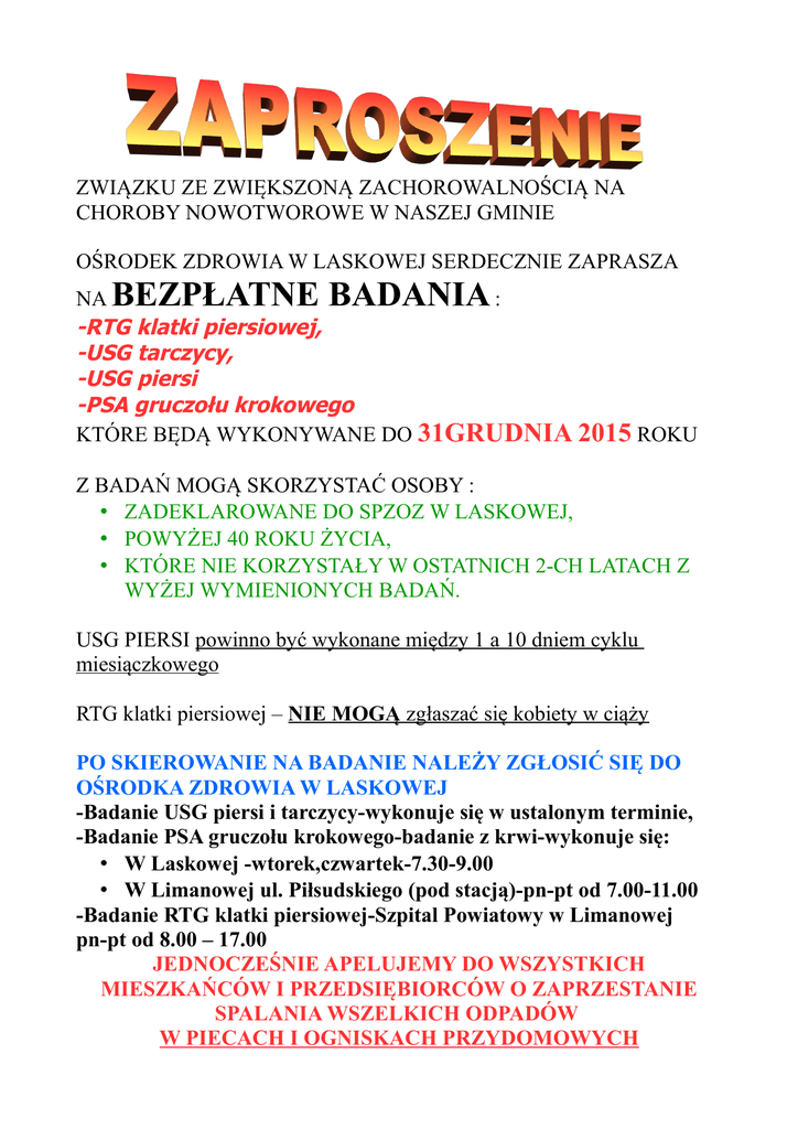 ZWIĄZKU ZE ZWIĘKSZONĄ ZACHOROWALNOŚCIĄ NA CHOROBY NOWOTWOROWE W NASZEJ GMINIE OŚRODEK ZDROWIA W LASKOWEJ SERDECZNIE ZAPRASZA BEZPŁATNE BADANIA NA : -RTG klatki piersiowej, -USG tarczycy, -USG piersi -PSA gruczołu krokowego KTÓRE BĘDĄ WYKONYWANE DO 31GRUDNIA 2015 ROKU Z BADAŃ MOGĄ SKORZYSTAĆ OSOBY : • ZADEKLAROWANE DO SPZOZ W LASKOWEJ, • POWYŻEJ 40 ROKU ŻYCIA, • KTÓRE NIE KORZYSTAŁY W OSTATNICH 2-CH LATACH Z WYŻEJ WYMIENIONYCH BADAŃ. USG PIERSI powinno być wykonane między 1 a 10 dniem cyklu miesiączkowego RTG klatki piersiowej – NIE MOGĄ zgłaszać się kobiety w ciąży PO SKIEROWANIE NA BADANIE NALEŻY ZGŁOSIĆ SIĘ DO OŚRODKA ZDROWIA W LASKOWEJ -Badanie USG piersi i tarczycy-wykonuje się w ustalonym terminie, -Badanie PSA gruczołu krokowego-badanie z krwi-wykonuje się: • W Laskowej -wtorek,czwartek-7.30-9.00 • W Limanowej ul. Piłsudskiego (pod stacją)-pn-pt od 7.00-11.00 -Badanie RTG klatki piersiowej-Szpital Powiatowy w Limanowej pn-pt od 8.00 – 17.00 JEDNOCZEŚNIE APELUJEMY DO WSZYSTKICH MIESZKAŃCÓW I PRZEDSIĘBIORCÓW O ZAPRZESTANIE SPALANIA WSZELKICH ODPADÓW W PIECACH I OGNISKACH PRZYDOMOWYCH