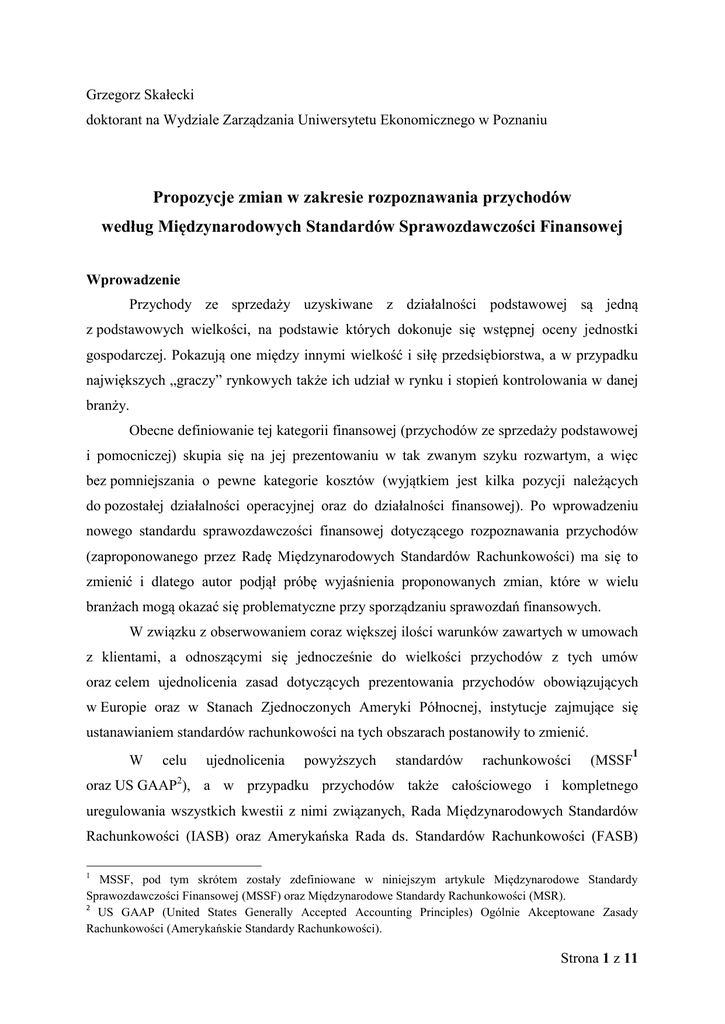 Grzegorz Skałecki doktorant na Wydziale Zarządzania Uniwersytetu Ekonomicznego w Poznaniu Propozycje zmian w zakresie rozpoznawania przychodów według Międzynarodowych Standardów Sprawozdawczości Finansowej Wprowadzenie Przychody ze sprzedaży uzyskiwane z działalności podstawowej są jedną z podstawowych wielkości, na podstawie których dokonuje się wstępnej oceny jednostki gospodarczej. Pokazują one między innymi wielkość i siłę przedsiębiorstwa, a w przypadku największych „graczy” rynkowych także ich udział w rynku i stopień kontrolowania w danej branży. Obecne definiowanie tej kategorii finansowej (przychodów ze sprzedaży podstawowej i pomocniczej) skupia się na jej prezentowaniu w tak zwanym szyku rozwartym, a więc bez pomniejszania o pewne kategorie kosztów (wyjątkiem jest kilka pozycji należących do pozostałej działalności operacyjnej oraz do działalności finansowej). Po wprowadzeniu nowego standardu sprawozdawczości finansowej dotyczącego rozpoznawania przychodów (zaproponowanego przez Radę Międzynarodowych Standardów Rachunkowości) ma się to zmienić i dlatego autor podjął próbę wyjaśnienia proponowanych zmian, które w wielu branżach mogą okazać się problematyczne przy sporządzaniu sprawozdań finansowych. W związku z obserwowaniem coraz większej ilości warunków zawartych w umowach z klientami, a odnoszącymi się jednocześnie do wielkości przychodów z tych umów oraz celem ujednolicenia zasad dotyczących prezentowania przychodów obowiązujących w Europie oraz w Stanach Zjednoczonych Ameryki Północnej, instytucje zajmujące się ustanawianiem standardów rachunkowości na tych obszarach postanowiły to zmienić. W celu ujednolicenia powyższych standardów rachunkowości (MSSF 1 oraz US GAAP2), a w przypadku przychodów także całościowego i kompletnego uregulowania wszystkich kwestii z nimi związanych, Rada Międzynarodowych Standardów Rachunkowości (IASB) oraz Amerykańska Rada ds. Standardów Rachunkowości (FASB) 1 MSSF, pod tym skrótem zostały zdefiniowane w niniejszym artykule Międzynarodowe Standardy Sprawozdawczości Finansowej (MSSF) oraz Międzynarodowe Standardy Rachunkowości (MSR). 2 US GAAP (United States Generally Accepted Accounting Principles) Ogólnie Akceptowane Zasady Rachunkowości (Amerykańskie Standardy Rachunkowości). Strona 1 z 11 podjęły decyzję o zmianie zasad rozpoznawania przychodów. W ramach MSSF nowy standard ma nosić nazwę „Przychody z umów z klientami”3. W dniu 24 czerwca 2010 roku obydwie Rady (IASB oraz FASB) opublikowały wstępną wersję propozycji dotyczących zmian w ujmowaniu przychodów4. Propozycje te są kolejnym krokiem planu, który został przyjęty w 2004 roku, mającego na celu opracowanie wspólnego wzoru sprawozdania finansowego. Celem niniejszego artykułu jest przedstawienie zmian w zakresie rozpoznawania przychodów w stosunku do obecnie obowiązujących zasad w MSSF oraz w Amerykańskich Standardach Rachunkowości (US GAAP). Według najnowszych informacji powyższe zmiany mają zostać ostatecznie opublikowane w 2012 roku, z datą obowiązującą prawdopodobnie od początku 2013 roku. Niniejszy artykuł składa się z czterech części, począwszy od prezentacji obecnych i proponowanych w sprawozdaniu zmian, a finansowym kończąc i na znowelizowanej przykładach zastosowania prezentacji nowych przychodów zasad w ich rozpoznawaniu. 1. Obecnie obowiązujące uregulowania w rozpoznawaniu przychodów Obecnie w ramach MSSF kwestie przychodów uregulowane są w trzech standardach oraz w interpretacjach związanych z tymi standardami: MSR 11 Kontrakty budowlane, MSR 18 Przychody, MSR 39 Instrumenty finansowe, KIMSF 13 Programy lojalnościowe, KIMSF 15 Umowy dotyczące budowy nieruchomości, KIMSF 18 Przekazanie aktywów przez klientów, SKI 31 Przychody – transakcje barterowe obejmujące usługi reklamowe. Stosowane zasady rachunkowości stanowią, że przychód uznaje się, gdy spełnione są następujące warunki: jednostka dodała do produktu wartość ekonomiczną, wielkość przychodu można pomierzyć i pomiar ten jest wolny od wad, 3 Exposure Draft ED/2010/6 Revenue form Contracts with Customers, http://www.ifrs.org/ NR/rdonlyres/ EFA36EF7-238C-4C88-9C36-D6AACEB7762F/0/EDRevRecogSt0610.pdf, 21.08.2011 r. 4 P. Sokołowski, P. Tendera, RMSR proponuje znaczące zmiany w ujmowaniu przychodów, Deloitte Biuletyn MSSF Naprzeciw Standardom nr 6/2010 z lipca 2010 r., s. 6. Strona 2 z 11 można wiarygodnie oszacować koszty związane z odpowiednimi przychodami (współmierność przychodów i kosztów)5. MSR 11 reguluje kwestie związane z usługami budowlanymi. Przychód ze świadczenia tych usług według standardu jest określany zgodnie z zaawansowaniem robót budowlanych, bez rozpatrywania momentu przekazania produktu, ryzyka oraz tytułu prawnego6. Natomiast MSR 18 reguluje zasady ujmowania przychodów ze sprzedaży dóbr oraz usług innych niż budowlane. Ogólna zasada stanowi, że z momentem przekazania produktu lub tytułu prawnego do niego, następuje przeniesienia ryzyka i korzyści związanych z własnością towaru i wtedy przychód zostaje rozpoznany7. Natomiast istnieją takie przypadki, w których ryzyko nadal pozostaje po stronie sprzedającego, pomimo wystąpienia określonych momentów ze zdania poprzedniego. Powyższe uregulowania sprawdzają się w praktyce i nie spodziewano się, że w obszarze rozpoznawania przychodów nadejdą tak znaczące, niżej zaprezentowane zmiany. 2. Proponowane zmiany w zakresie rozpoznawania przychodów Bez zmian pozostaną zasady prezentacji następujących przychodów: dotyczące instrumentów finansowych, które są zawarte w MSR 39, wynikających ze zmiany wyceny aktywów biologicznych, z umów leasingowych, z umów ubezpieczeniowych. Natomiast dwa standardy dotyczące przychodów (MSR 11 oraz MSR 18) mają zostać zastąpione jednym nowym standardem. Celem wprowadzenia tego standardu